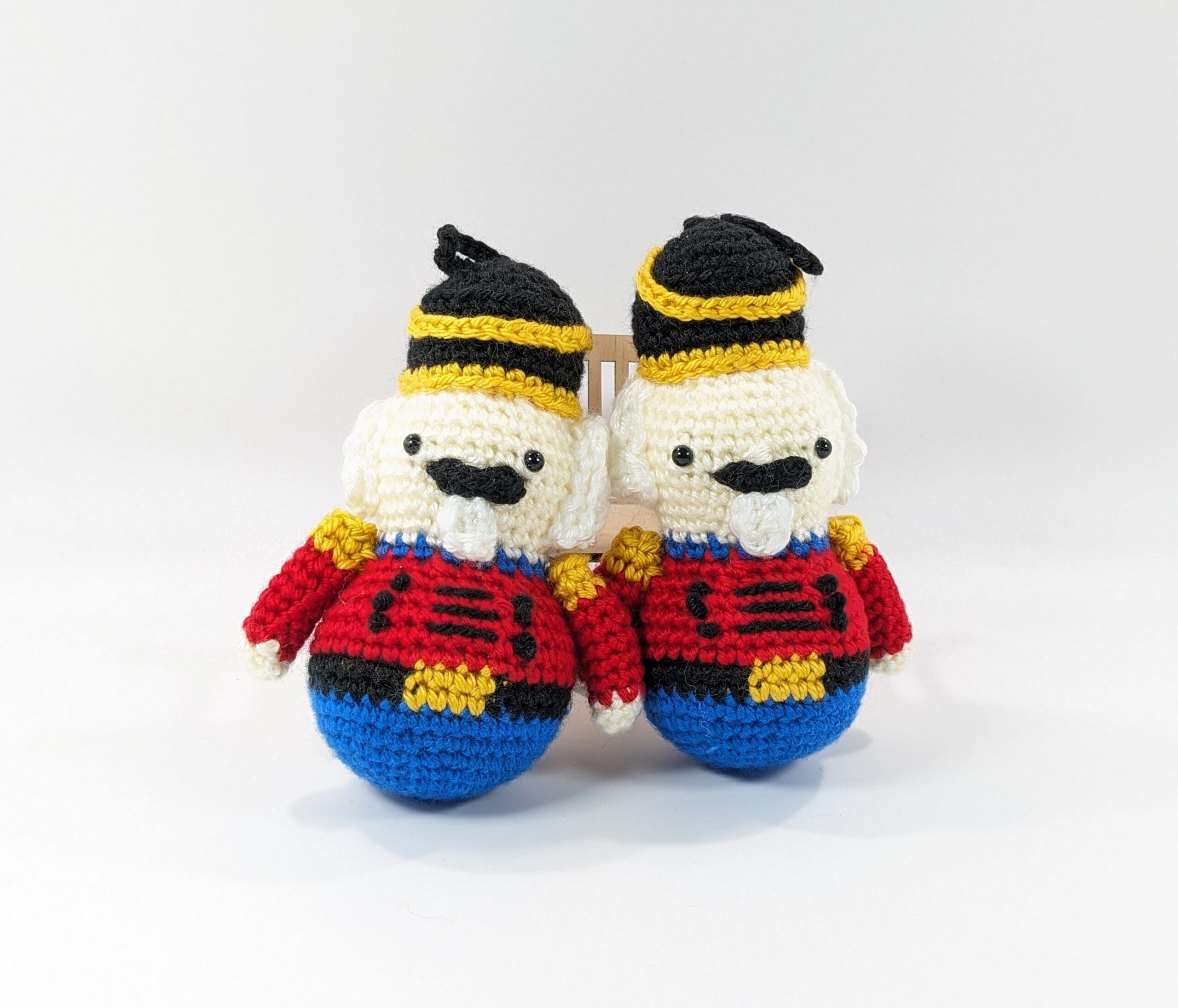 Nutcracker Tree Ornament Crochet Set. You get a set of two adorable tree ornaments. Also each Nutcracker measures around 6 inches tall. You can hang them on your tree, on a door wreath. Also you can create a fun center piece with them. You can find a selection of more fun Ornaments and holiday decor in my shop, link below.