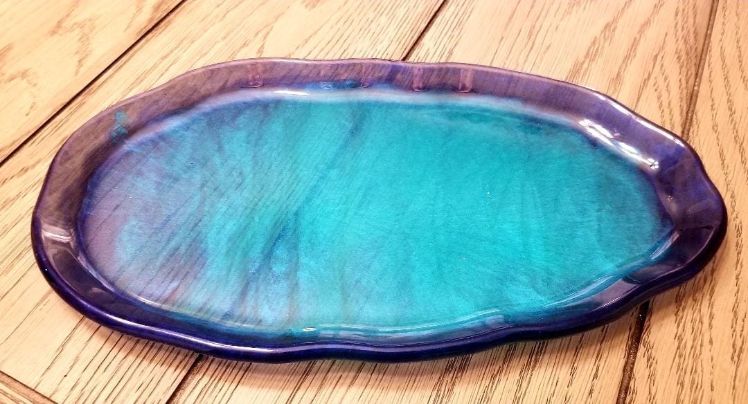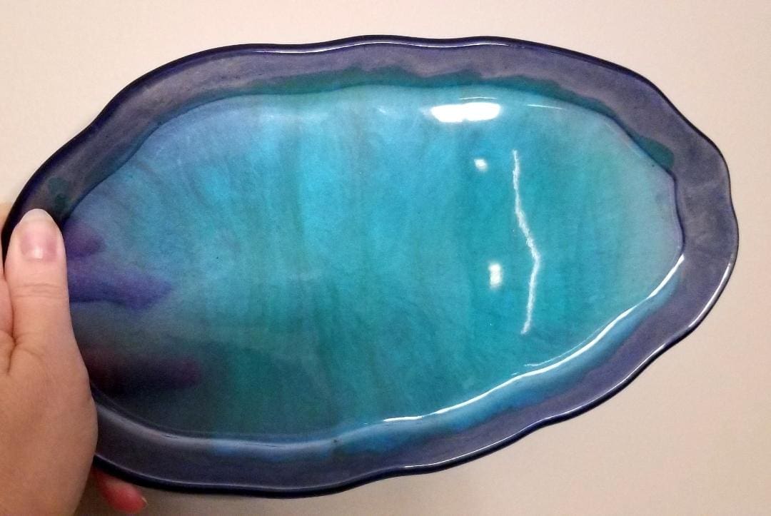 This oval platter is made of epoxy resin. The platter trim is blue, while the bottom area is of a mix of blue and green. For a combination ocean feel, with some areas looking turquoise.