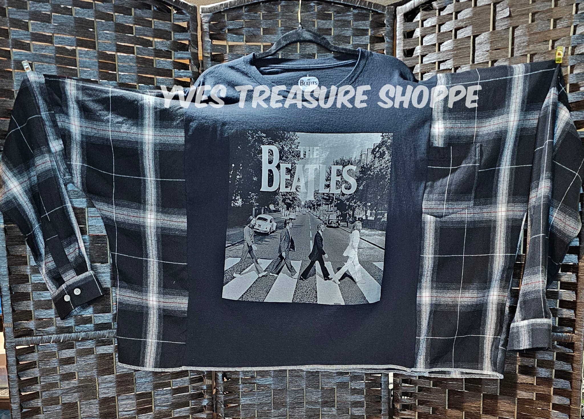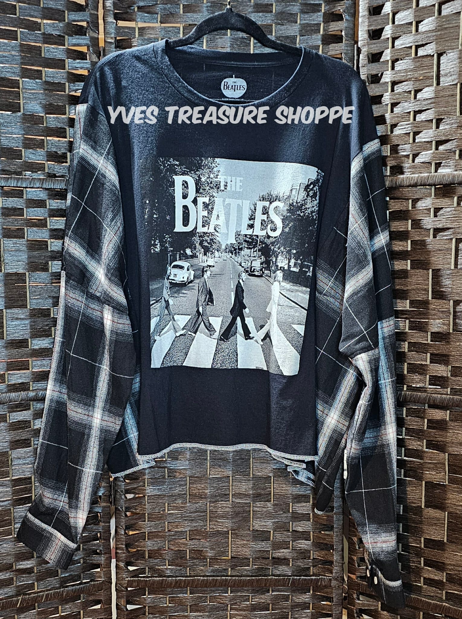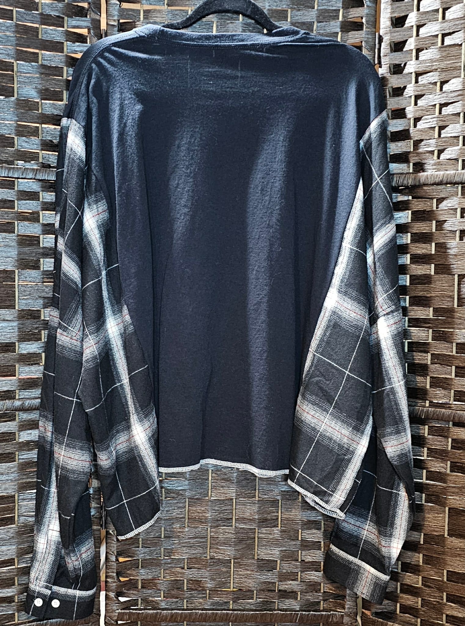 One Size. This is a reworked 2X large t-shirt and Upcycled flannel shirt. 33 inches across pit to pit. 25.5 inches long from top of shoulder to bottom of shirt. OOAK. Perfect for making that fashion statement.