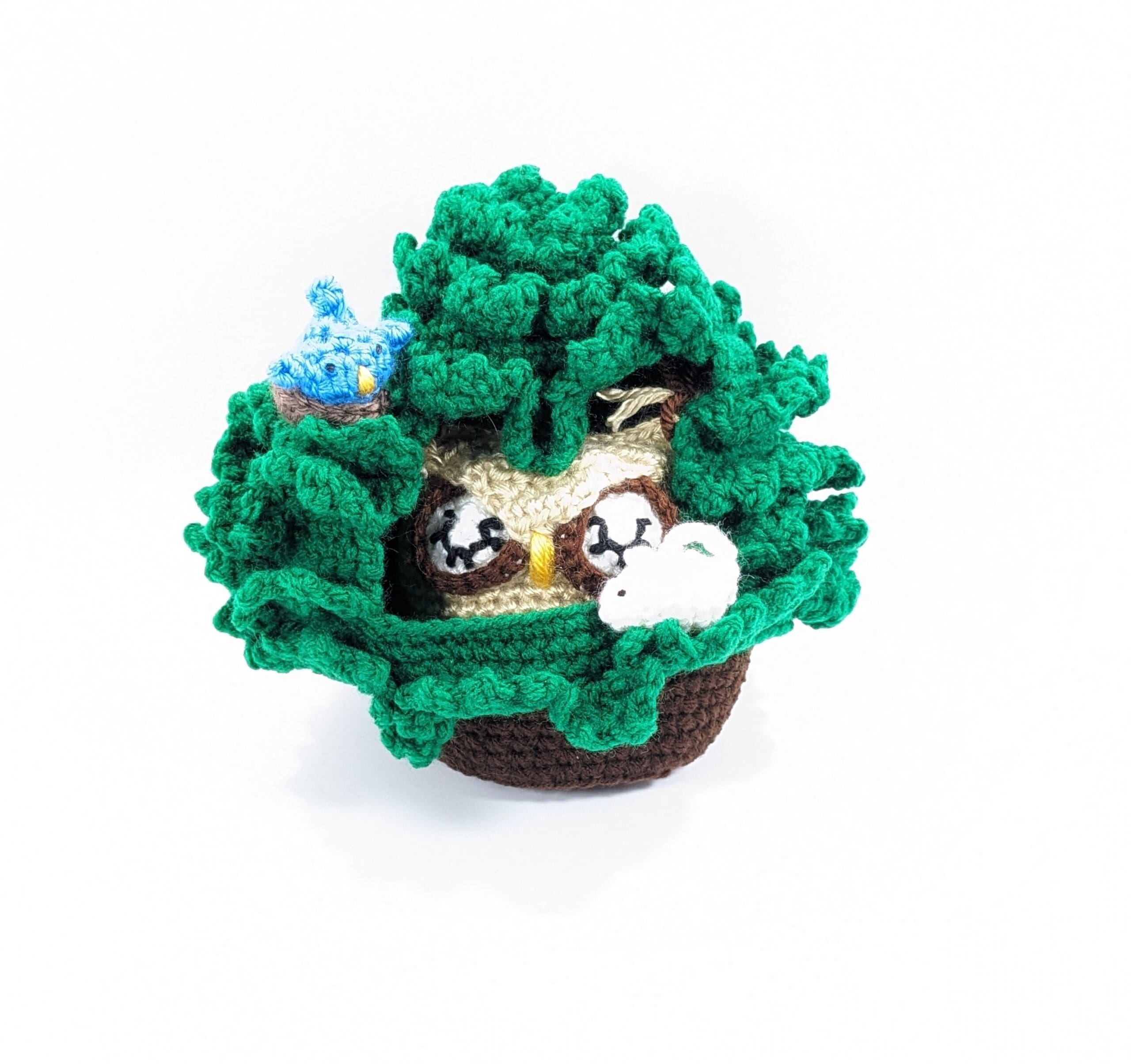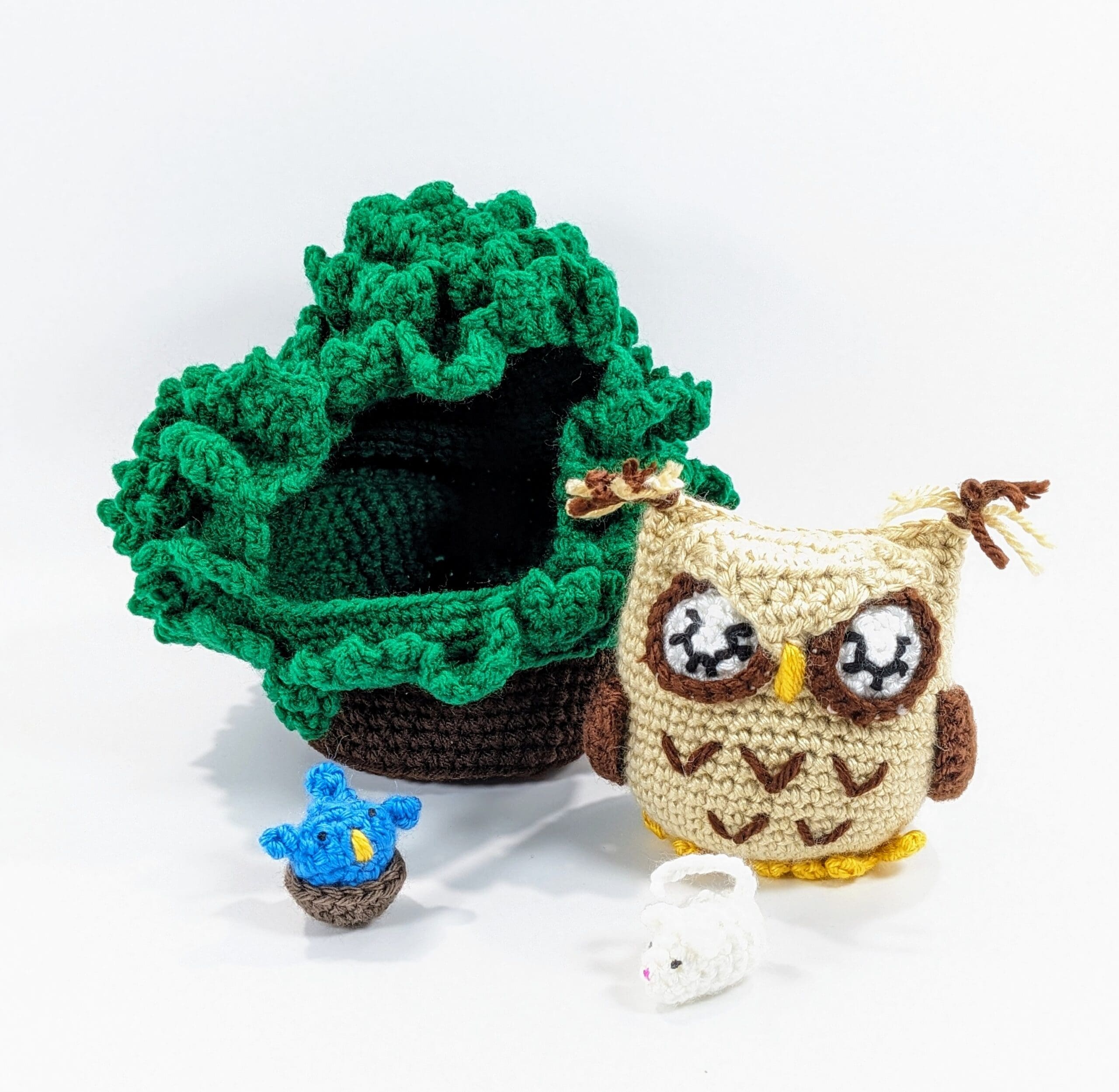 Owl Treehouse Crochet Play Set. You will love this adorable Owl with his pals Little Mouse and Baby Bird. Also so much fun for toddlers and older children. Your playset is all plush hand crochet items. Also making this great for young children to play with. Your tree measures 6 1/2″ tall, the owl is 5″ tall and the mouse and bird 1 1/2″