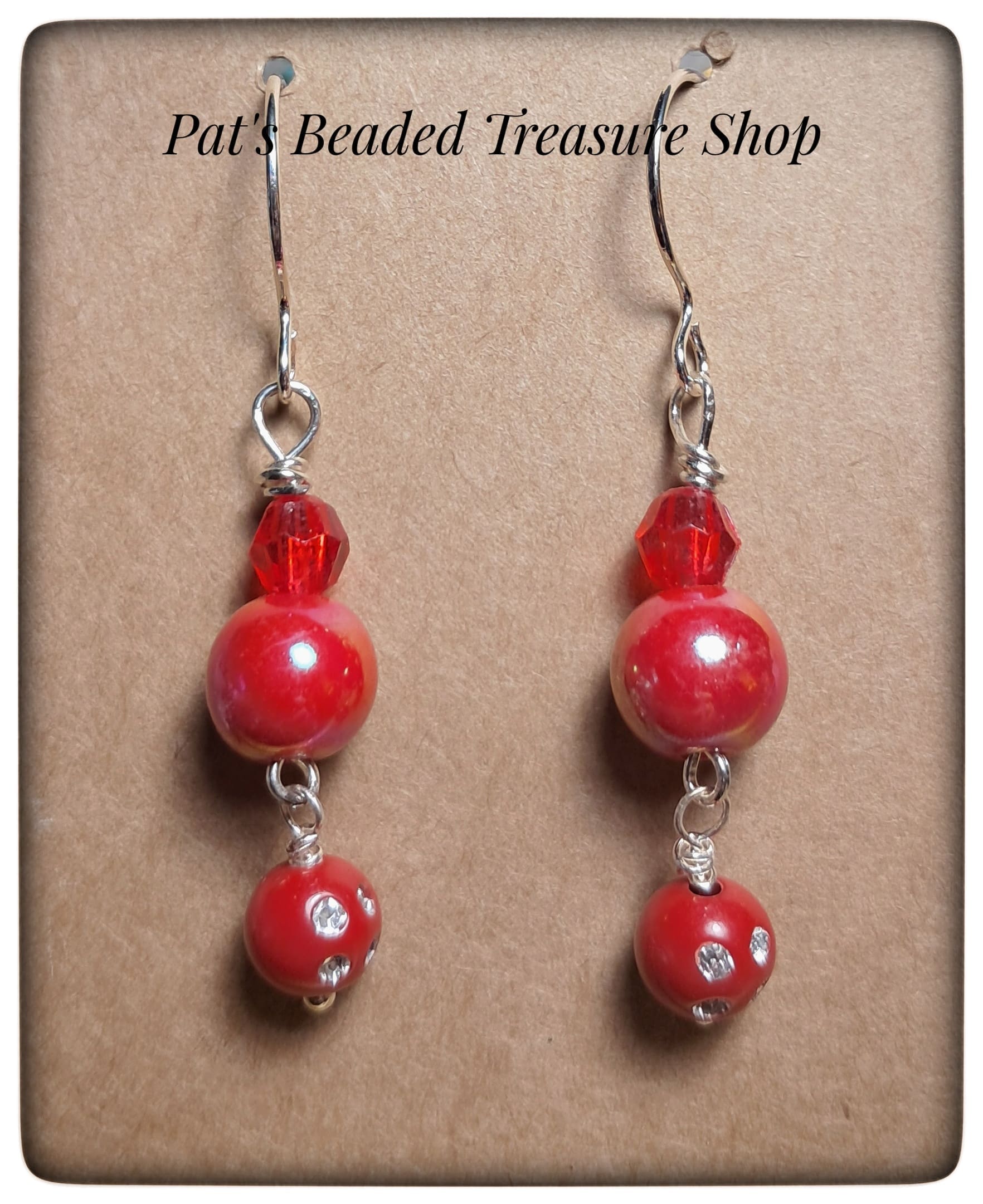 Bright and playful, these red dangle earrings feature a mix of glossy pearls, sparkling crystals, and rhinestone-accented beads. Finished with silver plated wires for a clean, polished look that adds a cheerful pop of color to any outfit.