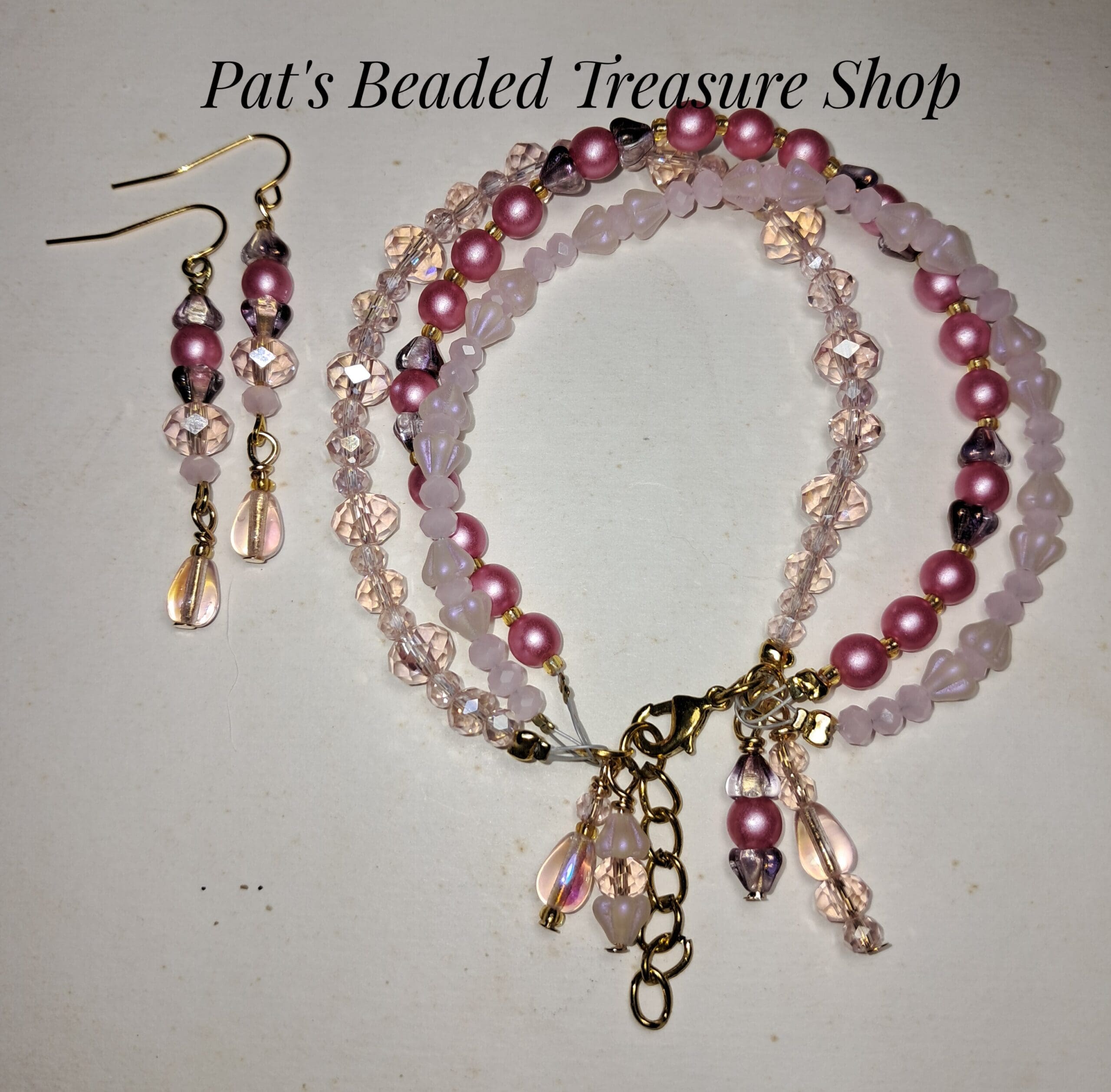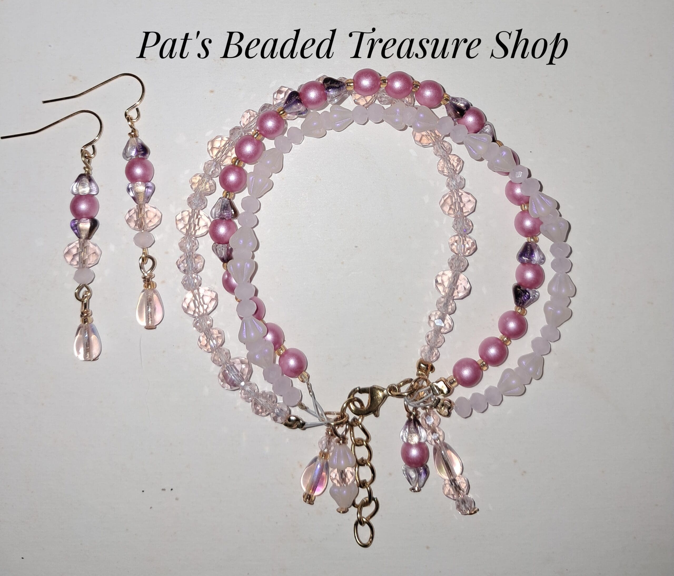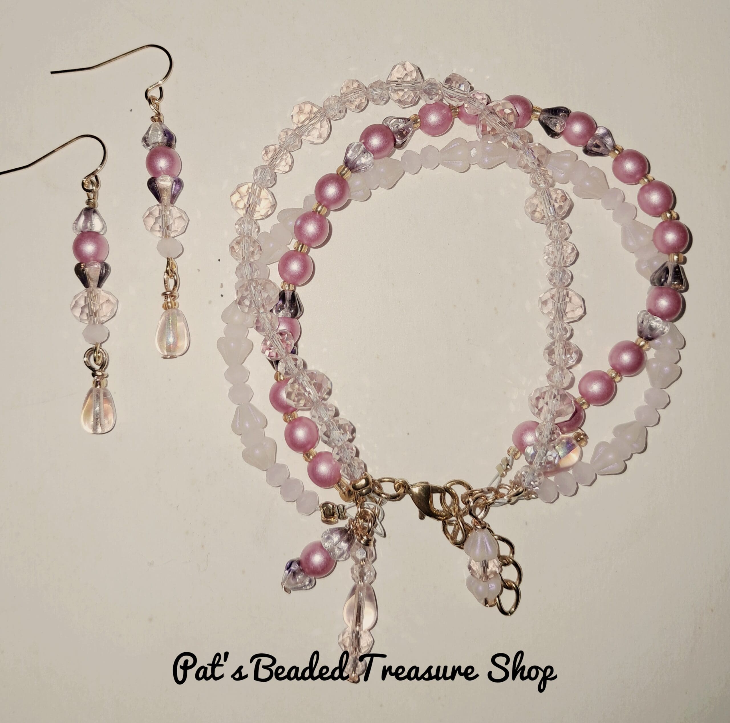 This handcrafted jewelry set features a beautifully coordinated bracelet and matching dangle earrings in soft pink and blush tones. Faceted crystal beads add sparkle, while pearl-finish rounds and delicate accent beads create a romantic, feminine look.