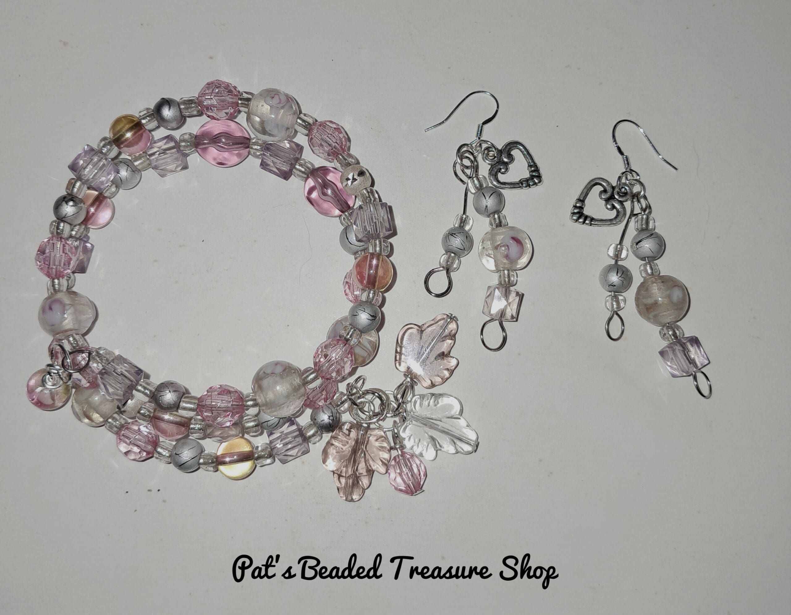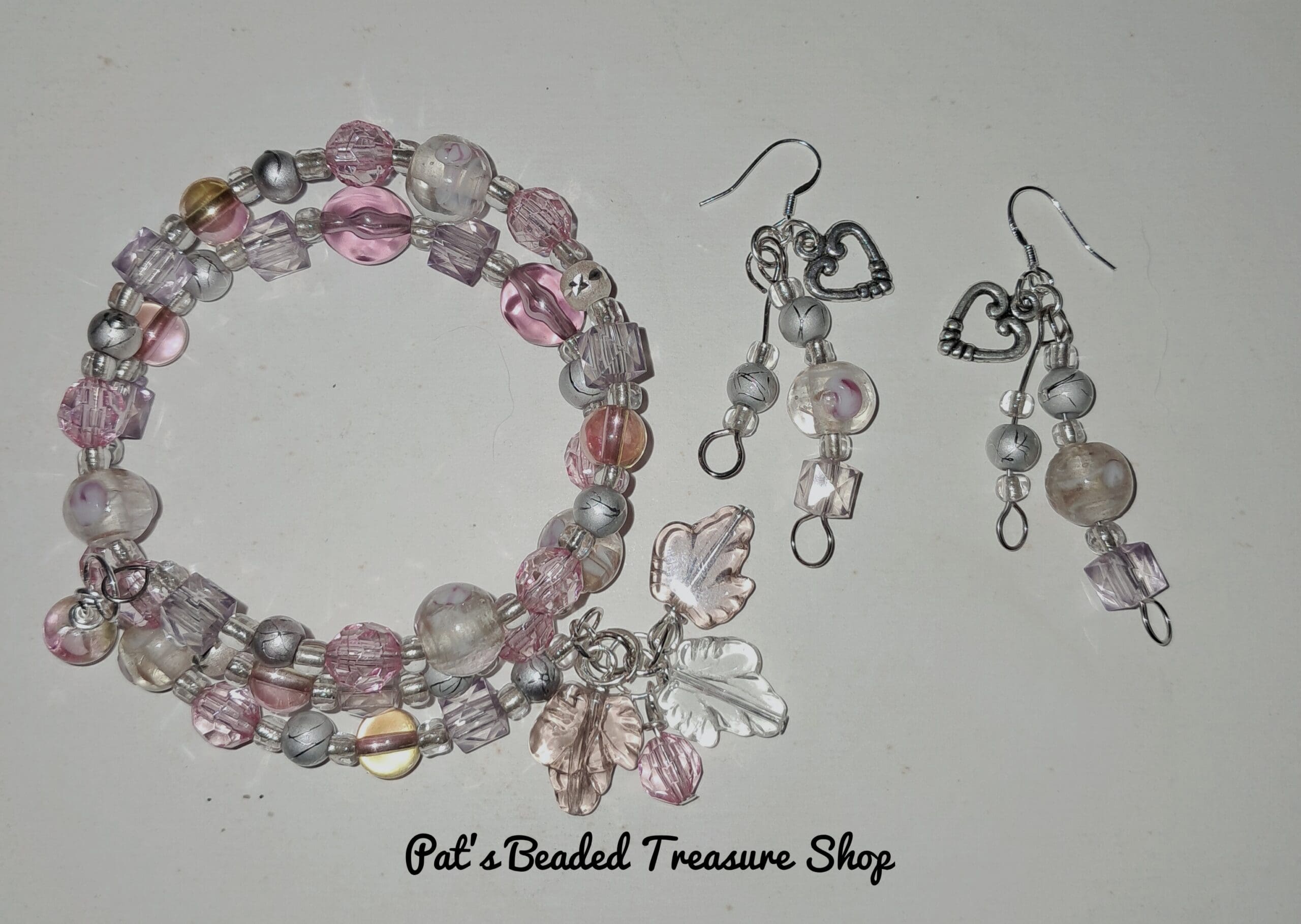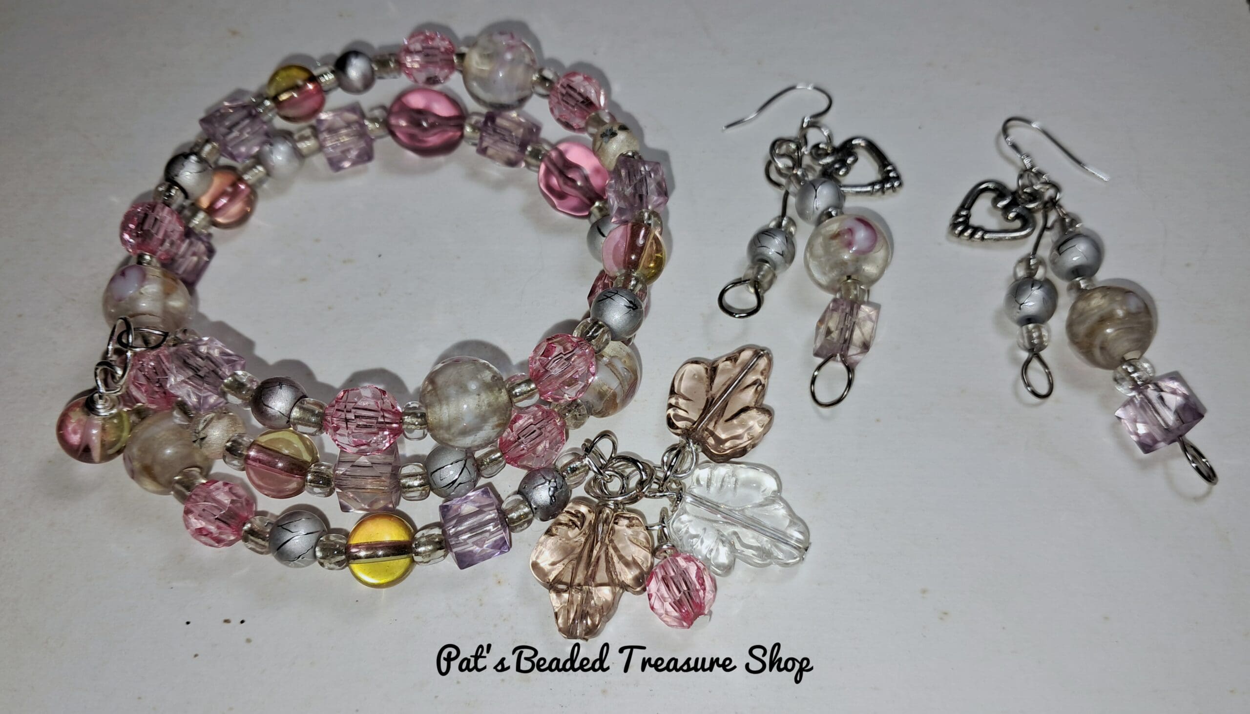 Pink Glass Memory Wire Bracelet with Leaf Charm and Matching Earrings