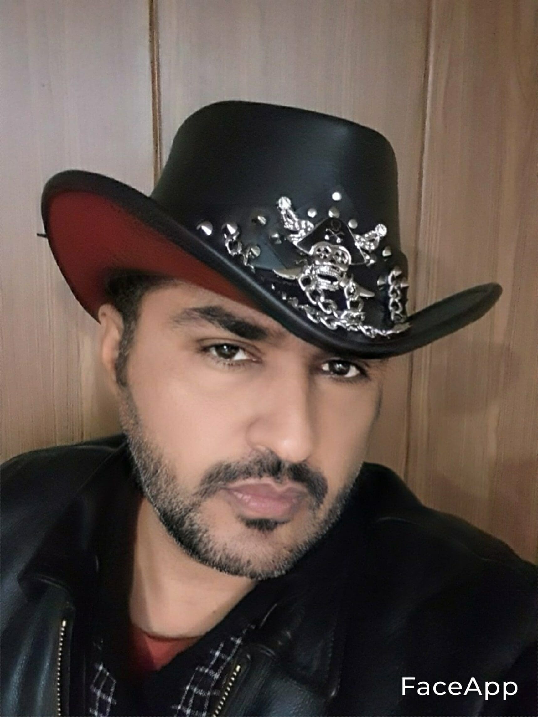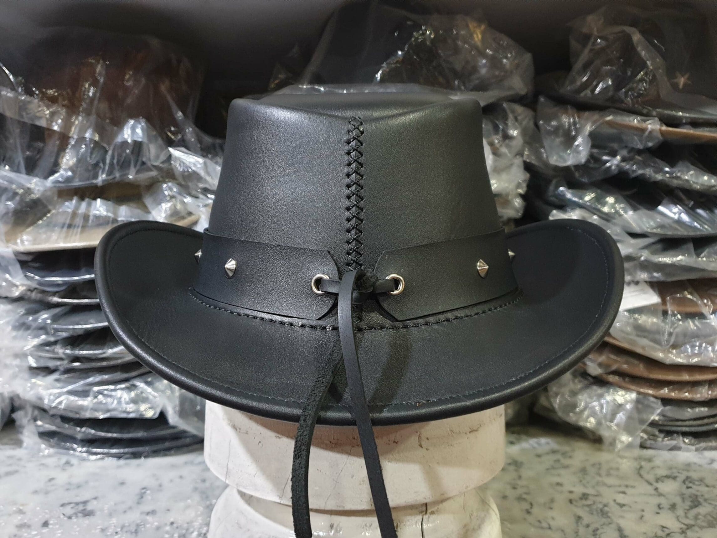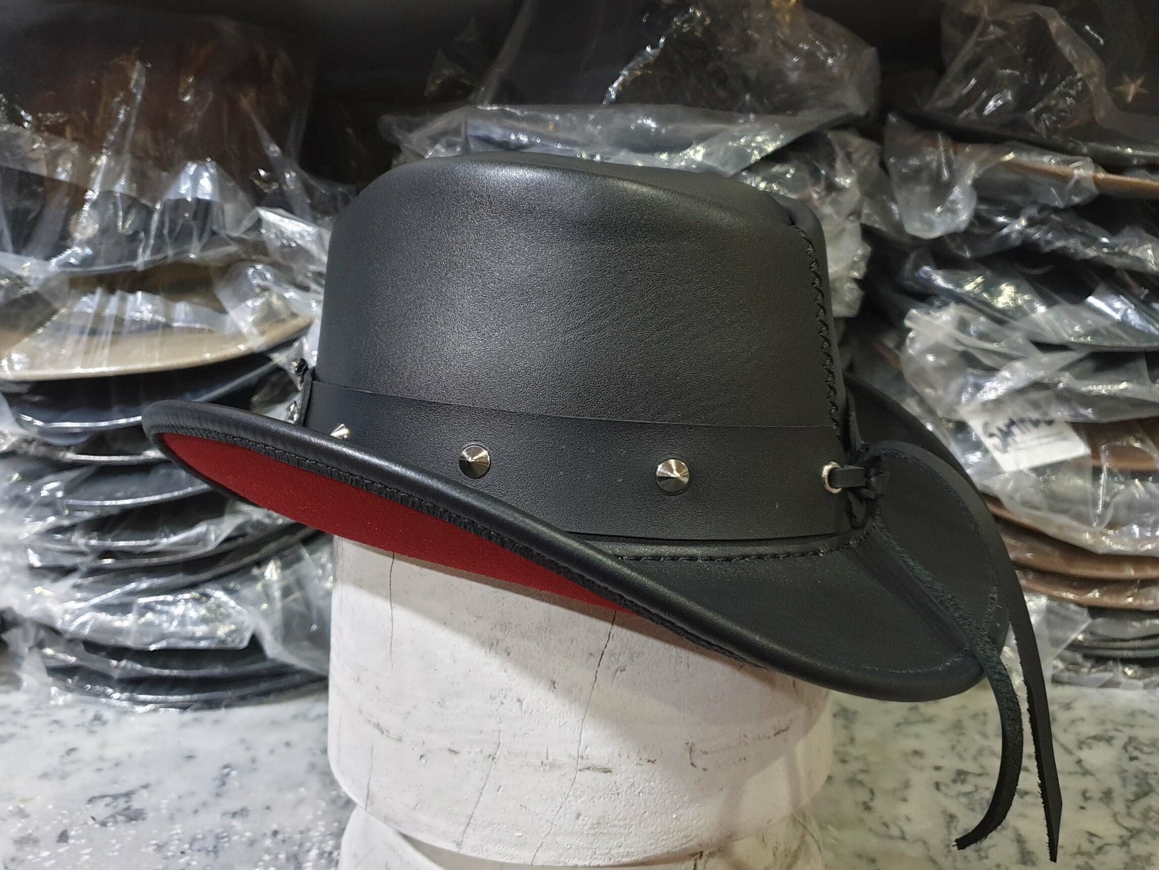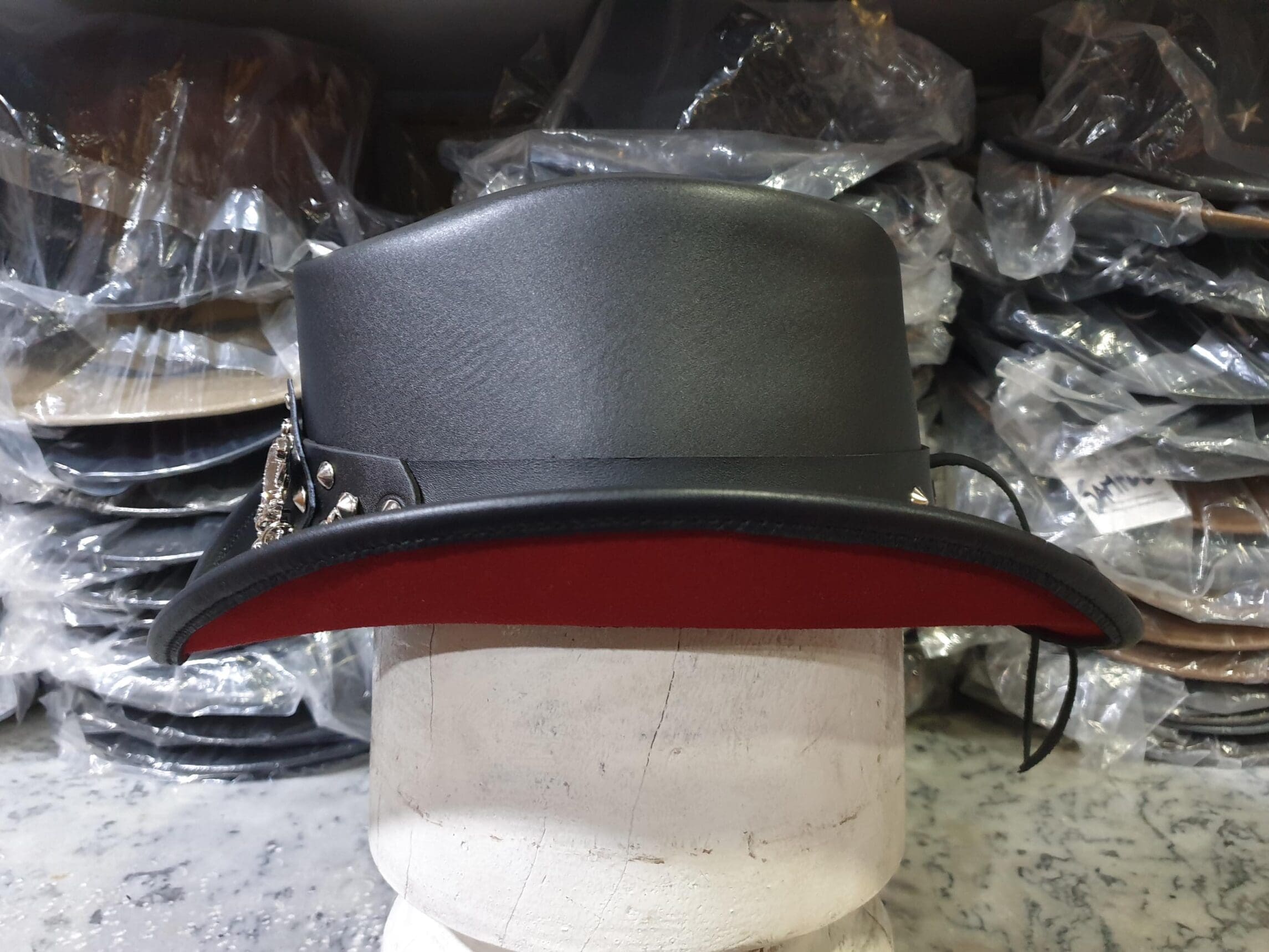 This one-of-a-kind hat is crafted from high-quality black leather, providing a rugged yet refined look that stands out in any crowd.
