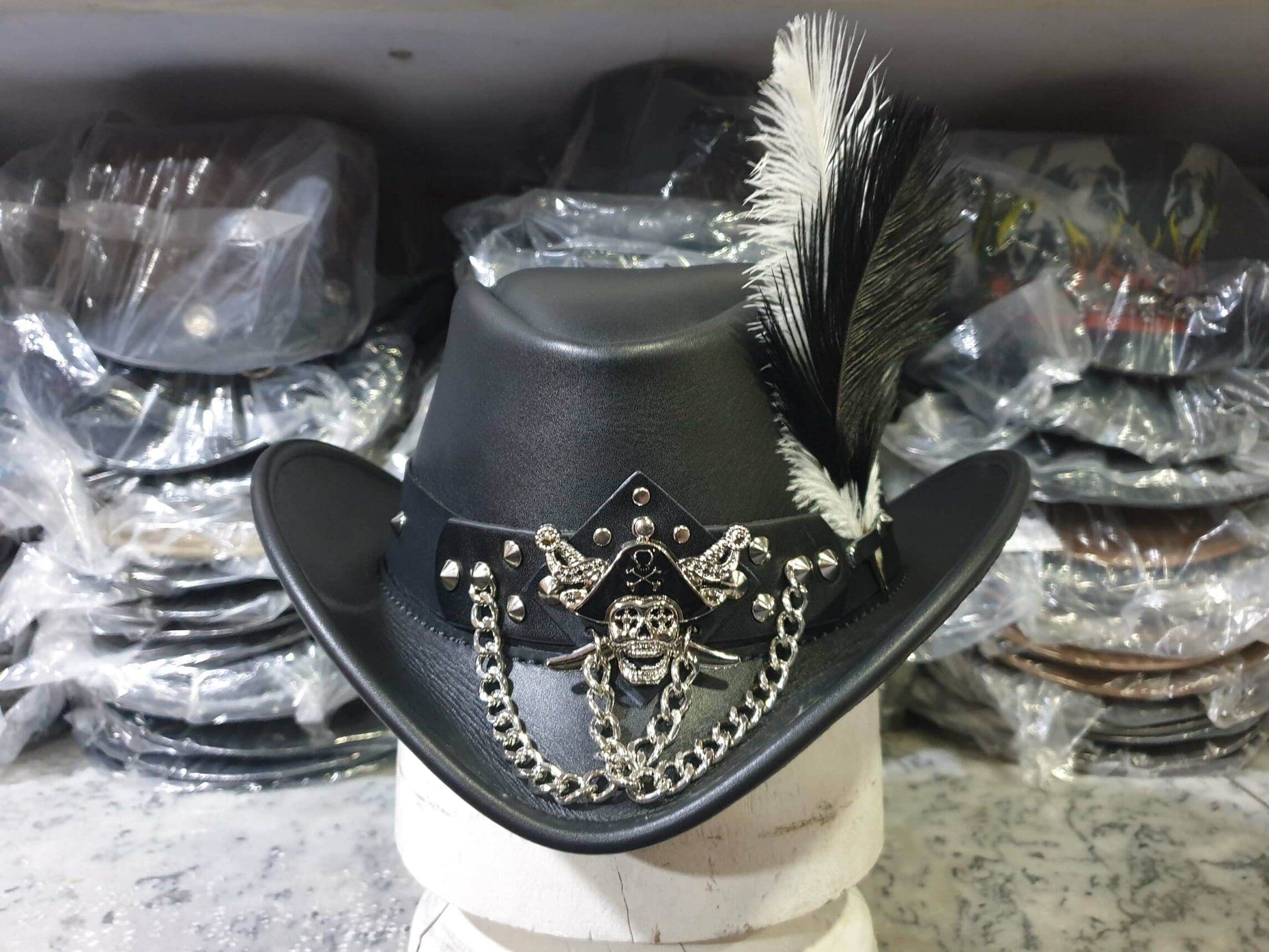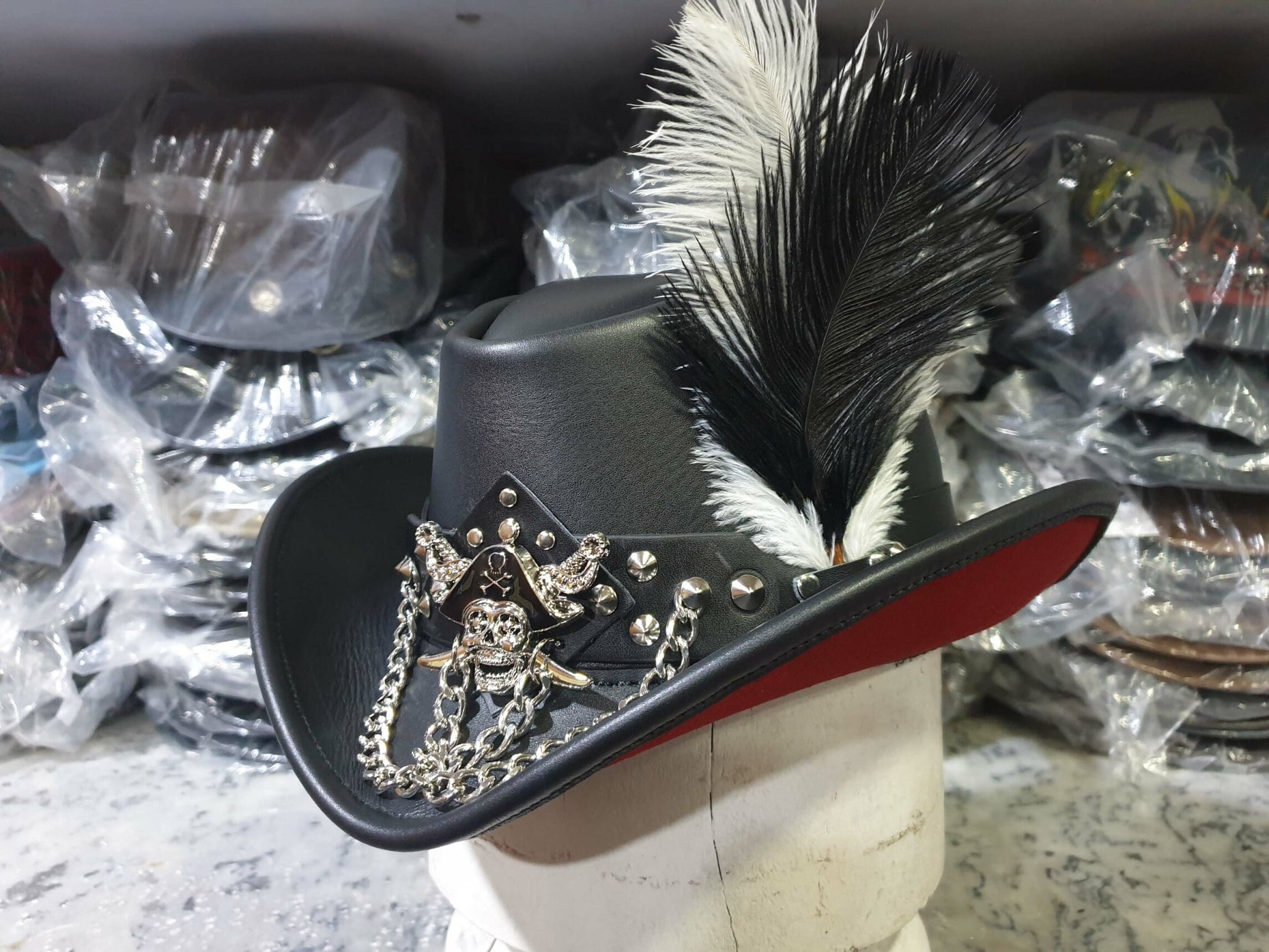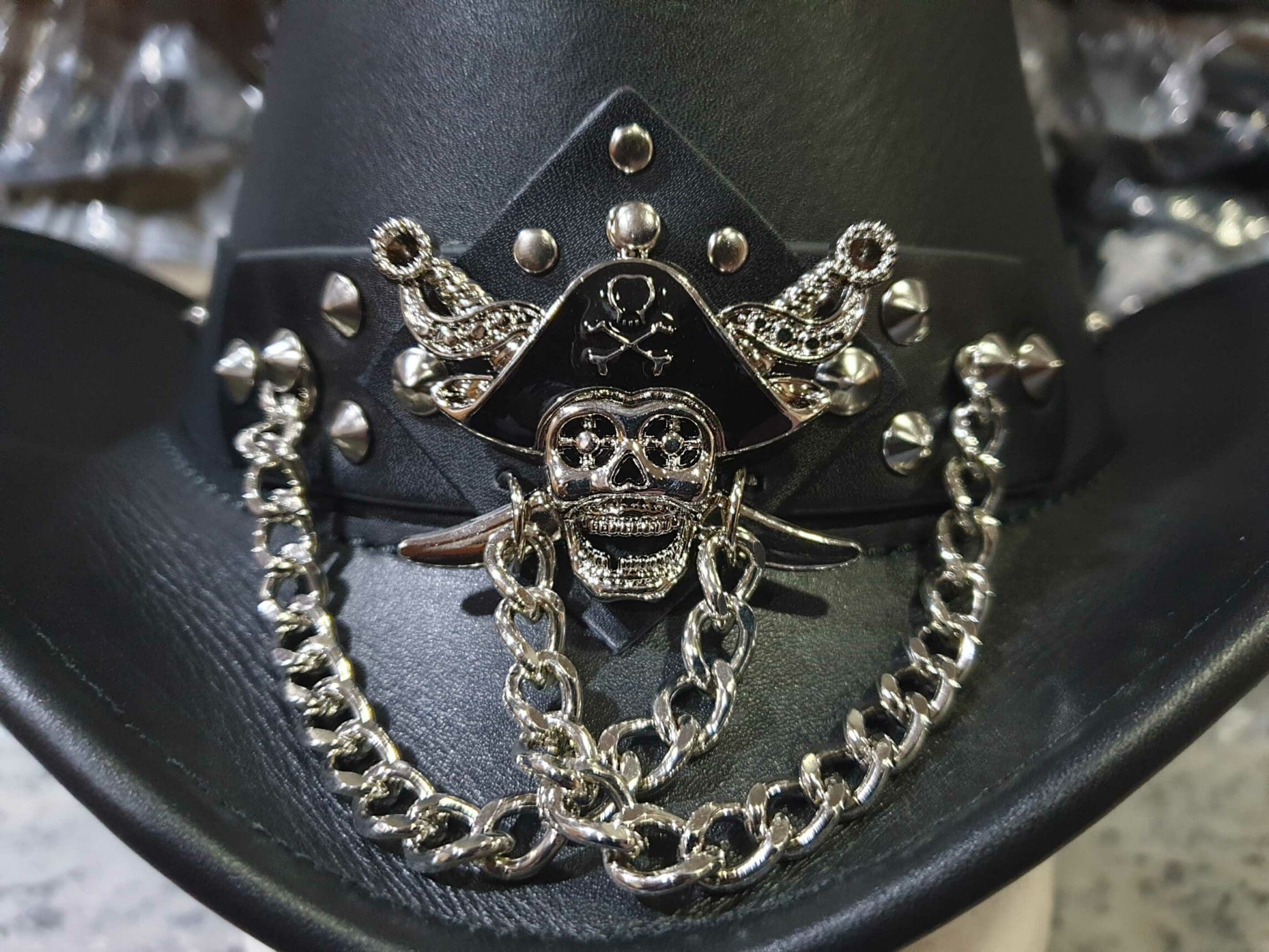 Introducing the Steampunk Gothic Pirate Black Leather Hat, a captivating fusion of vintage elegance and rebellious pirate flair.