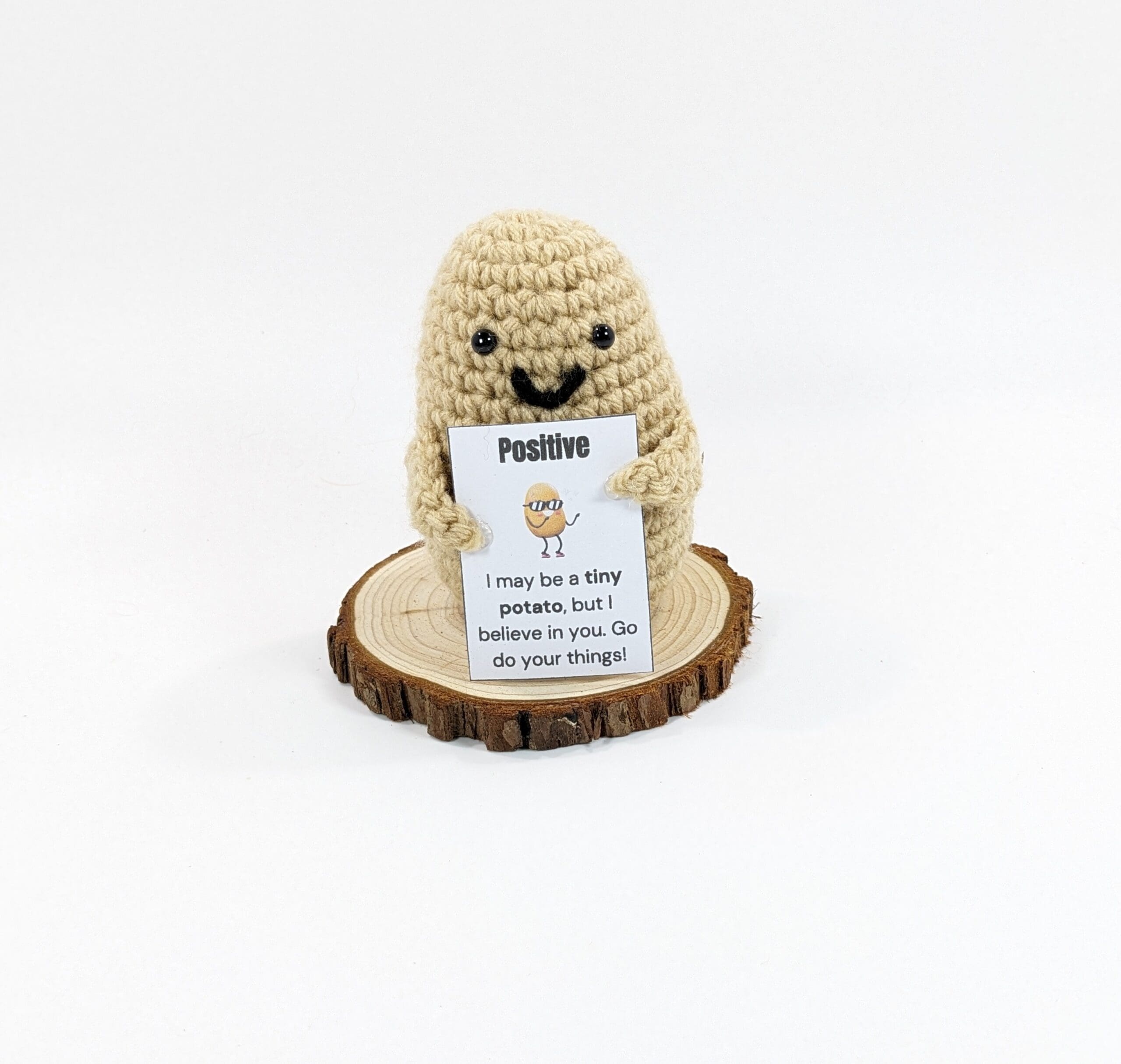 Also Each Positive Potato Crochet Decor Gift is crochet with acrylic yarn and filled with polyfil. He is attached to a 4 inch slice of wood and holds his Positive sign.