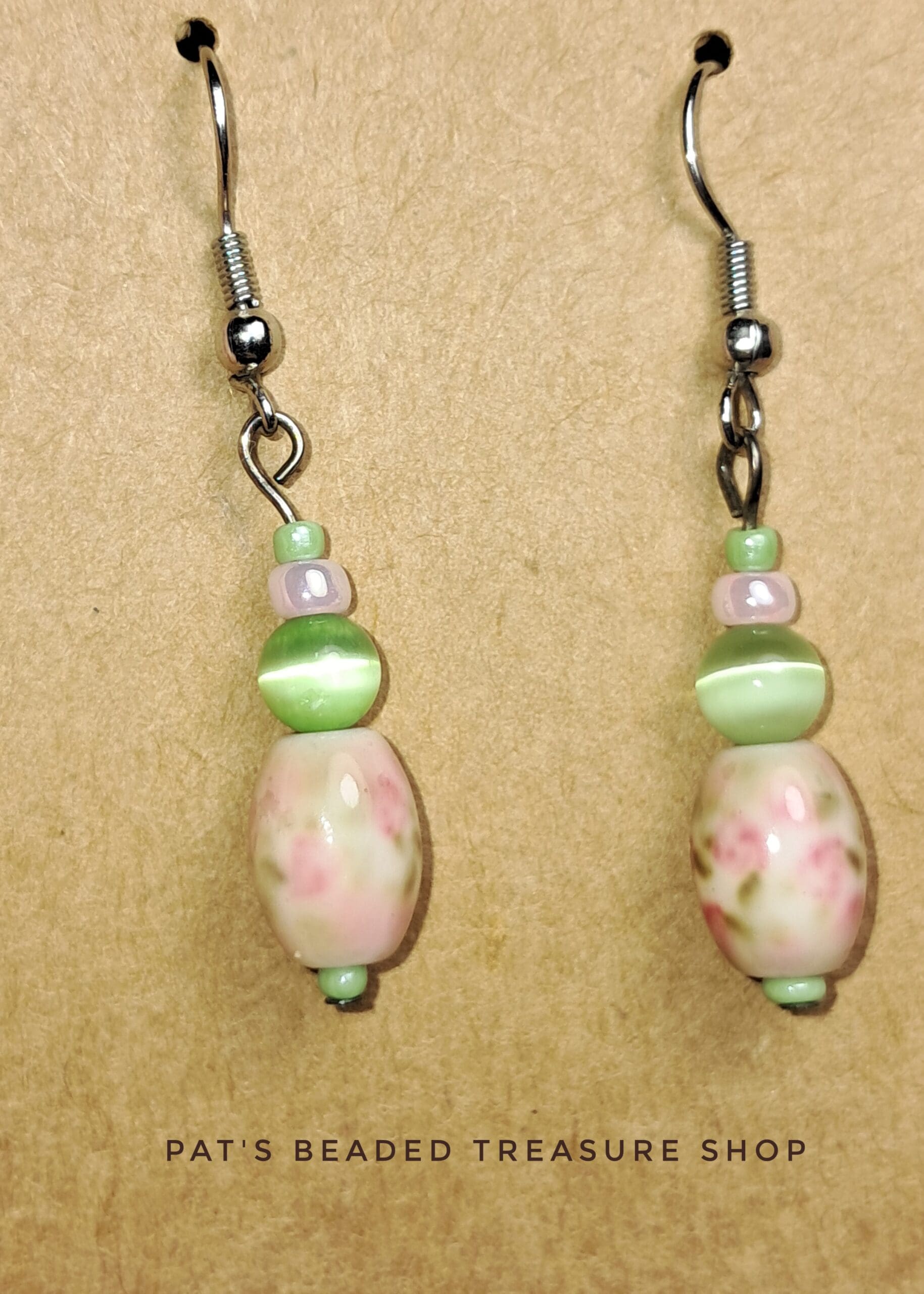 Earrings feature a pale pink bead with a floral pattern and a green cat’s eye bead on a silver fishhook earwires.
