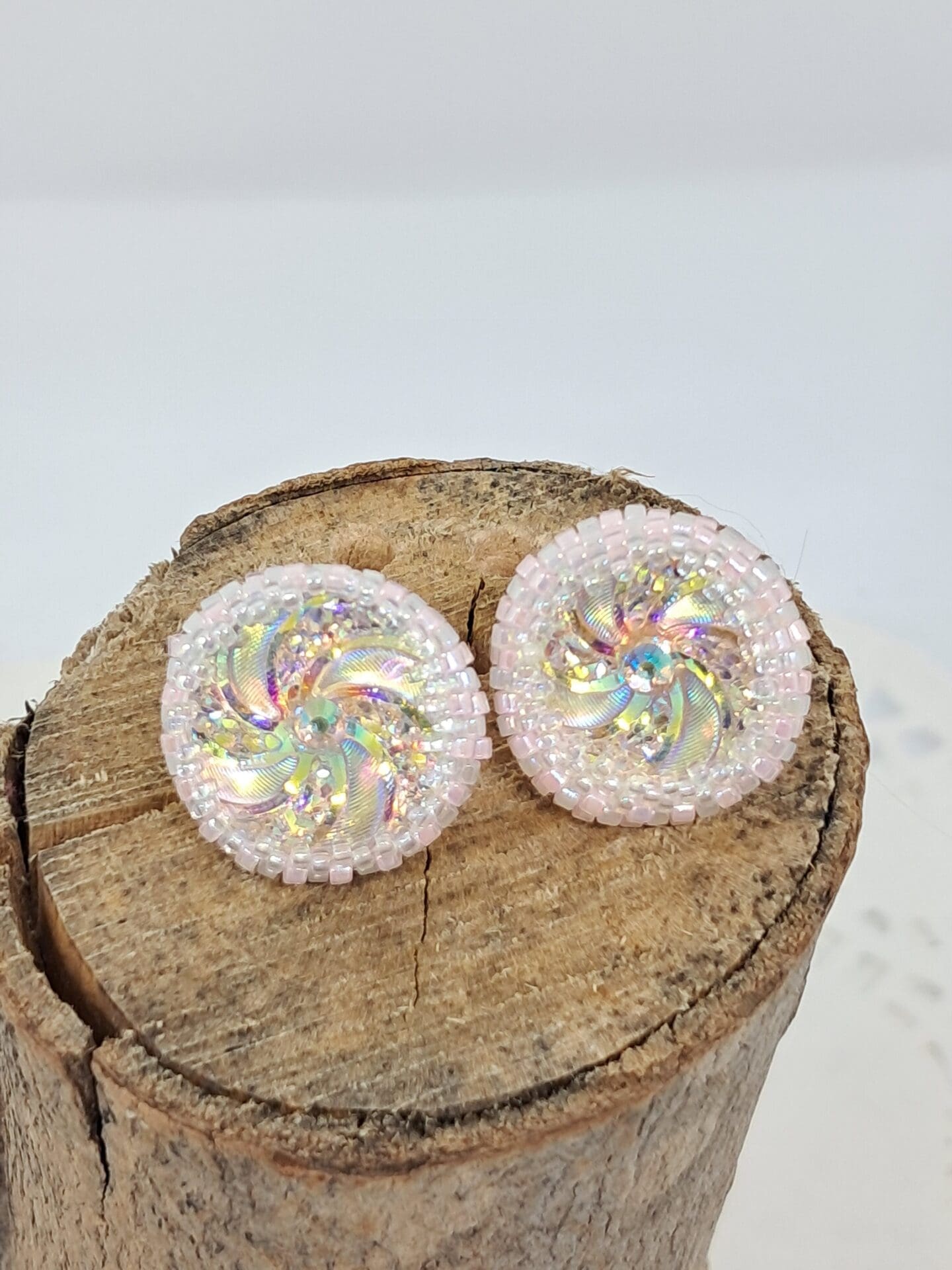 A pair of hand-beaded stud earrings. These earrings are round with a clear iridescent beads.