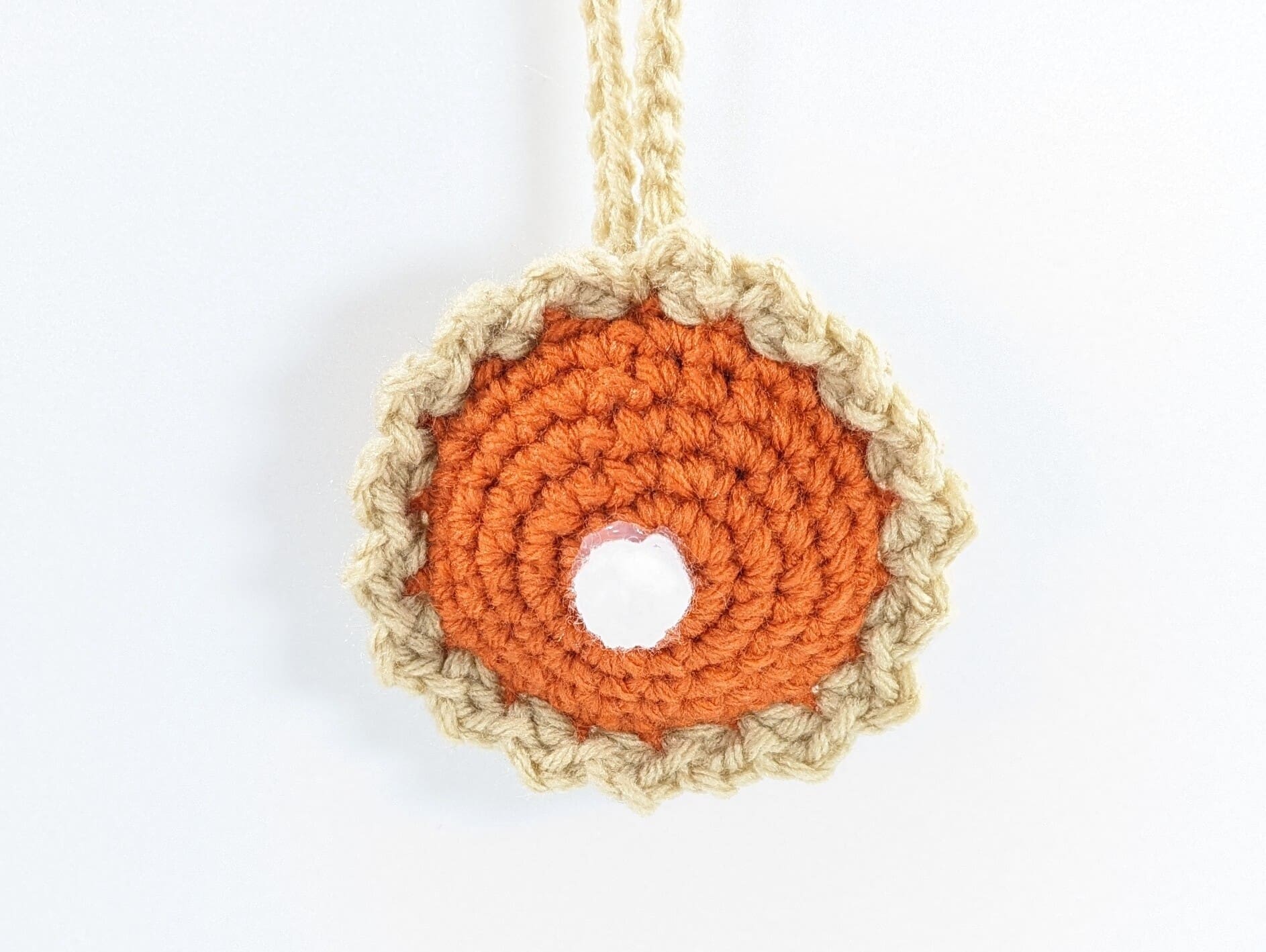 Also this cute Pumpkin Pie Plush Car Decor is crochet with acrylic yarn and filled with a small amount of fiberfill. His mouth and eyes are made of felt and glued on.