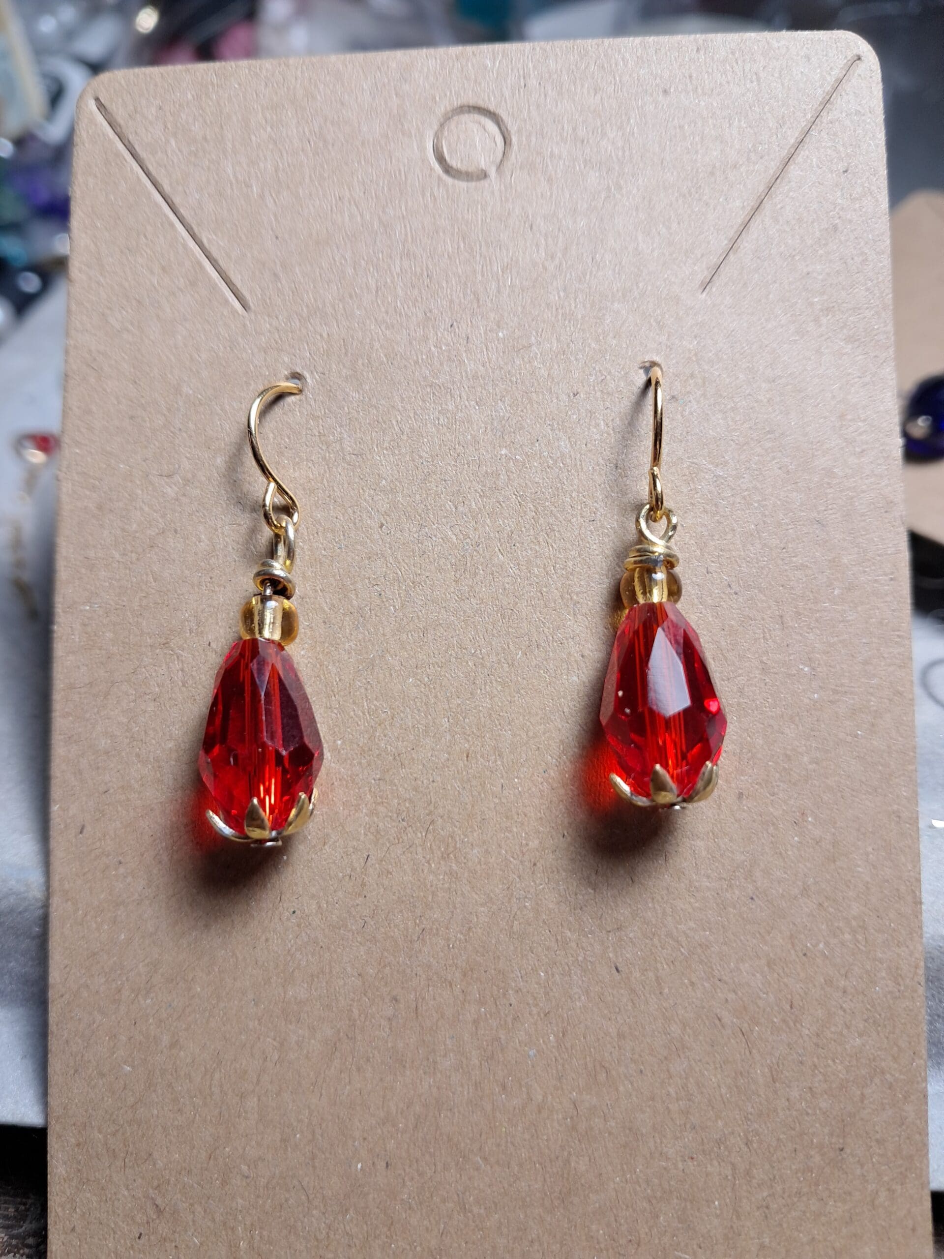 These handmade earrings feature stunning faceted red teardrop crystals that shimmer with every movement. The rich, vibrant red is beautifully paired with gold-plated ear wires and a small gold accent bead, creating a warm, elegant finish.