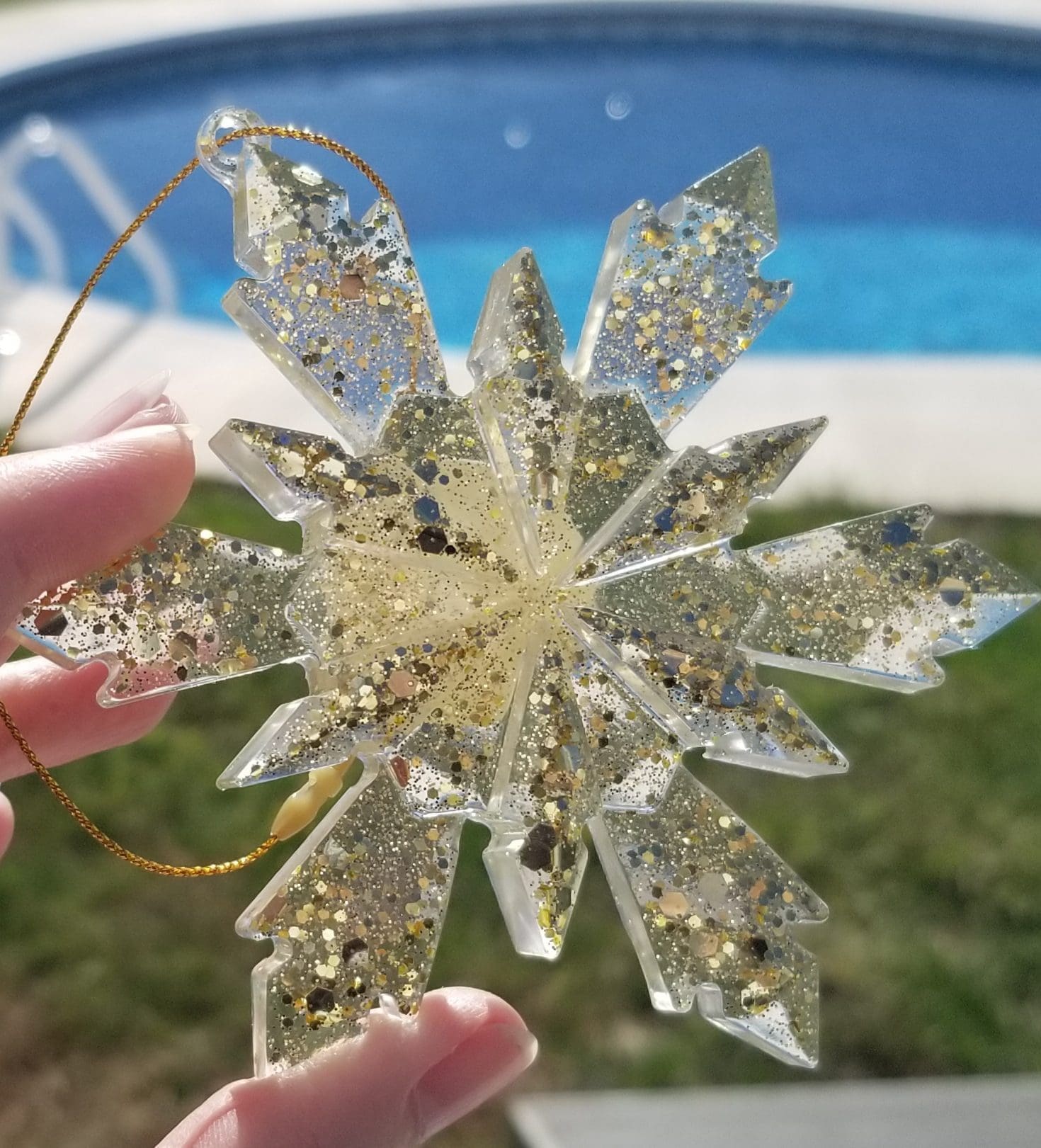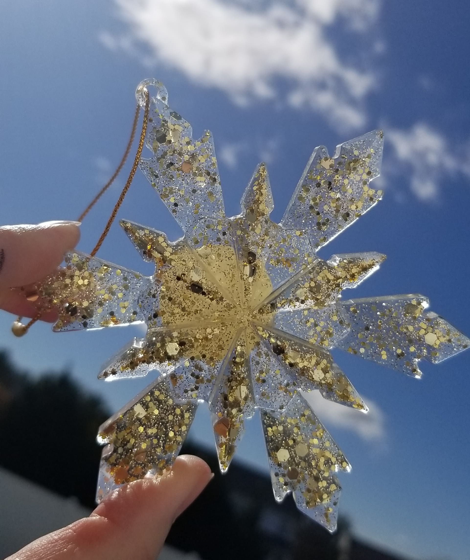 Perfect for both traditional and modern décor themes, this Gold Glitter Resin Snowflake Ornament is sure to become a cherished heirloom, bringing joy and sparkle to your holiday celebrations for years to come.