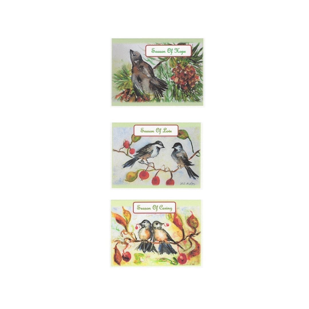 LIMITED STOCK ON CLEARANCE! This card is under a folded half-sheet in size. These cards are lightweight, with a pebbled matte finish, printed on 100 percent cotton paper. Experience the beauty of nature with our Retro Season of 3 Watercolor Nature Art Greeting Card Set. These cards will inspire and delight, featuring stunning nature watercolor artwork of Pine Cones, Chickadees, and Sparrows in the garden. Perfect for sending heartfelt messages to your loved ones. Share the joy of nature with your friends and family through this six-card set! Sayings include Season of Hope / Season of Love / Season of Caring
