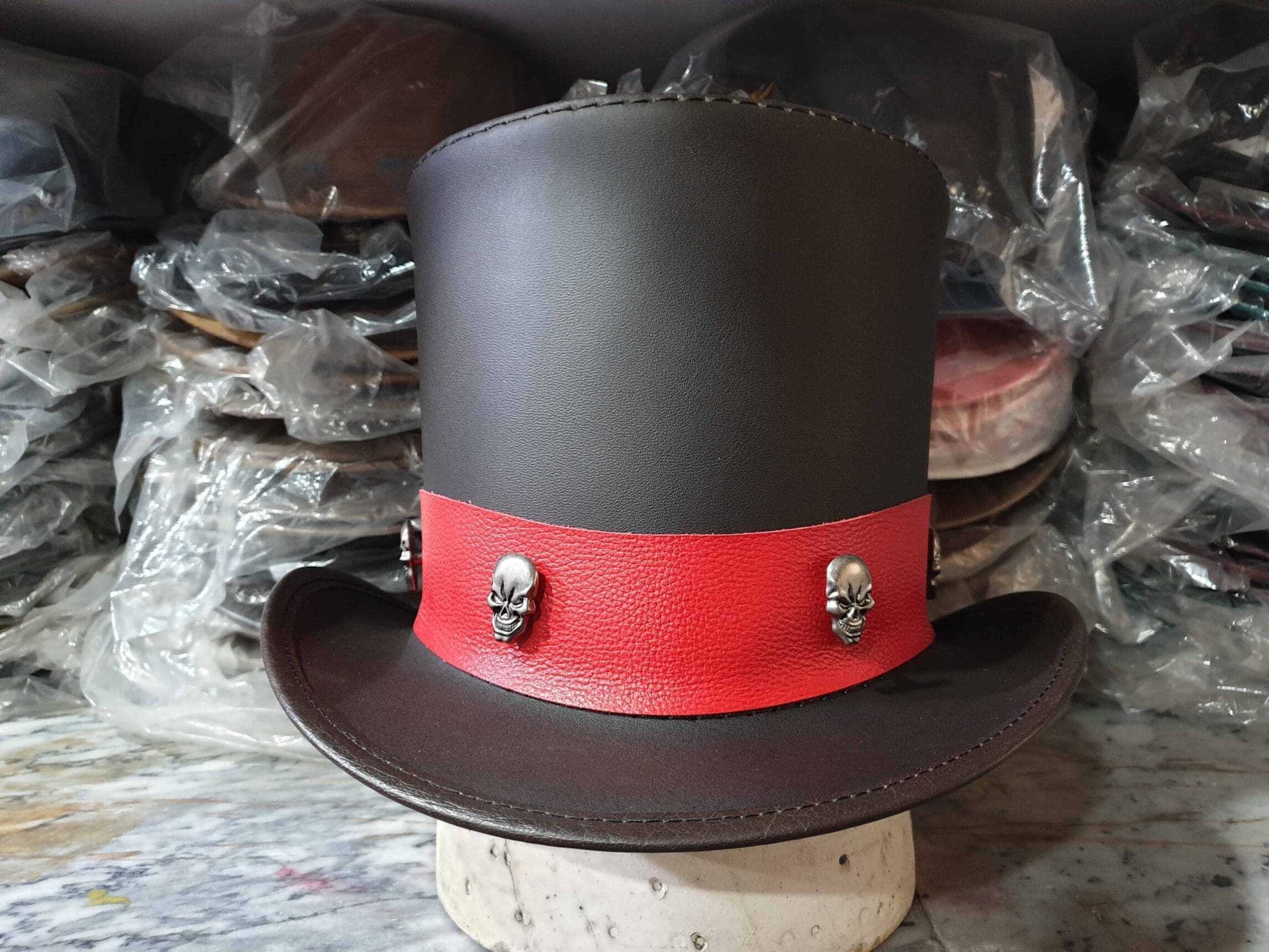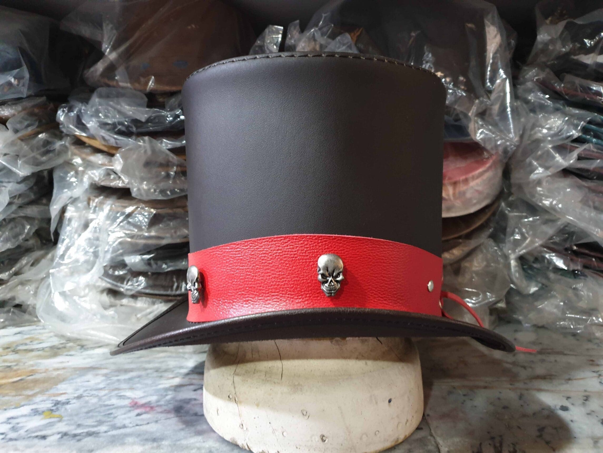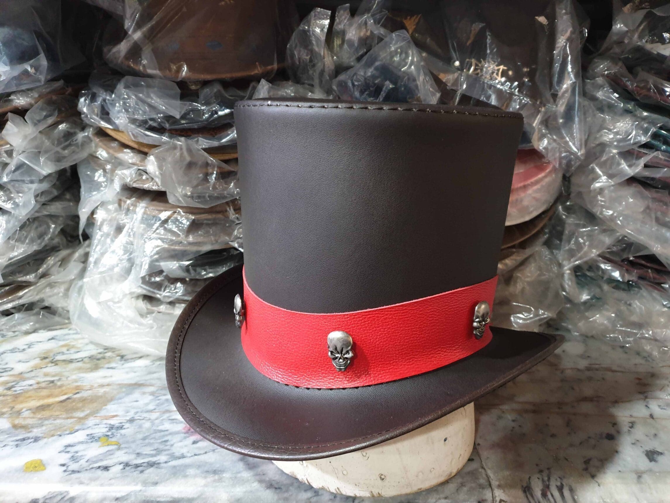 The Ringmaster Brown Leather Top Hat with Metal Skull Rivets on a Red Leather Hat Band is a bold and striking accessory, perfect for those who appreciate a blend of classic style with a touch of edgy, gothic flair. Here’s a detailed description:
