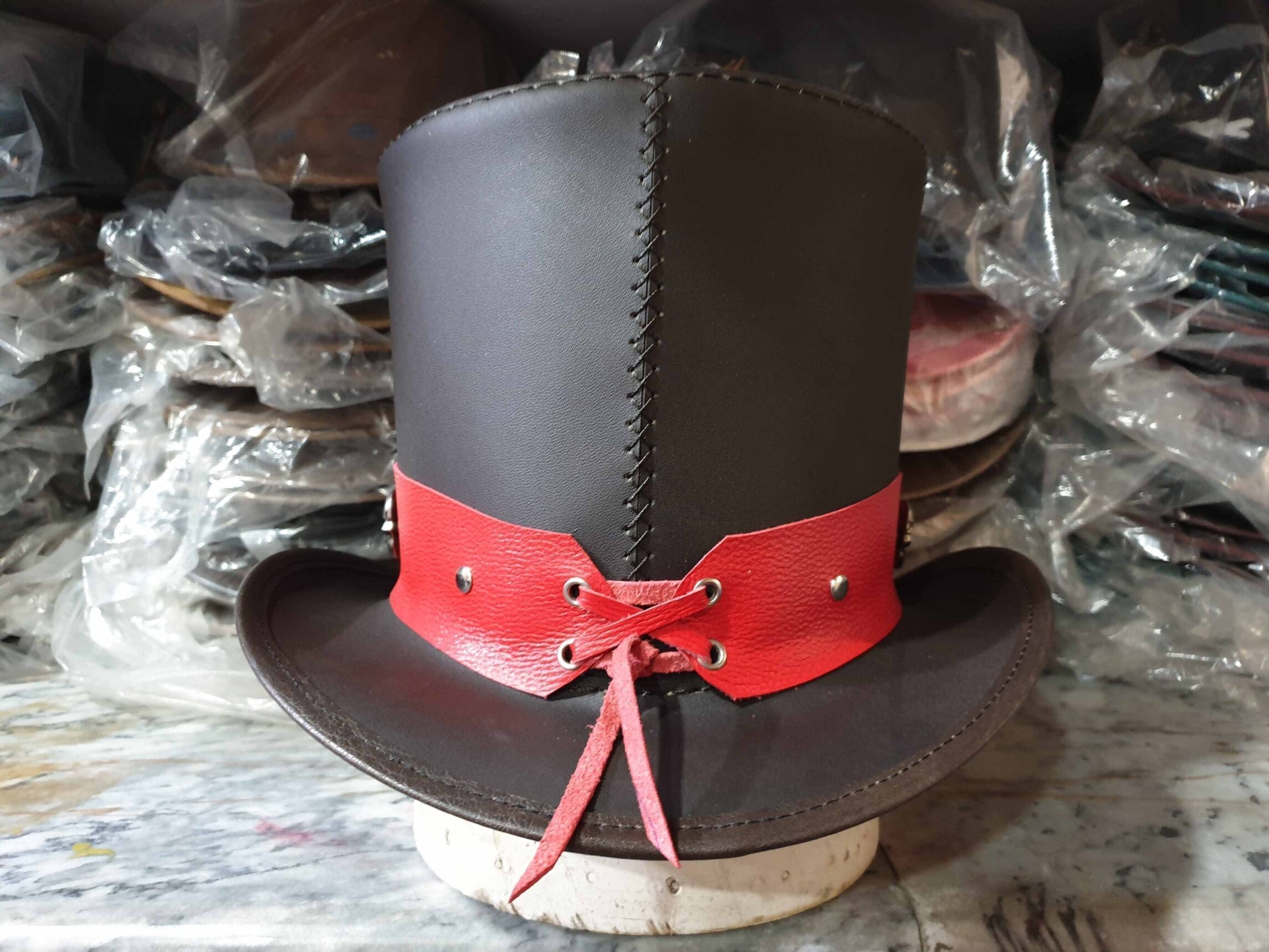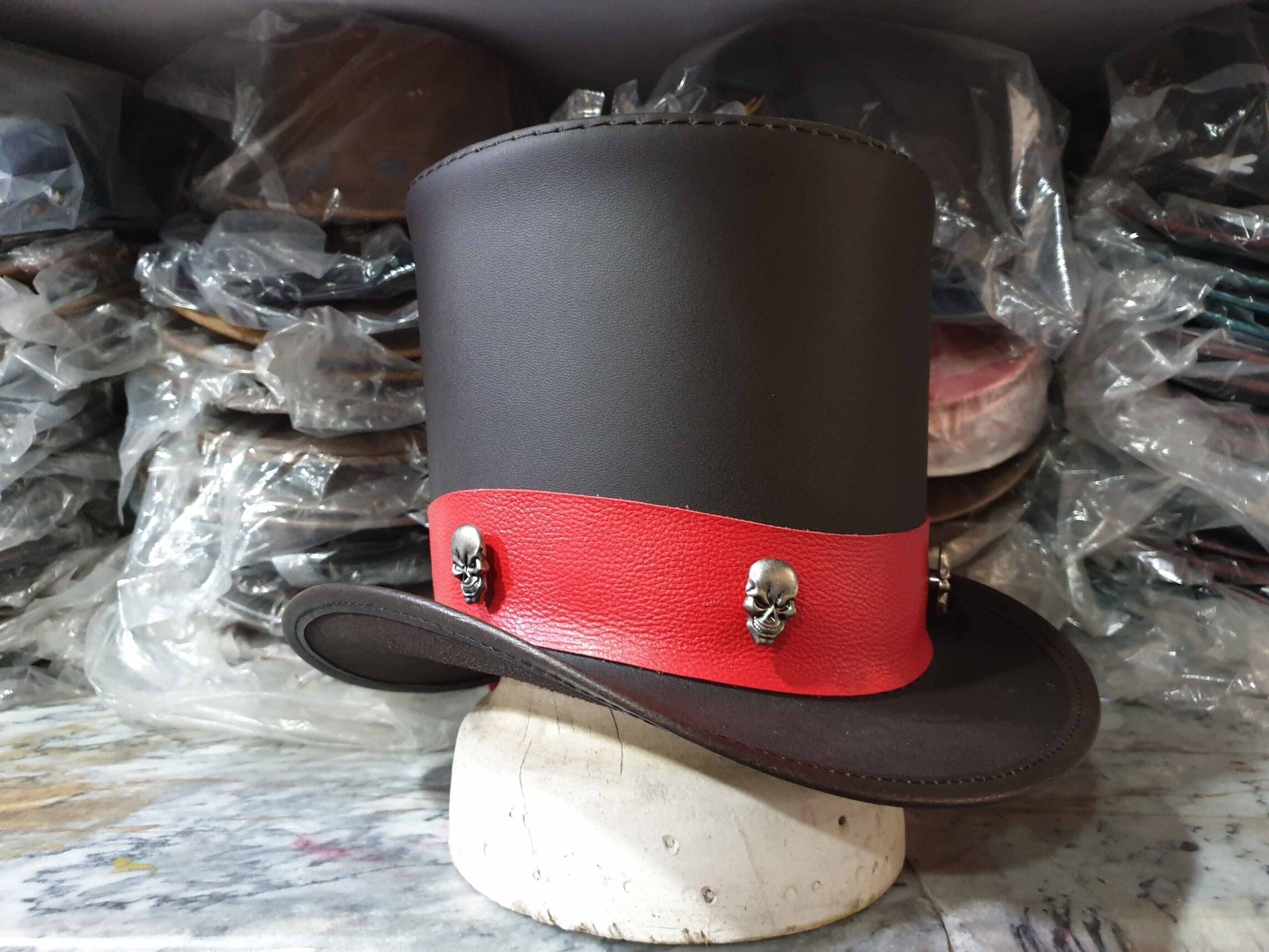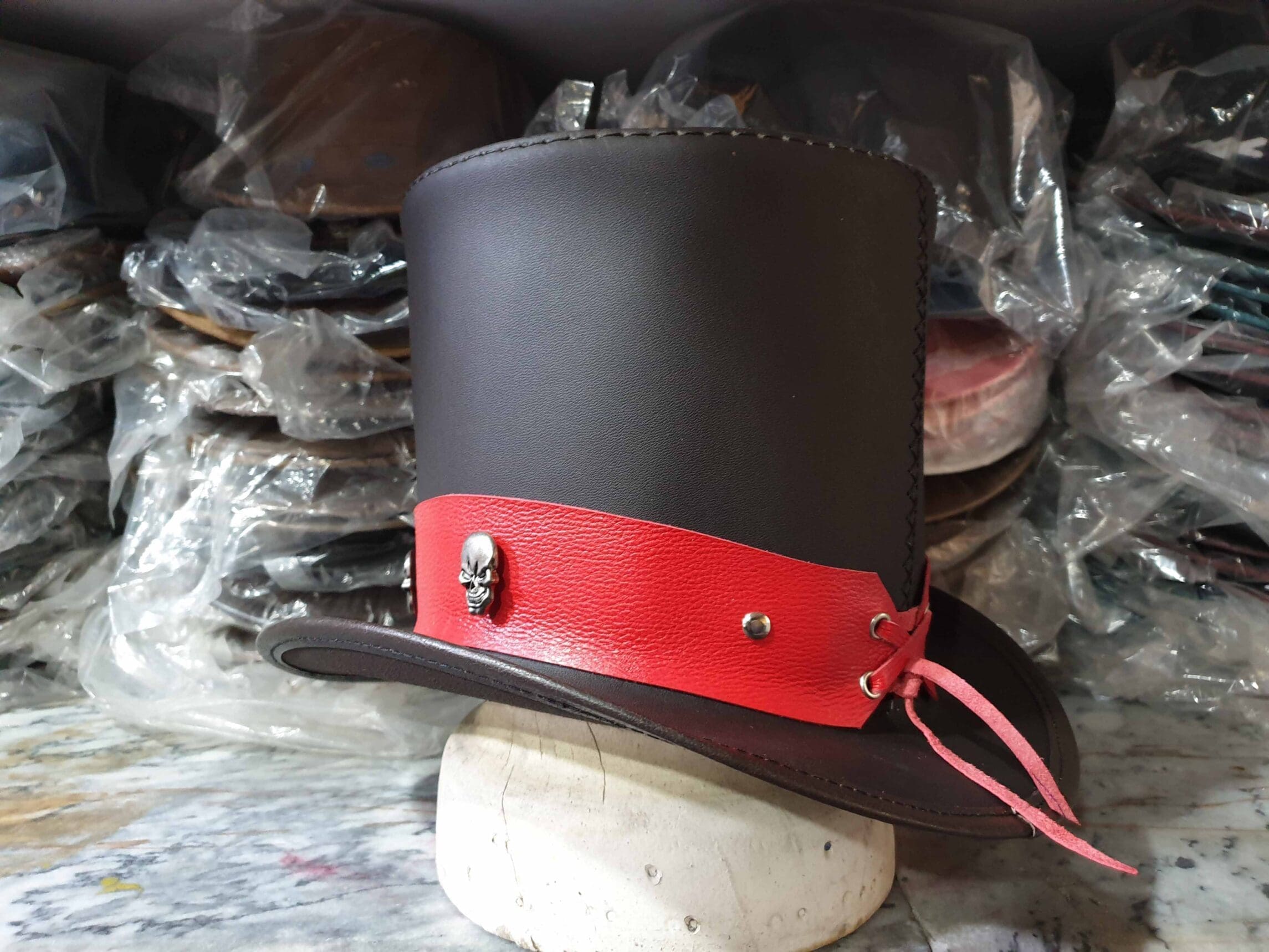 The Ringmaster Brown Leather Top Hat with Metal Skull Rivets on a Red Leather Hat Band is a bold and striking accessory, perfect for those who appreciate a blend of classic style with a touch of edgy, gothic flair. Here’s a detailed description: