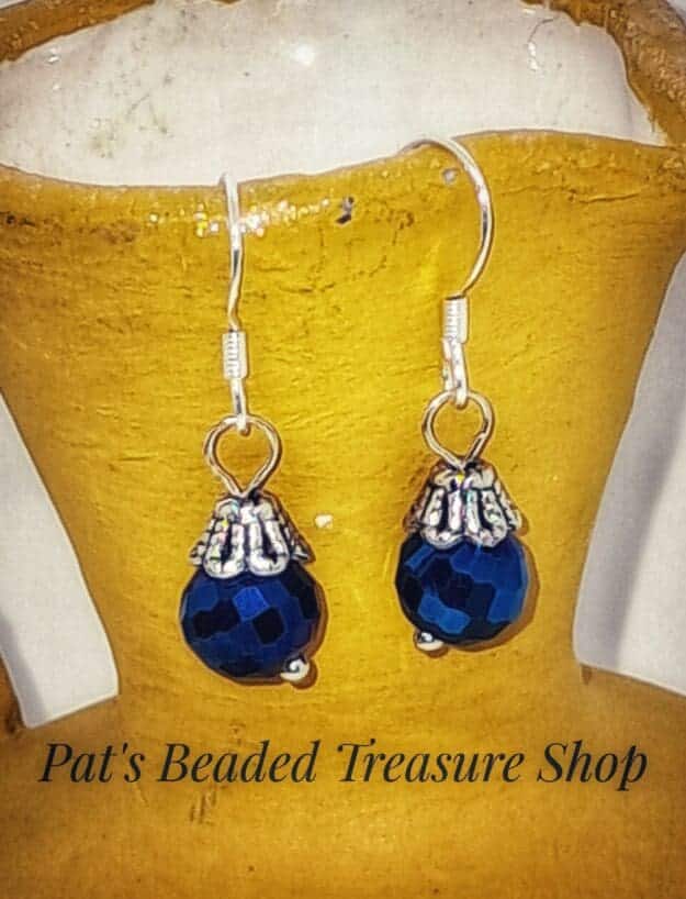 Beads: Faceted royal blue glass with silver-toned bead caps