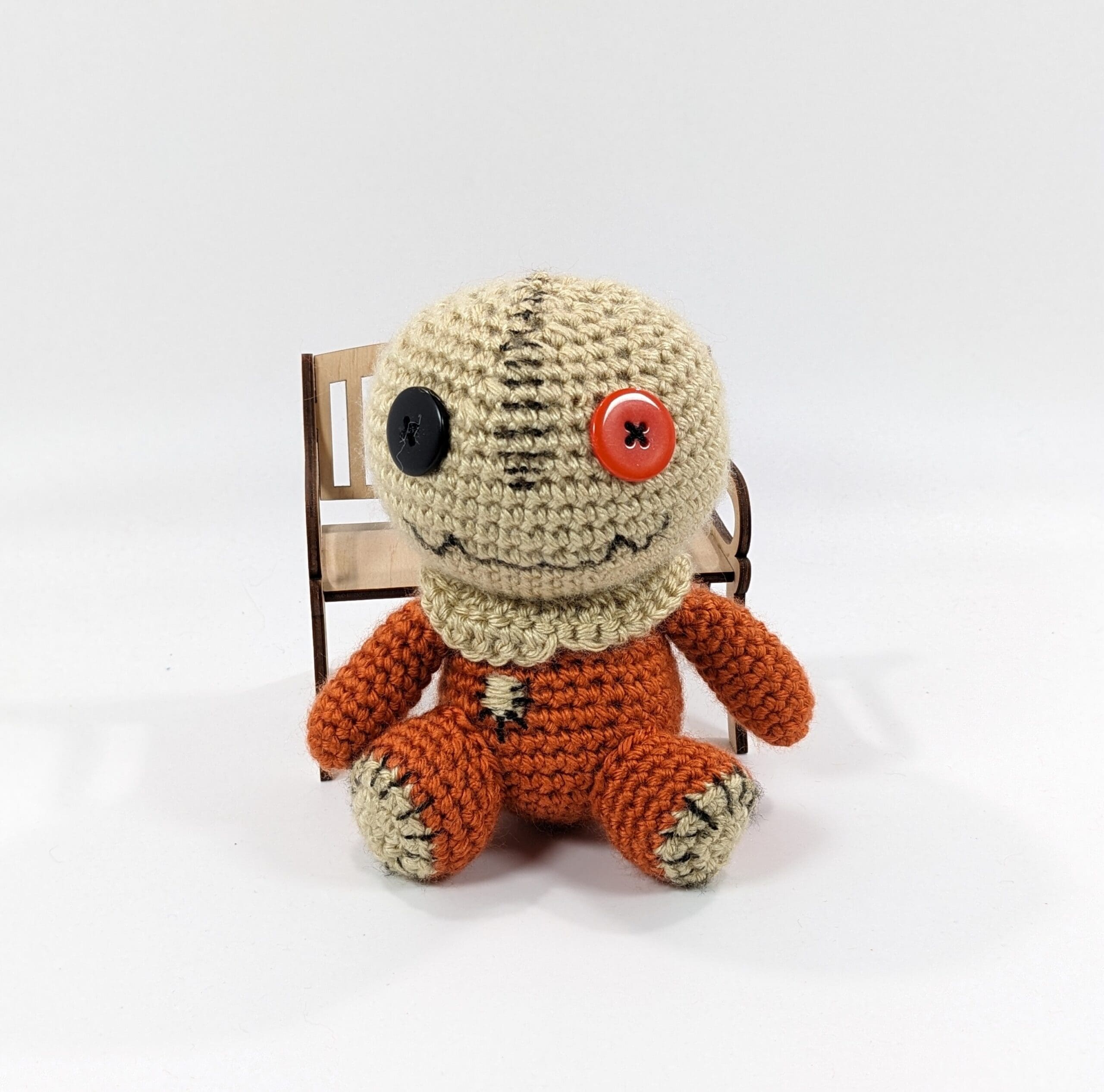 Also, Sam Voodoo Crochet Horror Doll is hand crochet with acrylic yarn and filled with a polyester fiberfill. He has two buttons for eyes and a cotton crochet thread used for stitches. Not recommended for young children.