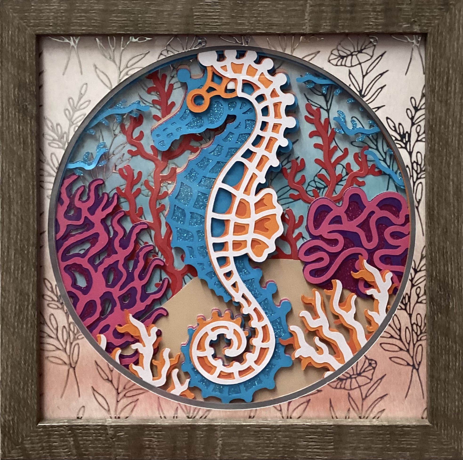 Each seahorse shadow box is handmade using carefully layered materials to achieve a dimensional look that flat artwork cannot provide. The contrast between vibrant blues, warm coral tones, and soft background details brings balance and harmony to the design. From the curled tail to the delicate coral shapes, every element is intentionally placed to reflect the natural rhythm of ocean life.