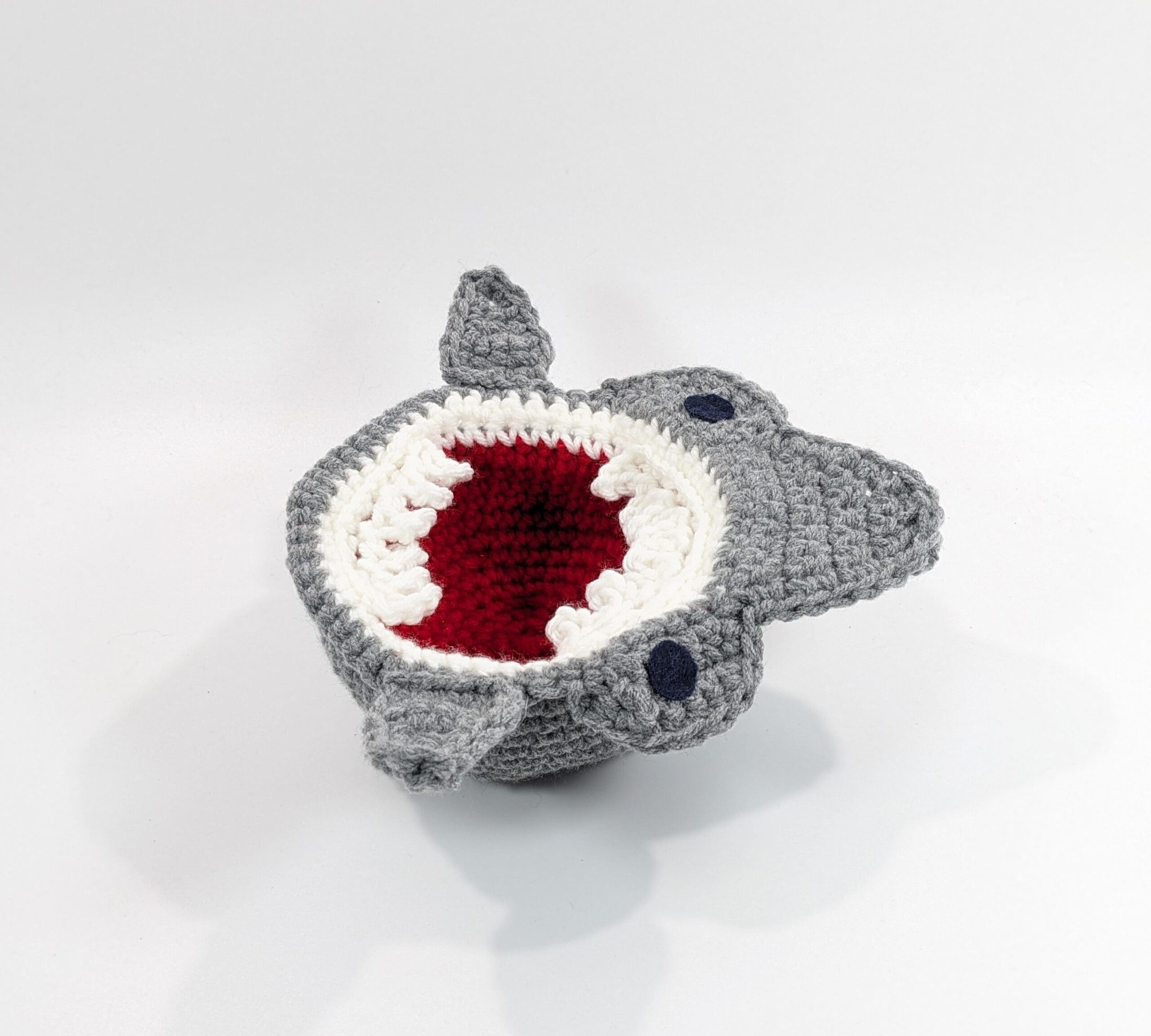 Shark Bowl Crochet Dish Cozy. You get this fun crochet Shark bowl that can hold almost anything measuring at 41/2″ X 2 1/2″. Also you can place any of your kitchen bowls inside, or use to hold wrapped candy. You can place a potted plant inside. Also use to hold a vase with flowers. You can find more fun items like this, just click on my shop link below.