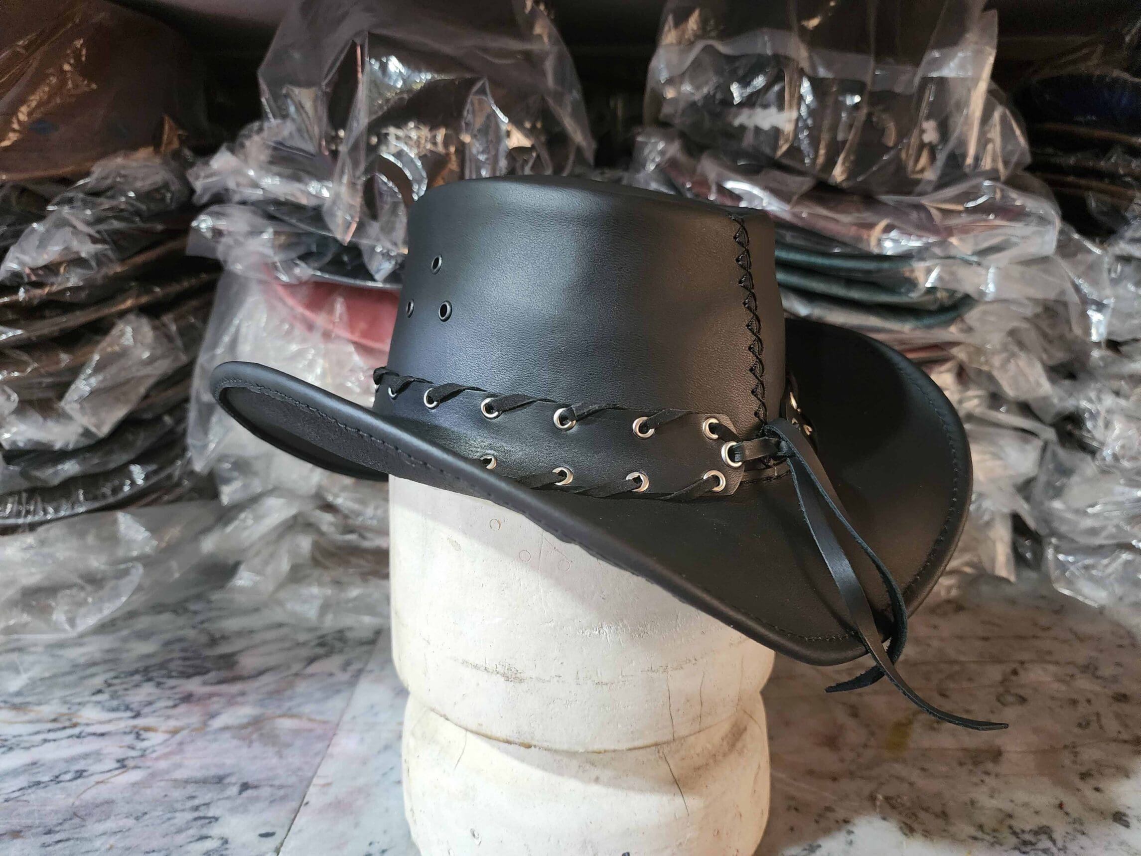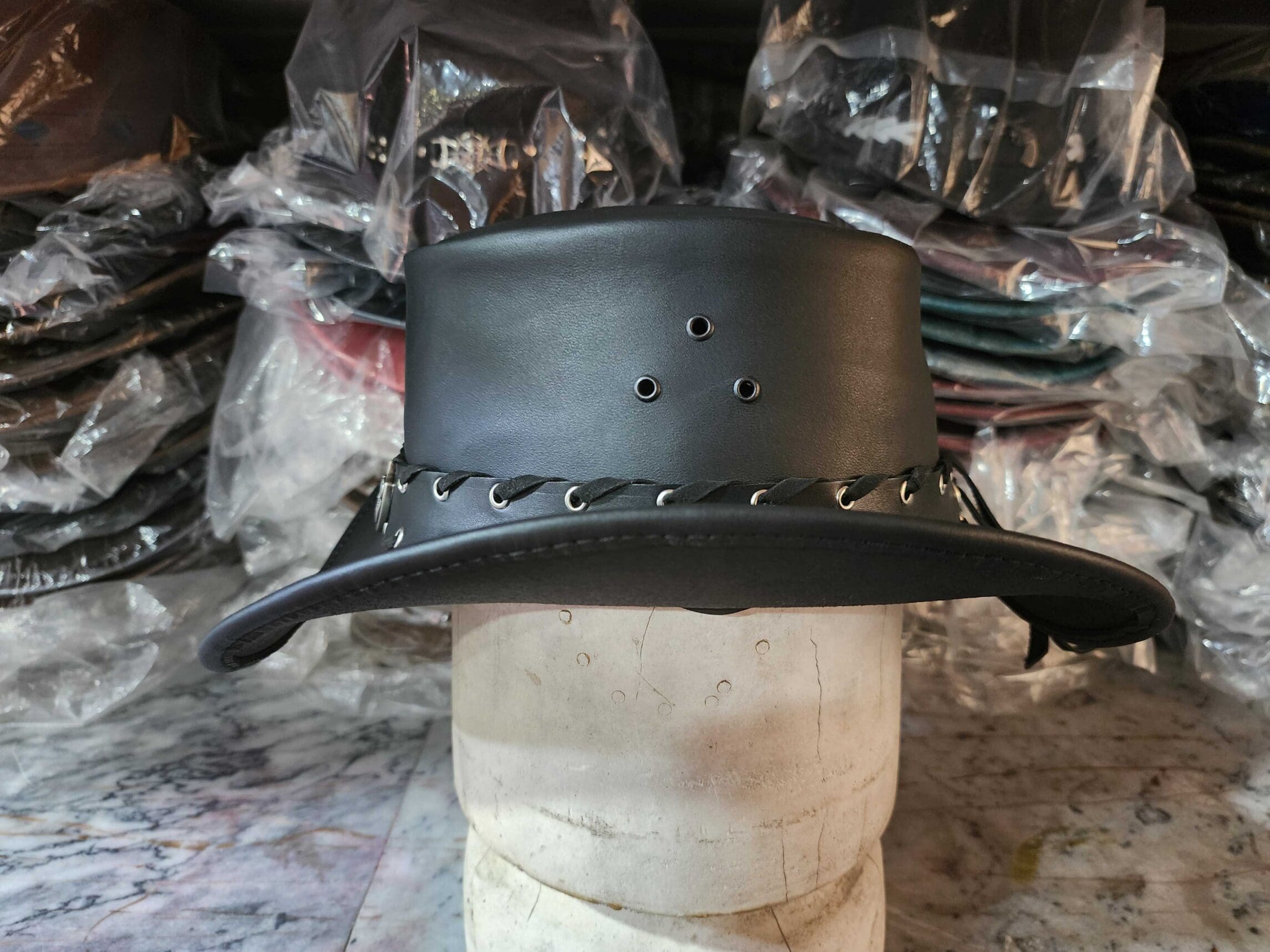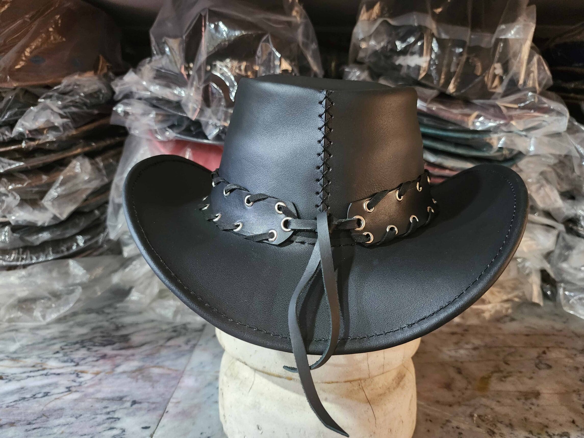 This striking cowboy hat is crafted from premium black grain leather, known for its durability and rugged charm.