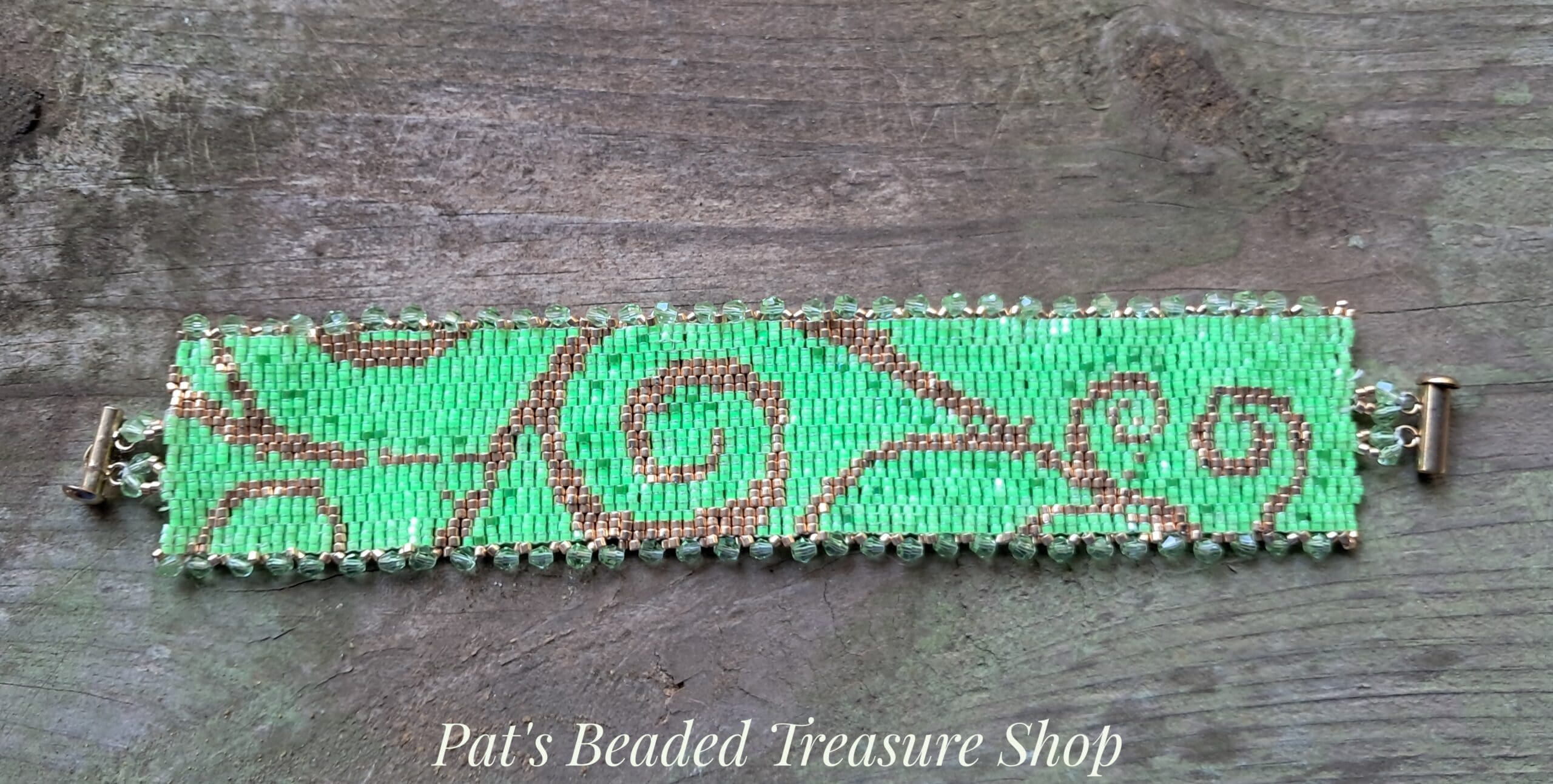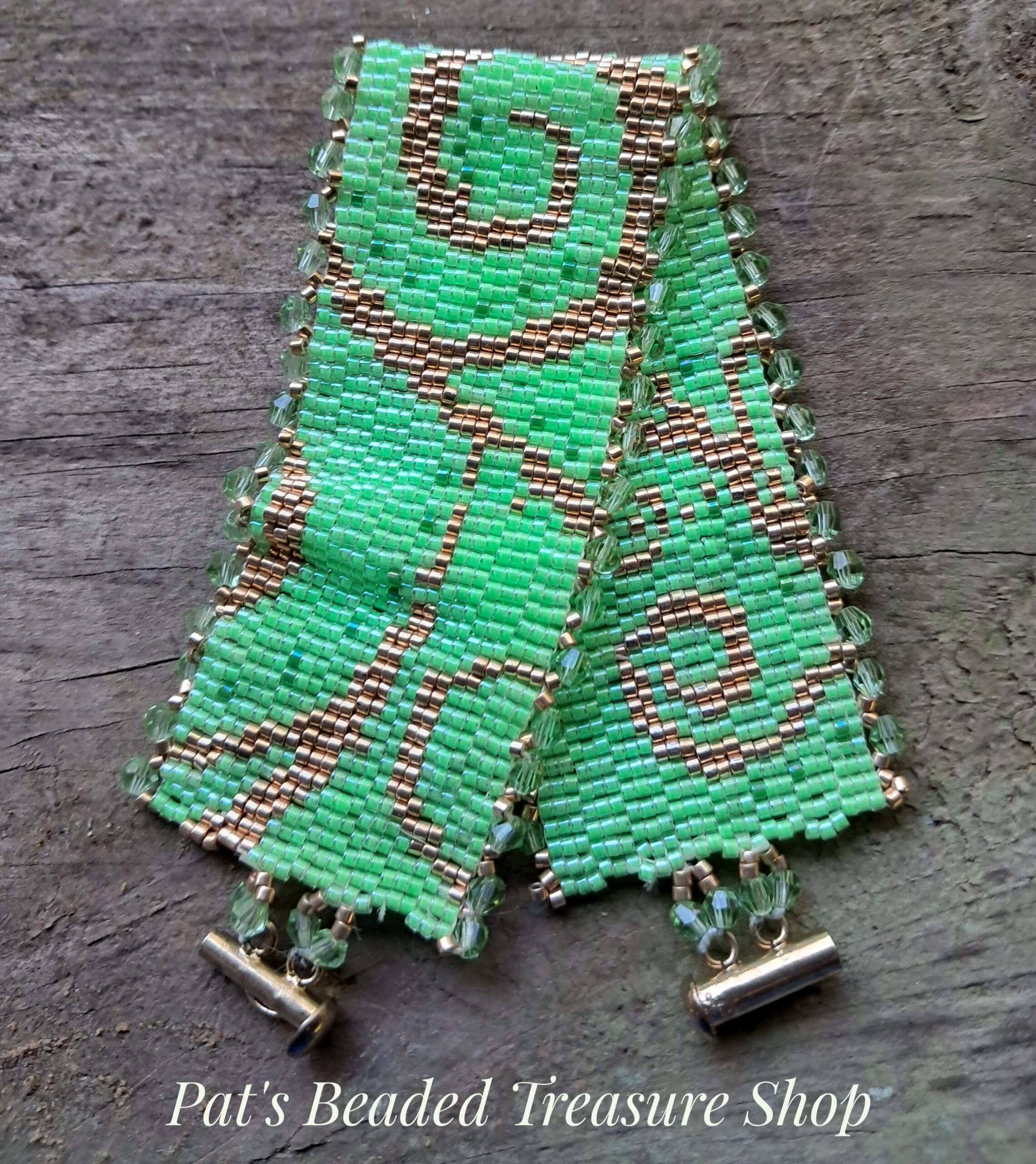 This handcrafted green and gold bracelet features an elegant swirling pattern made from premium glass seed beads, beautifully accented with sparkling crystal edges. The combination of rich green and metallic gold tones creates a timeless and eye-catching design.