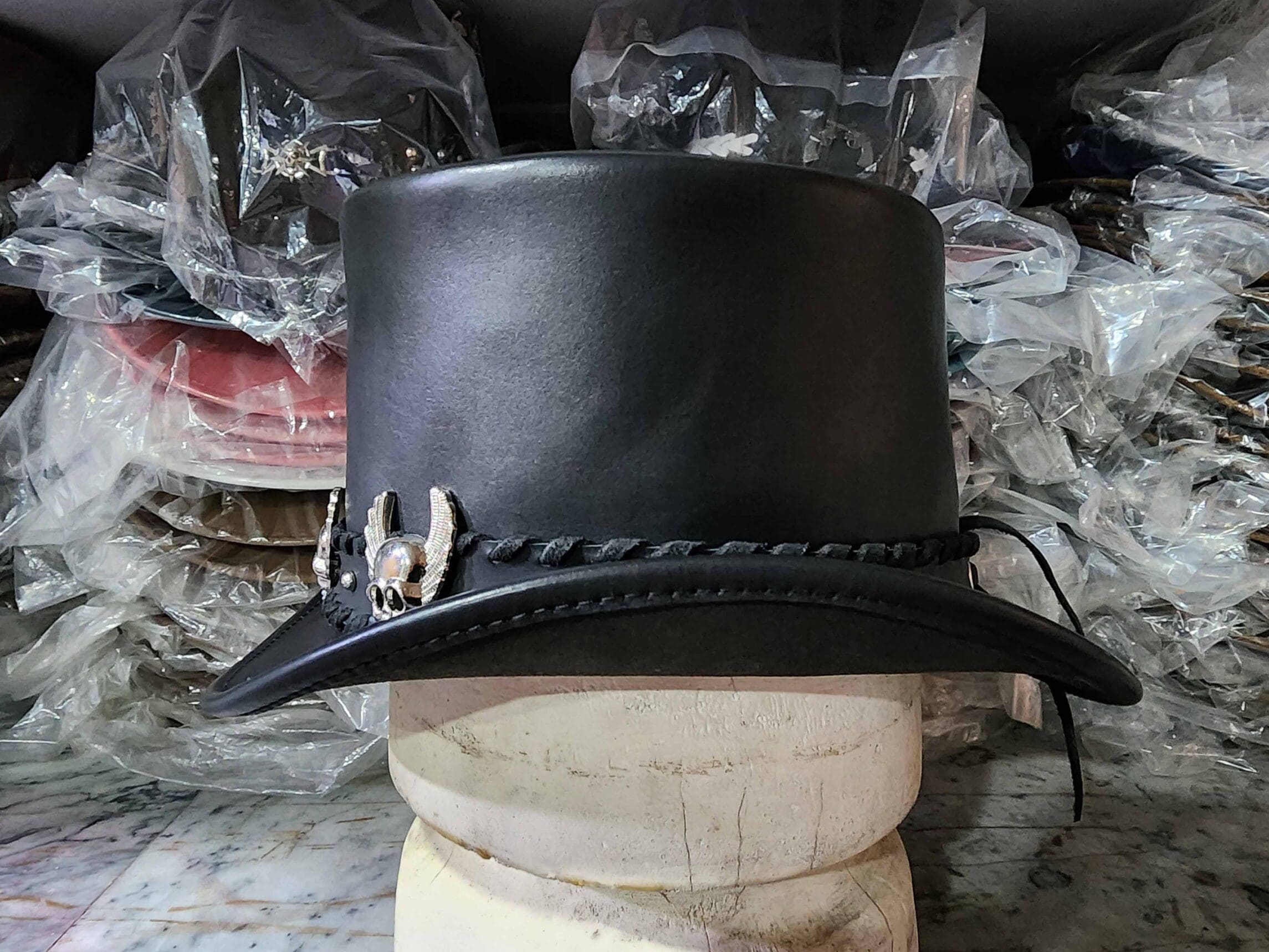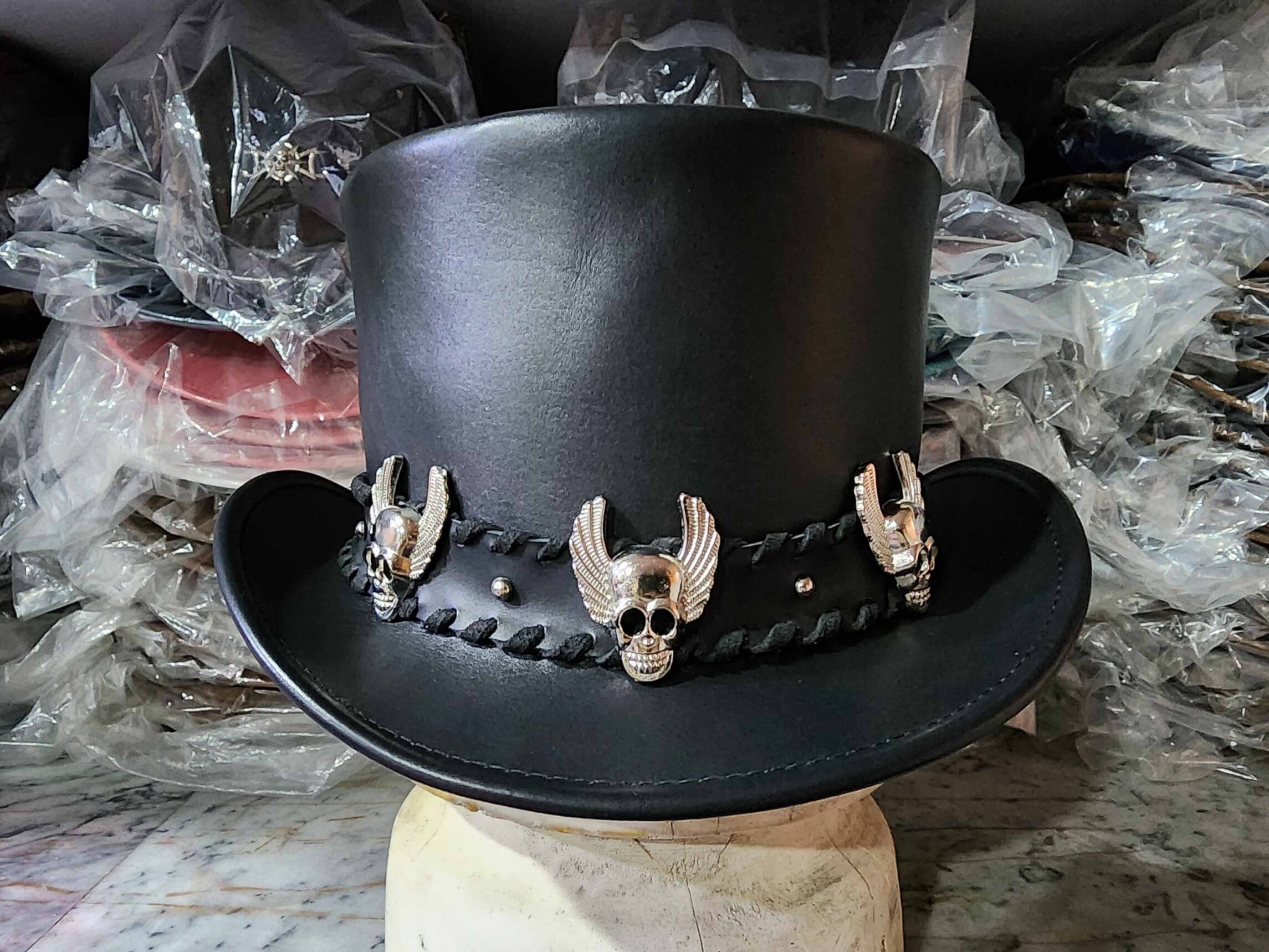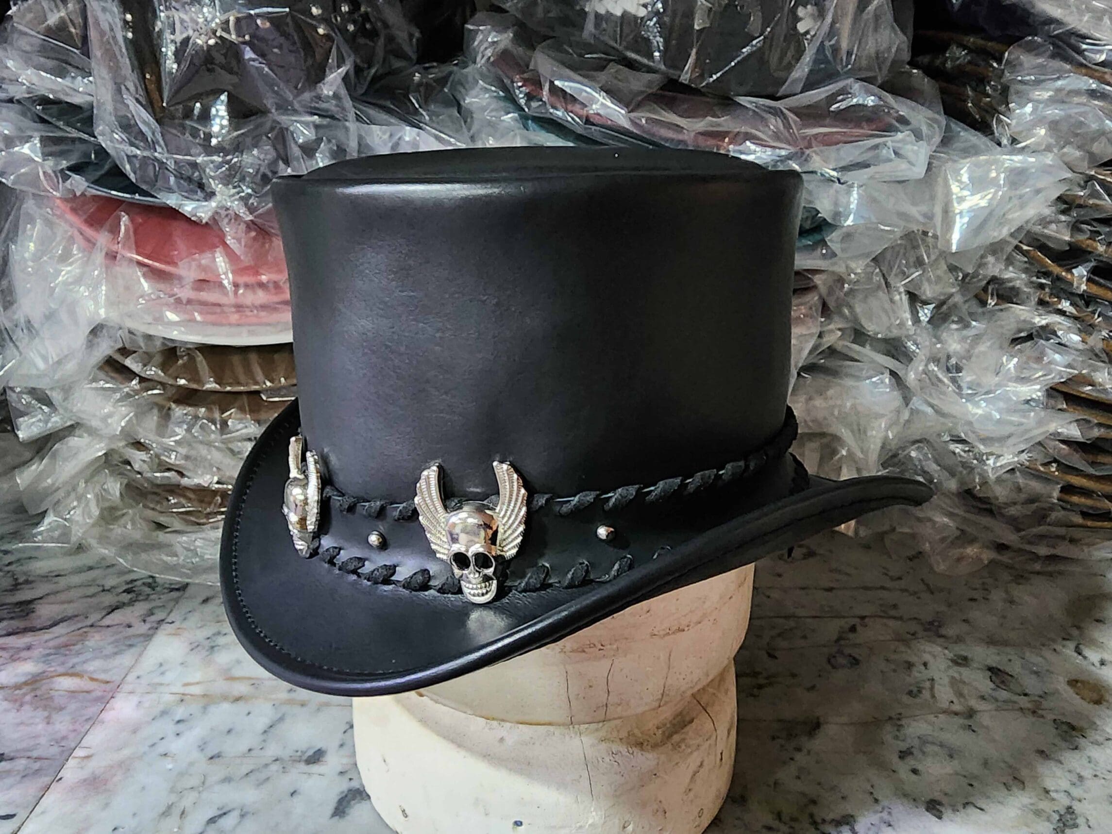 The “Trio Silver Winged Skulls Band Eldorado Black Leather Top Hat” is a stylish and edgy hat designed for those who want to make a bold statement.