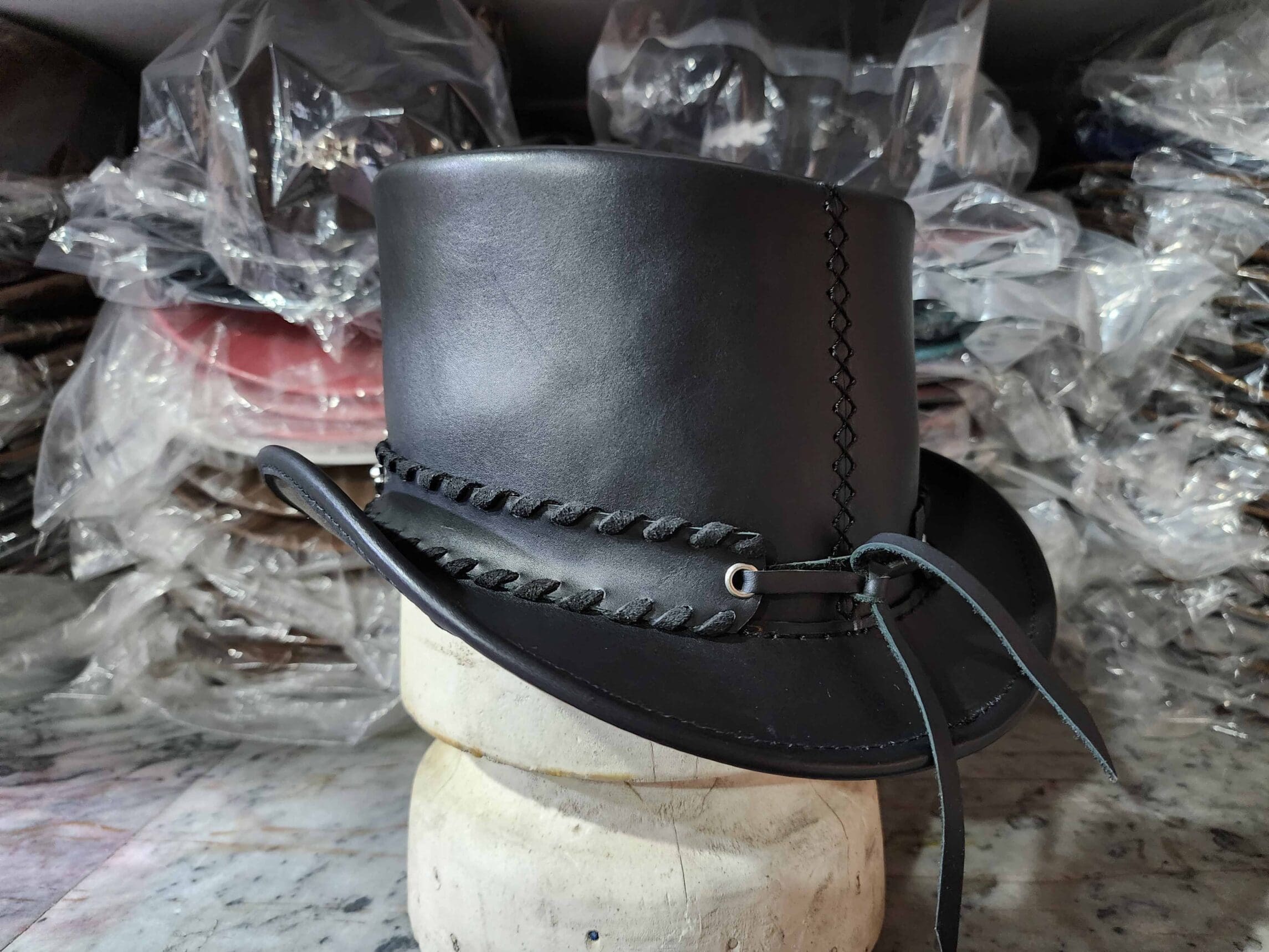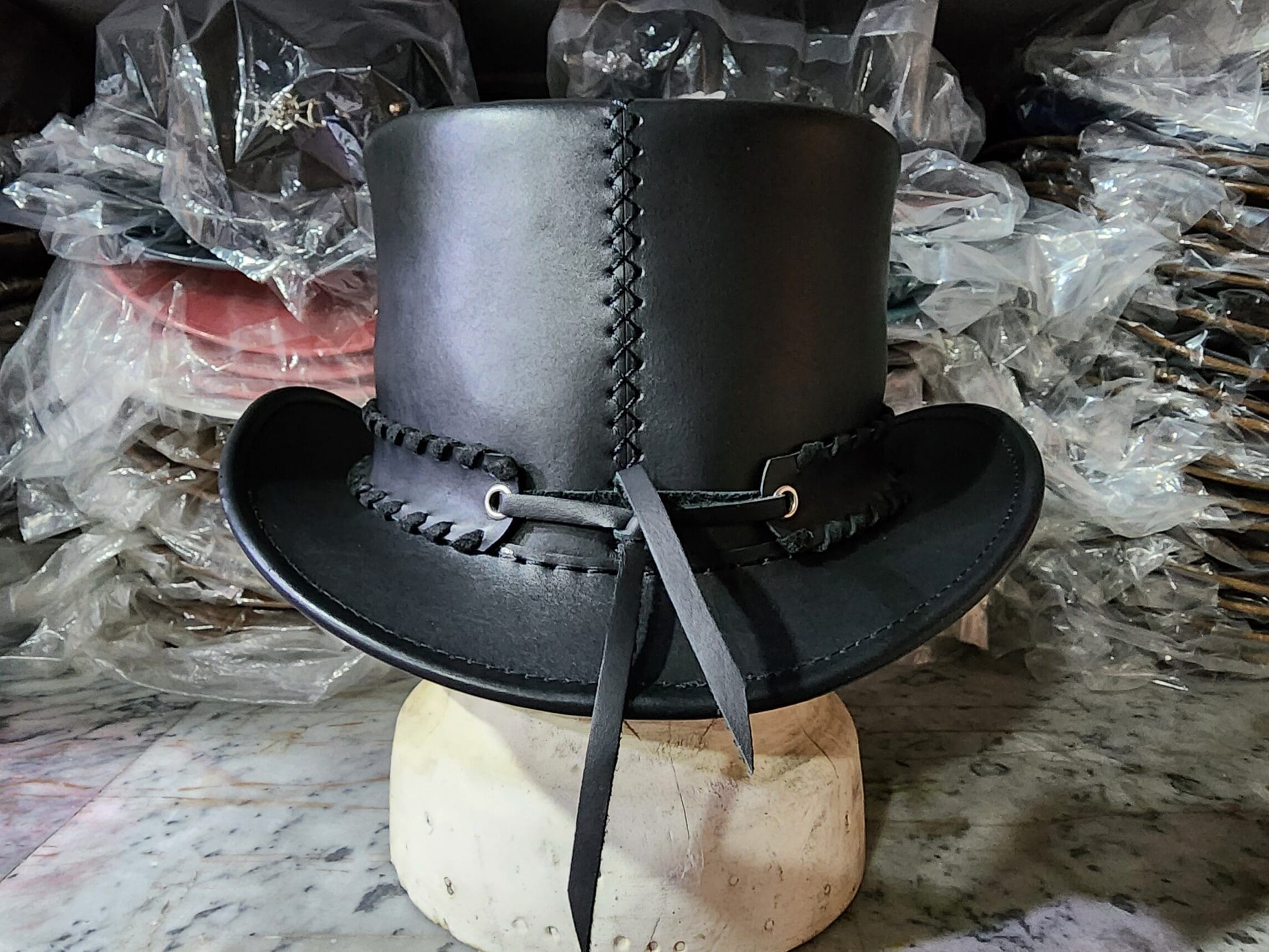 This top hat features a high-quality black leather construction that provides a sleek, classic appearance.