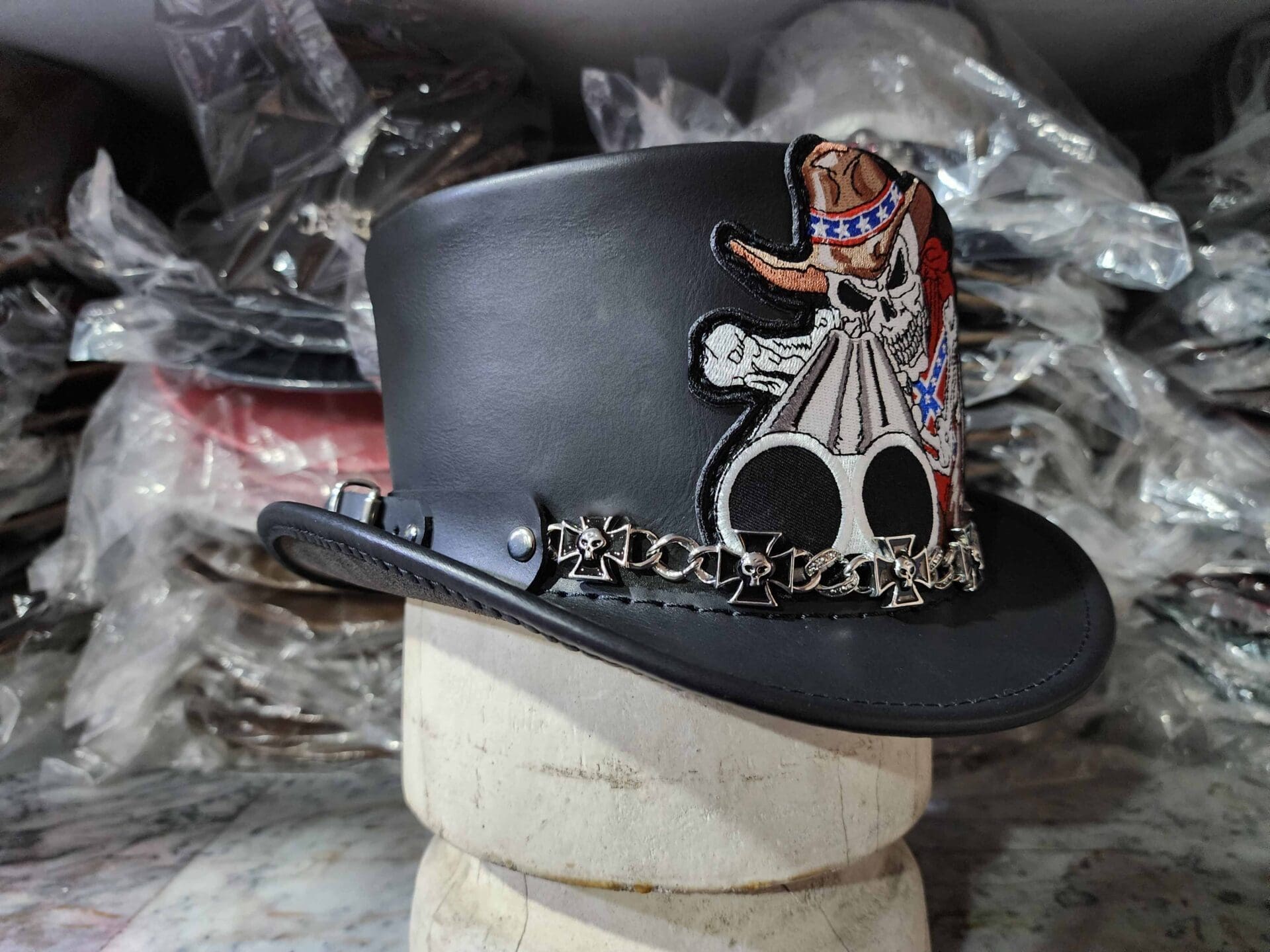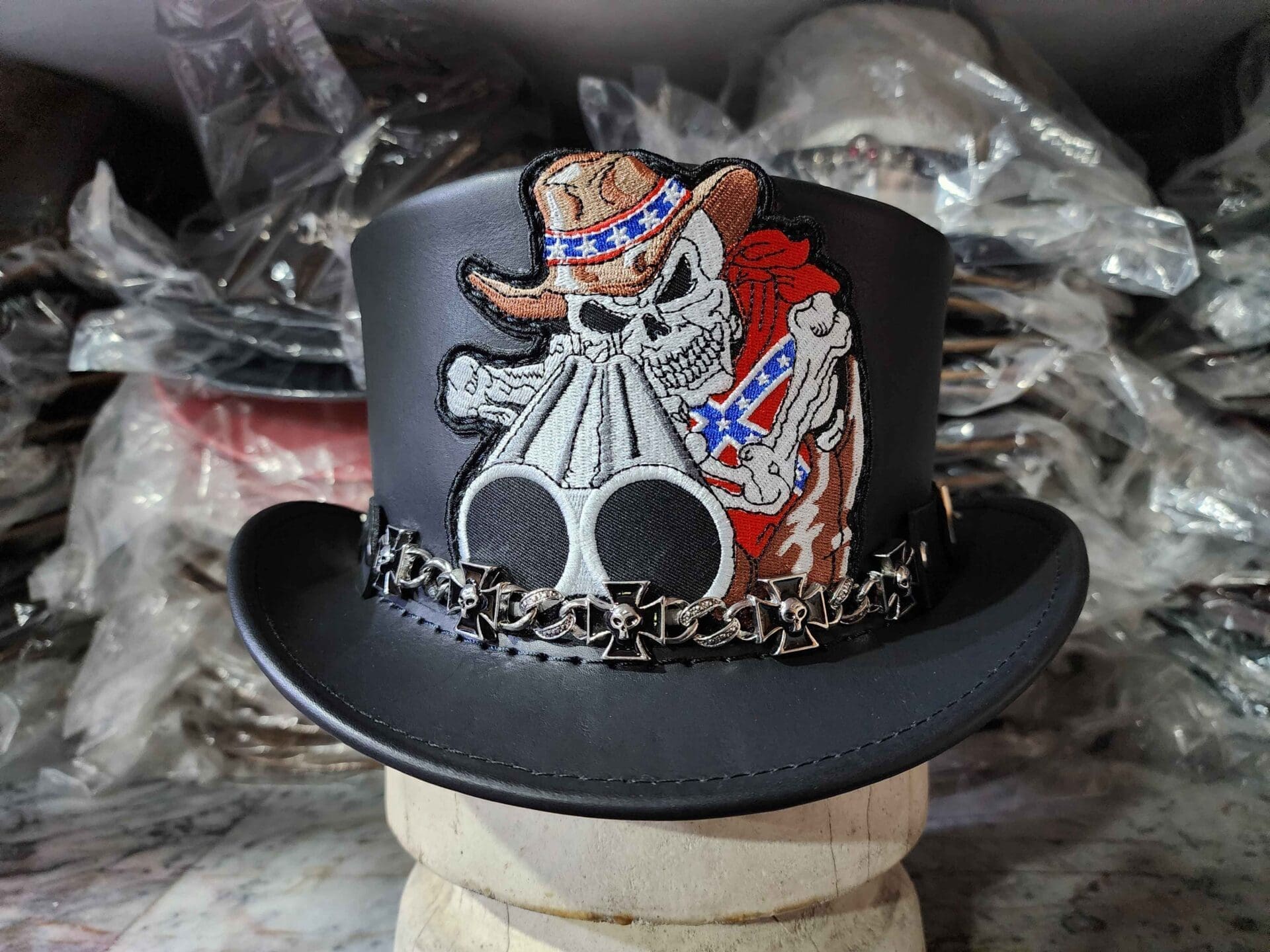 Unleash your inner rebel with this bold and edgy black leather top hat featuring a striking embroidered skull and guns patch with a Western outlaw theme.