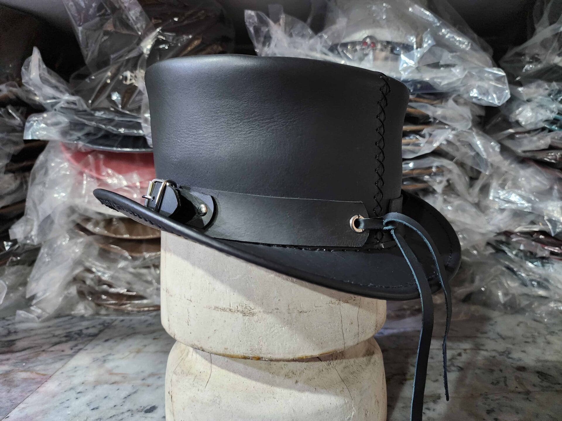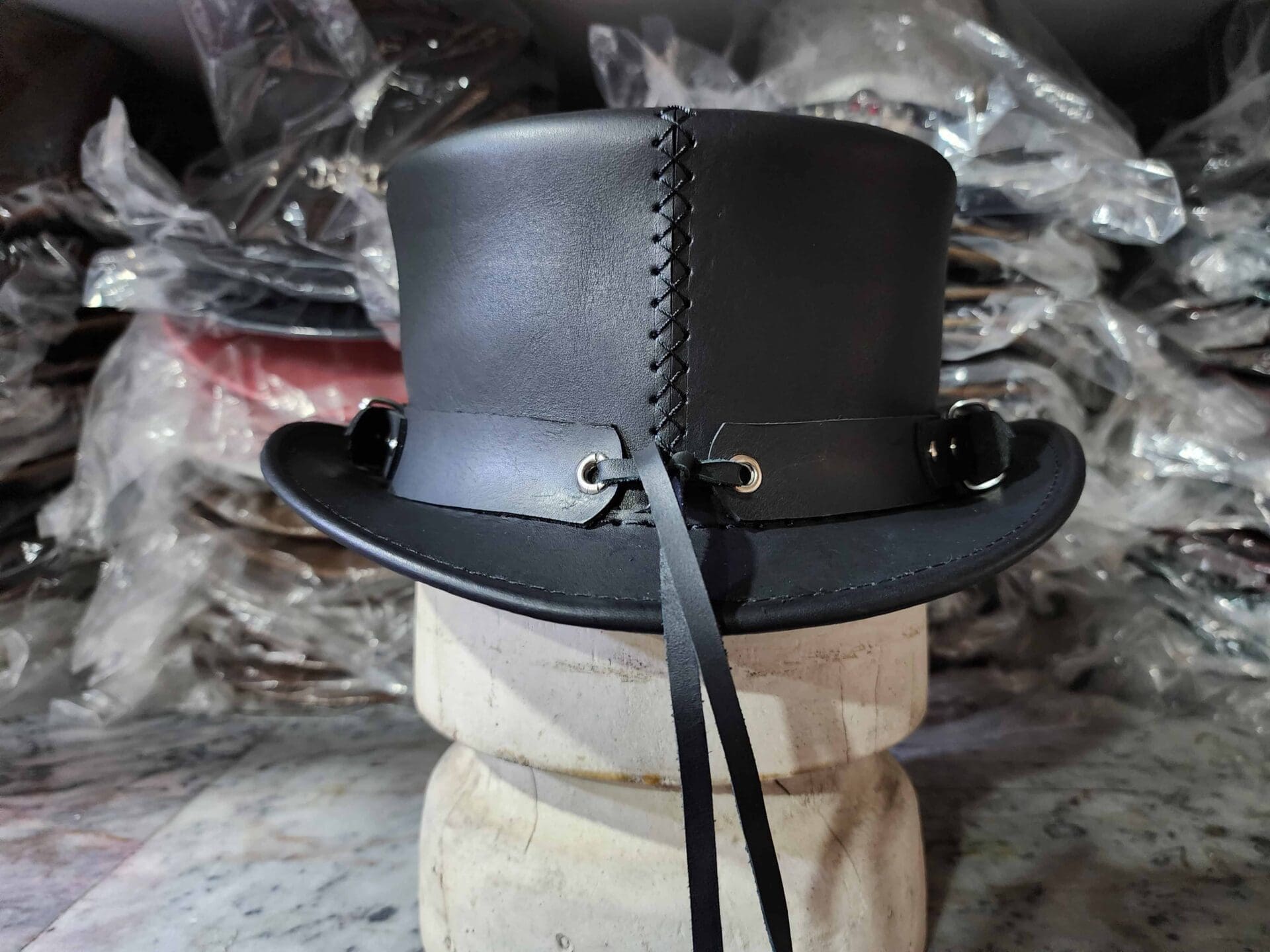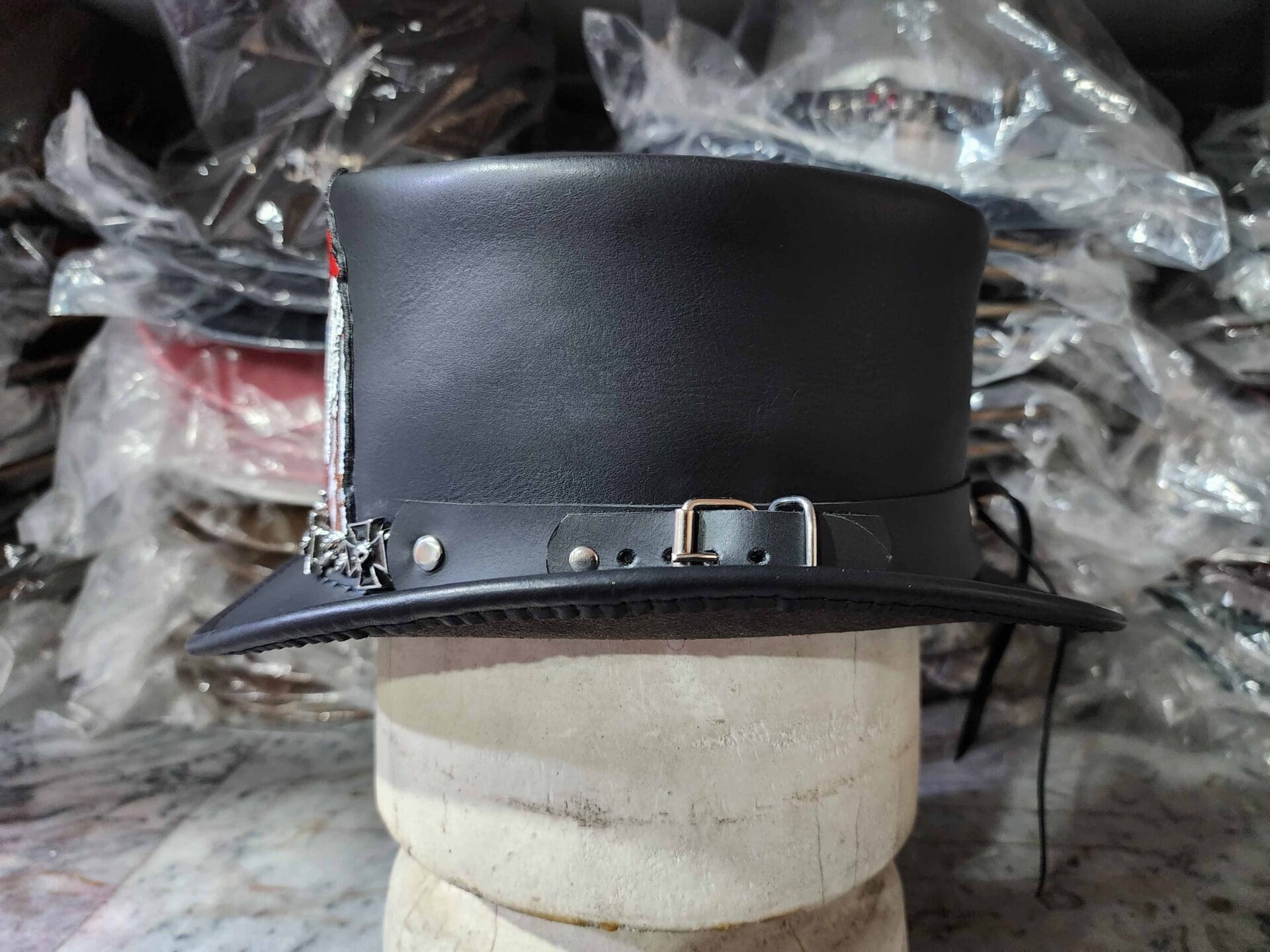 Stand out with this badass black leather top hat that combines Western outlaw vibes, gothic elements, and rock ‘n’ roll attitude into one unforgettable piece!
