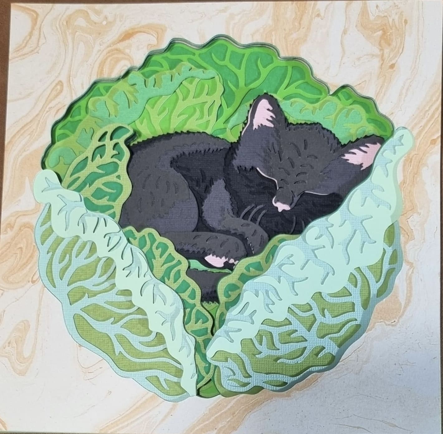 This handcrafted Sleeping Cat Shadow Box offers a playful yet calming design that blends cozy charm with creative storytelling. Featuring a sleeping black cat tucked comfortably inside layered cabbage leaves, this shadow box brings together nature inspired textures and soft details that create visual depth and warmth. Each layer is carefully hand cut and assembled to form a dimensional scene that feels both comforting and unique.