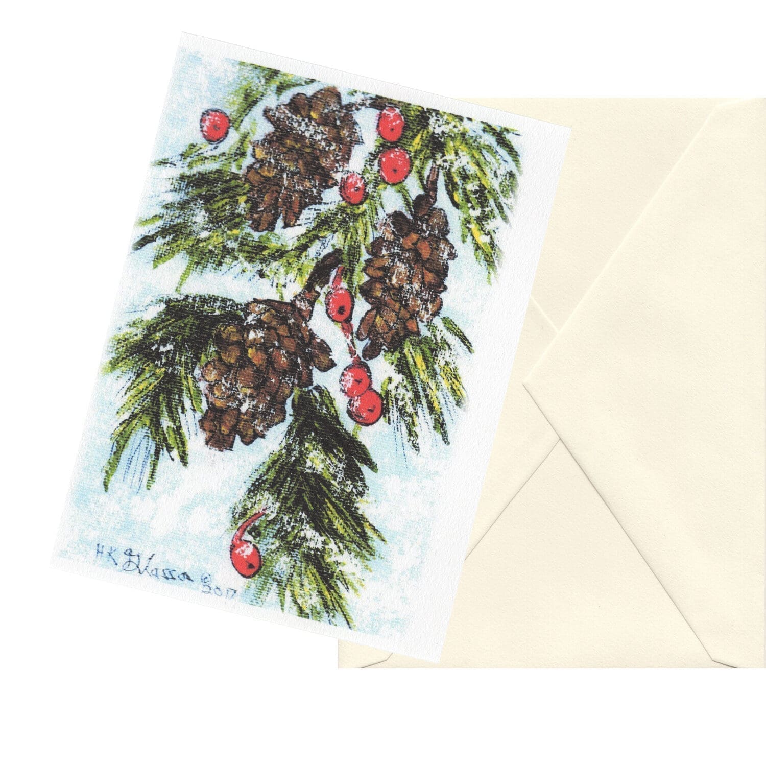 LIMITED STOCK ON CLEARANCE! This card is under a folded half-sheet in size. These cards are lightweight, with a pebbled matte finish, printed on 100 percent cotton paper. Experience the beauty of nature with Snowflake Pinecones Boxed Set of Six note cards, one design. These cards will inspire and delight, featuring stunning nature artwork of red berries, pine cones and Pine Tree Branches. Perfect for sending heartfelt messages to your loved ones. Share the joy of nature with your friends and family through this six-card set!