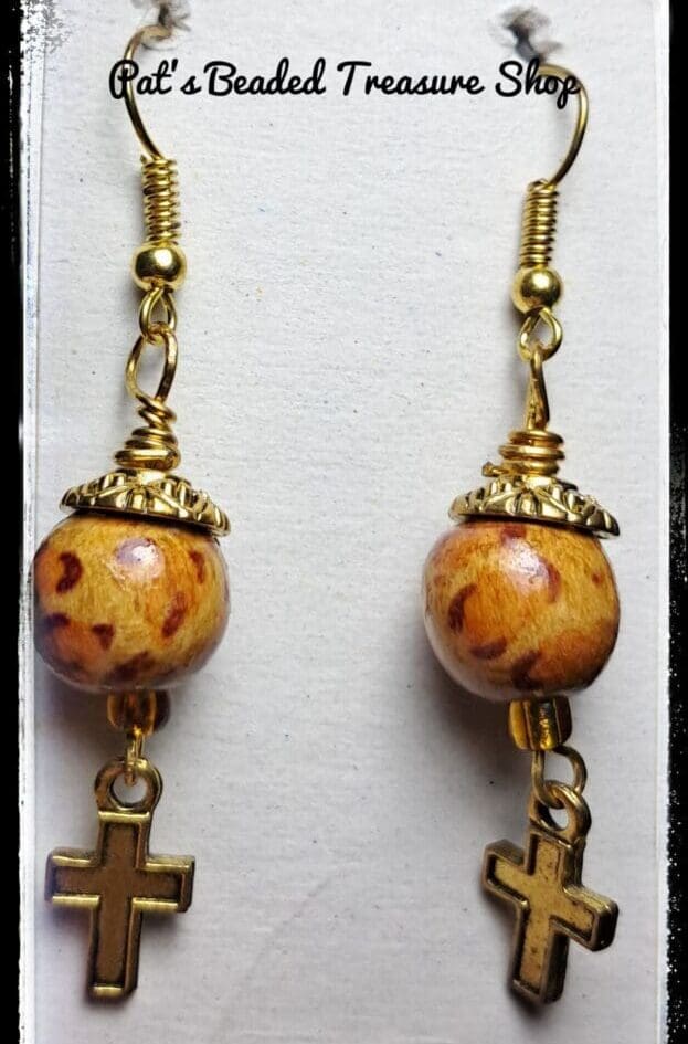 Natural wood beads and golden cross charms create a peaceful, faith-centered design full of warmth and meaning.