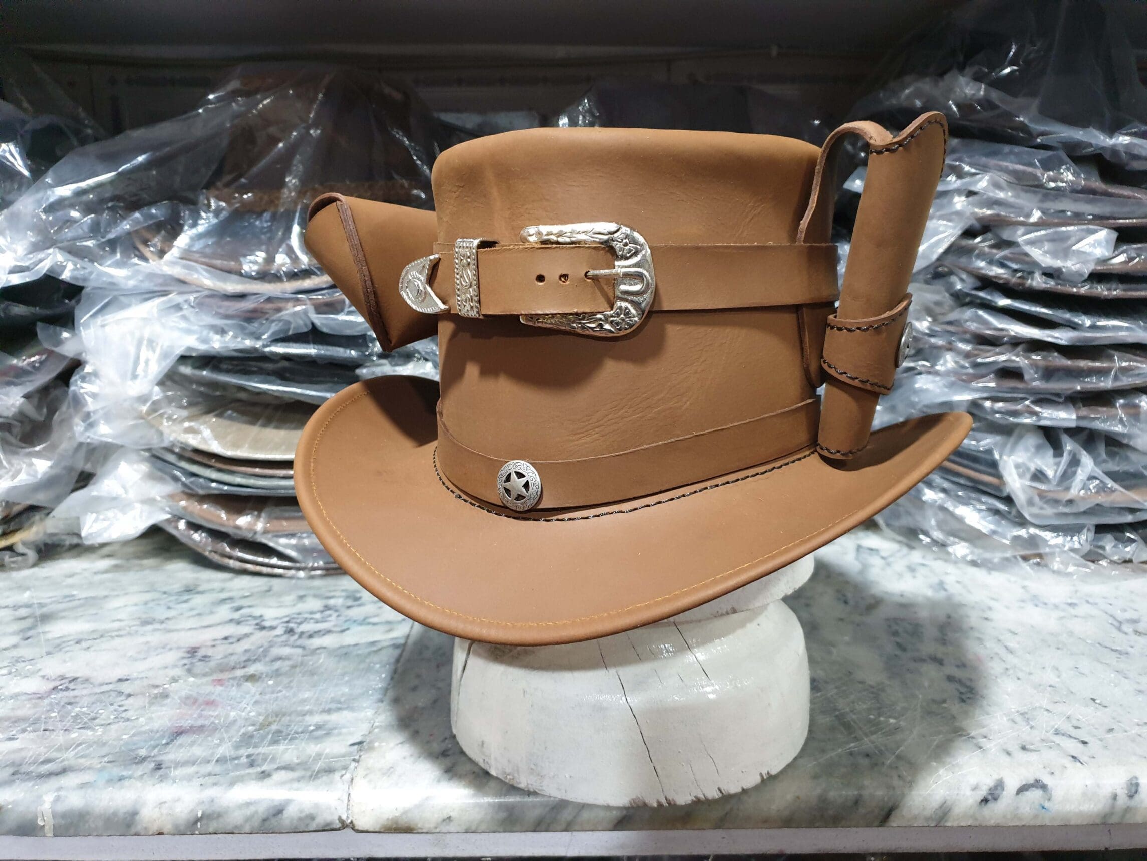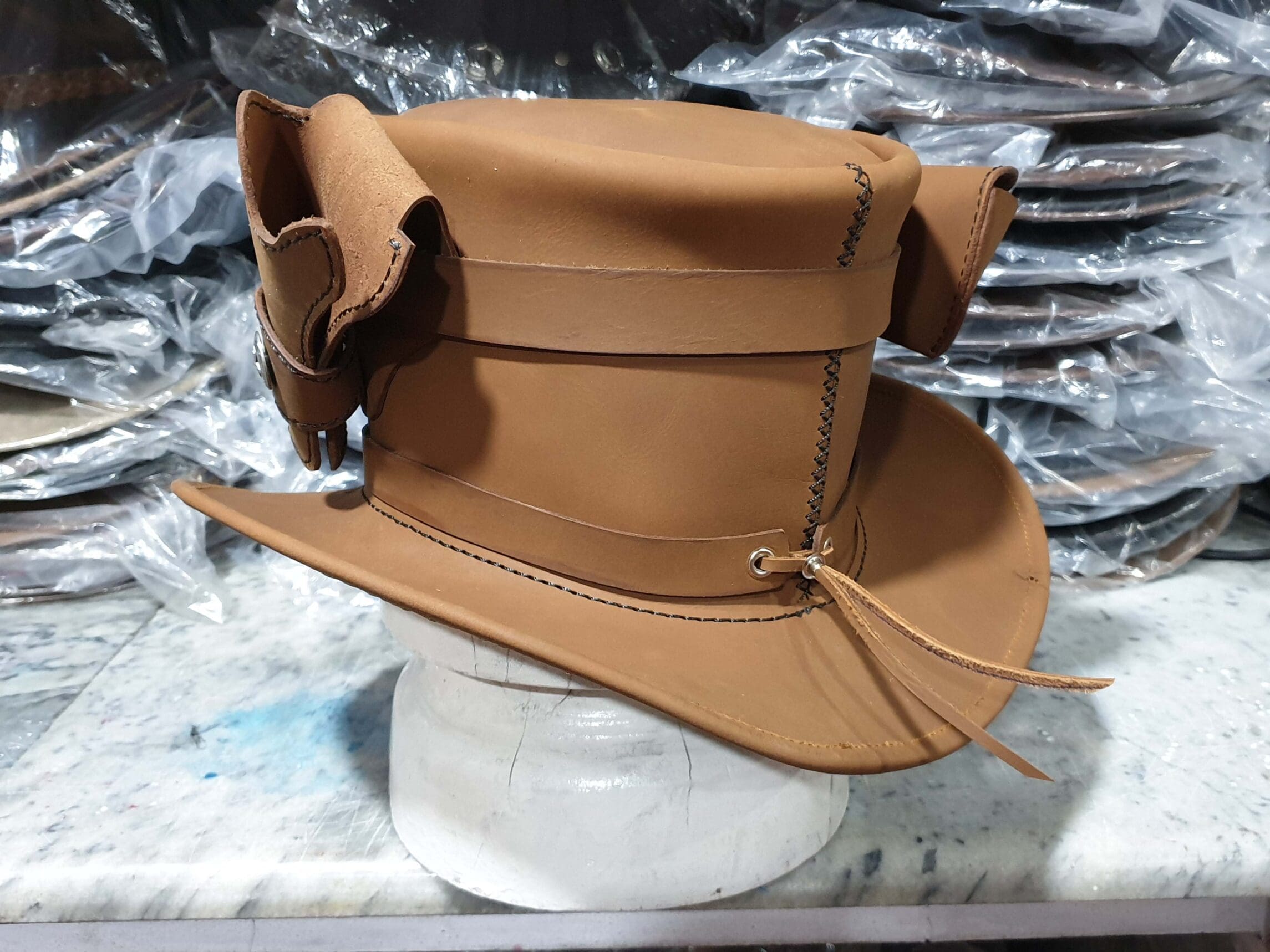Unleash your inner adventurer with this exquisite Steampunk Peace Keeper Leather Top Hat, a perfect blend of vintage charm and modern functionality. This meticulously crafted accessory is designed for those who appreciate the finer details of the steampunk aesthetic.