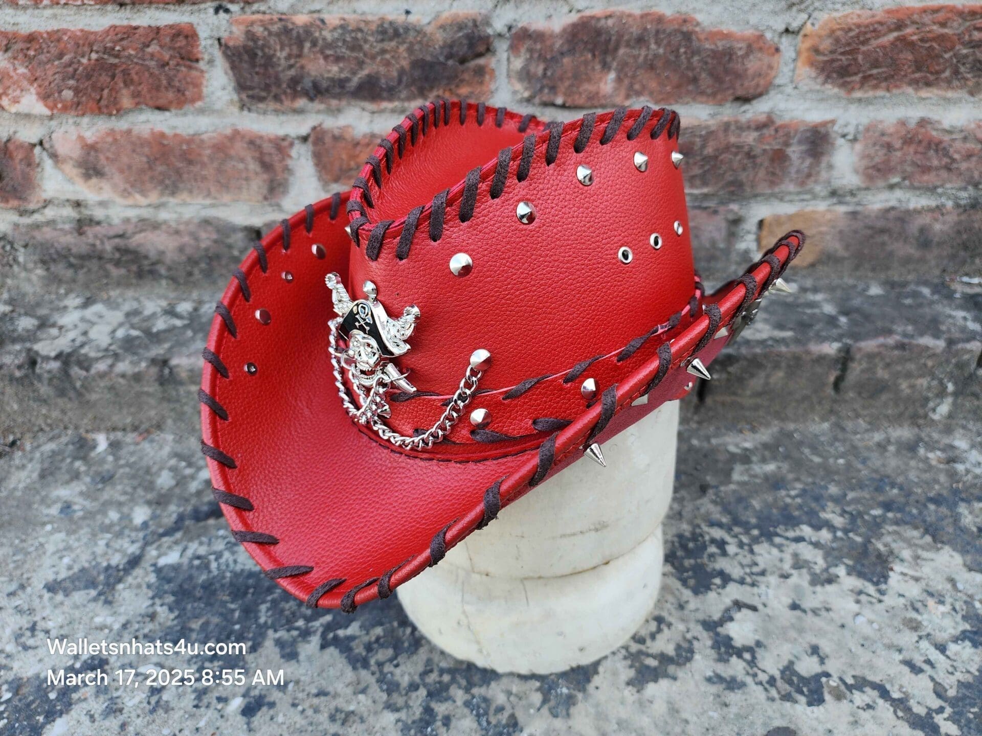 Made from premium quality red leather, this unique hat features brown whip stitch lacing along the brim and crown, giving it a rugged, handcrafted touch.