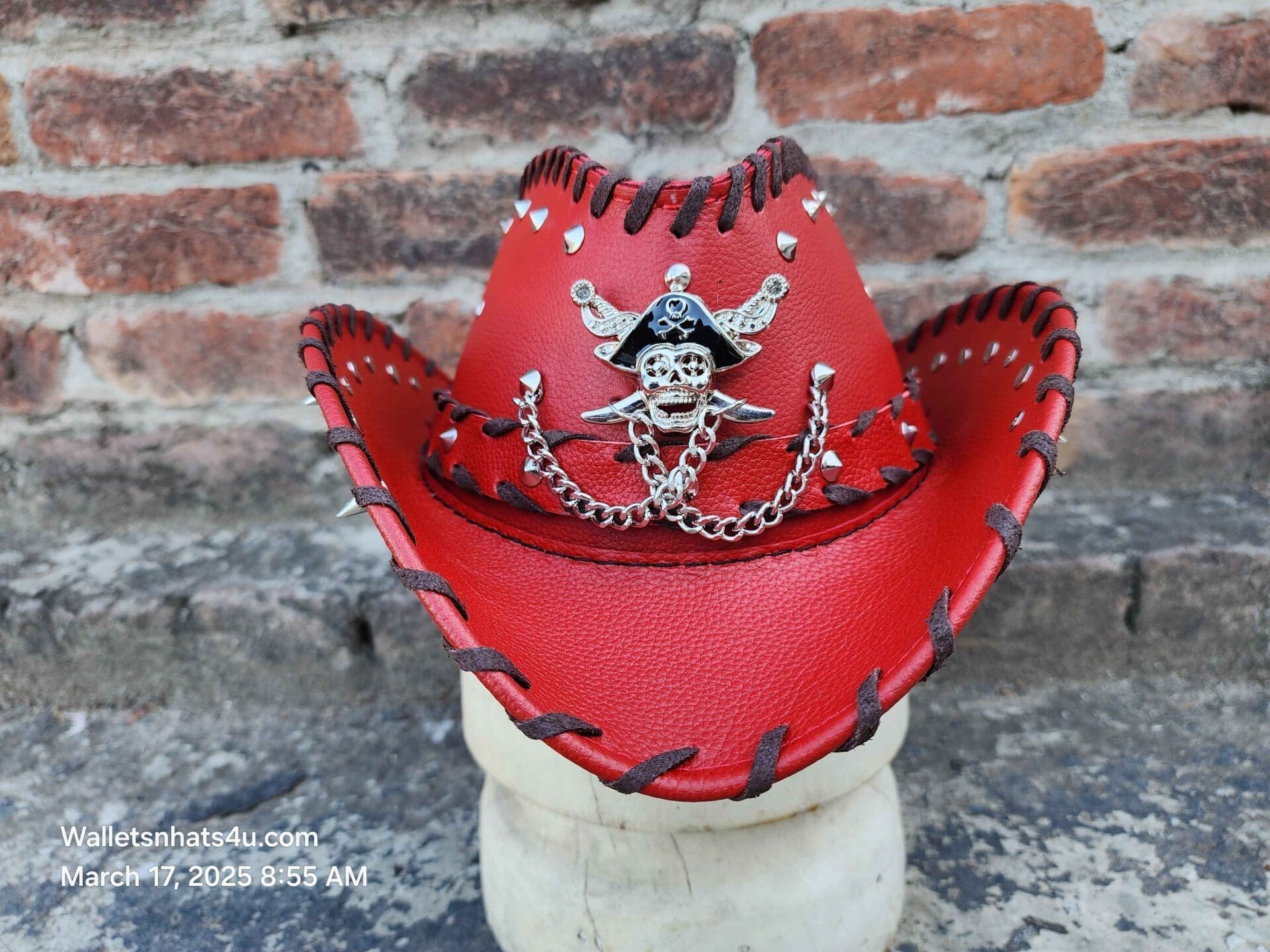 Make a bold statement with this handcrafted Red Leather Hat, blending fierce pirate vibes with edgy steampunk and rocker aesthetics.