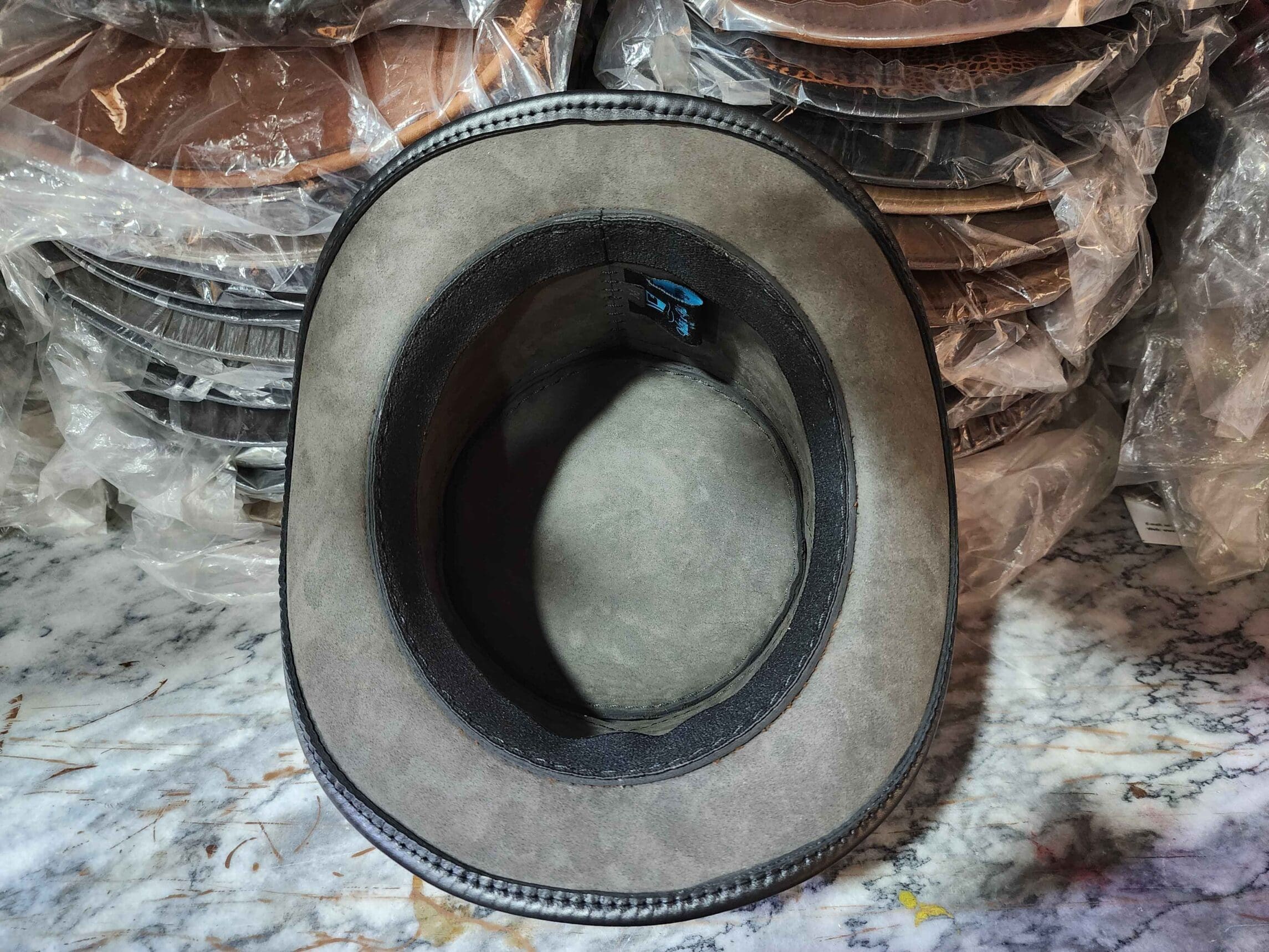 The brim is finished with fine black stitching and leather trim, ensuring durability and cohesion in the design.