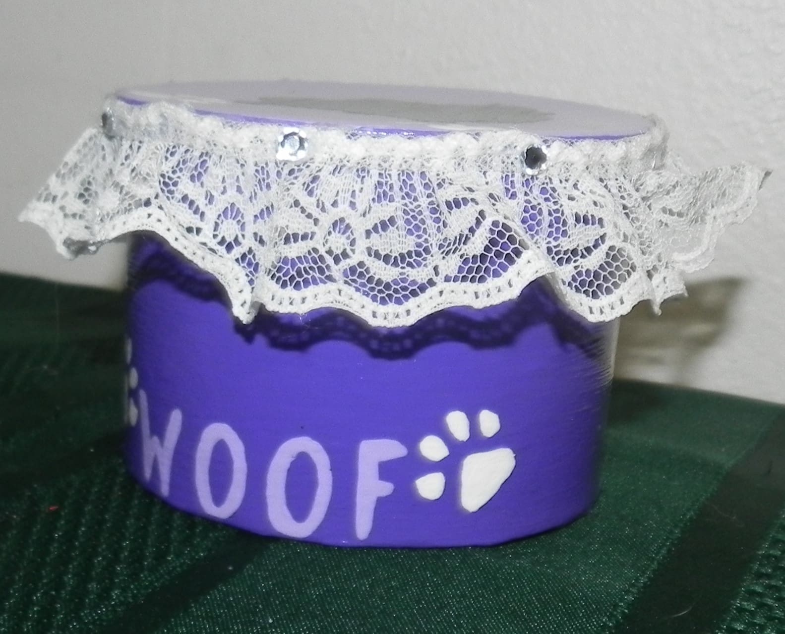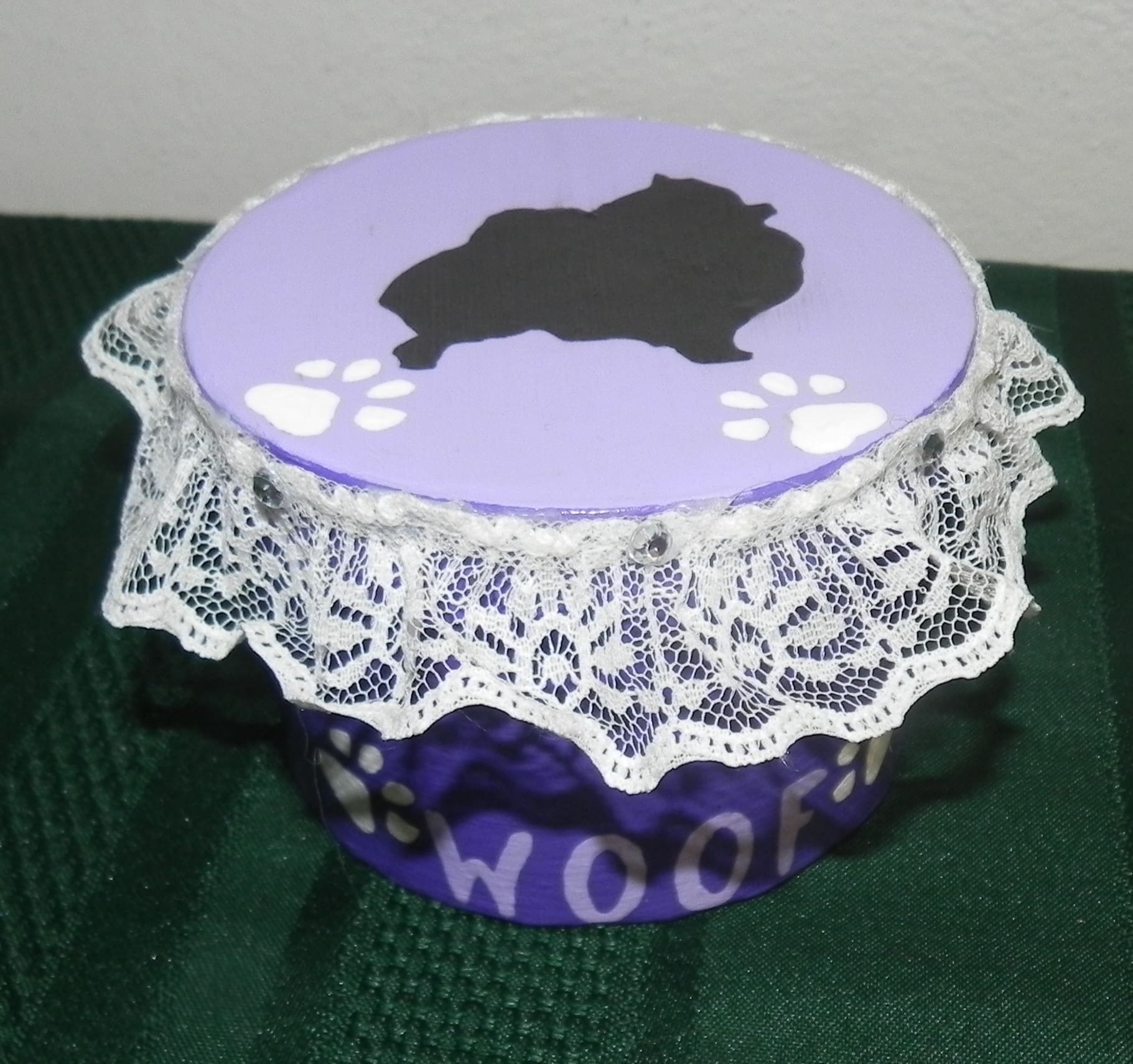 Handpainted paper mache trinket box. This small box has been embellished with lace, rhinestones, a Pomeranian silhouette, and “Woof” on the box.