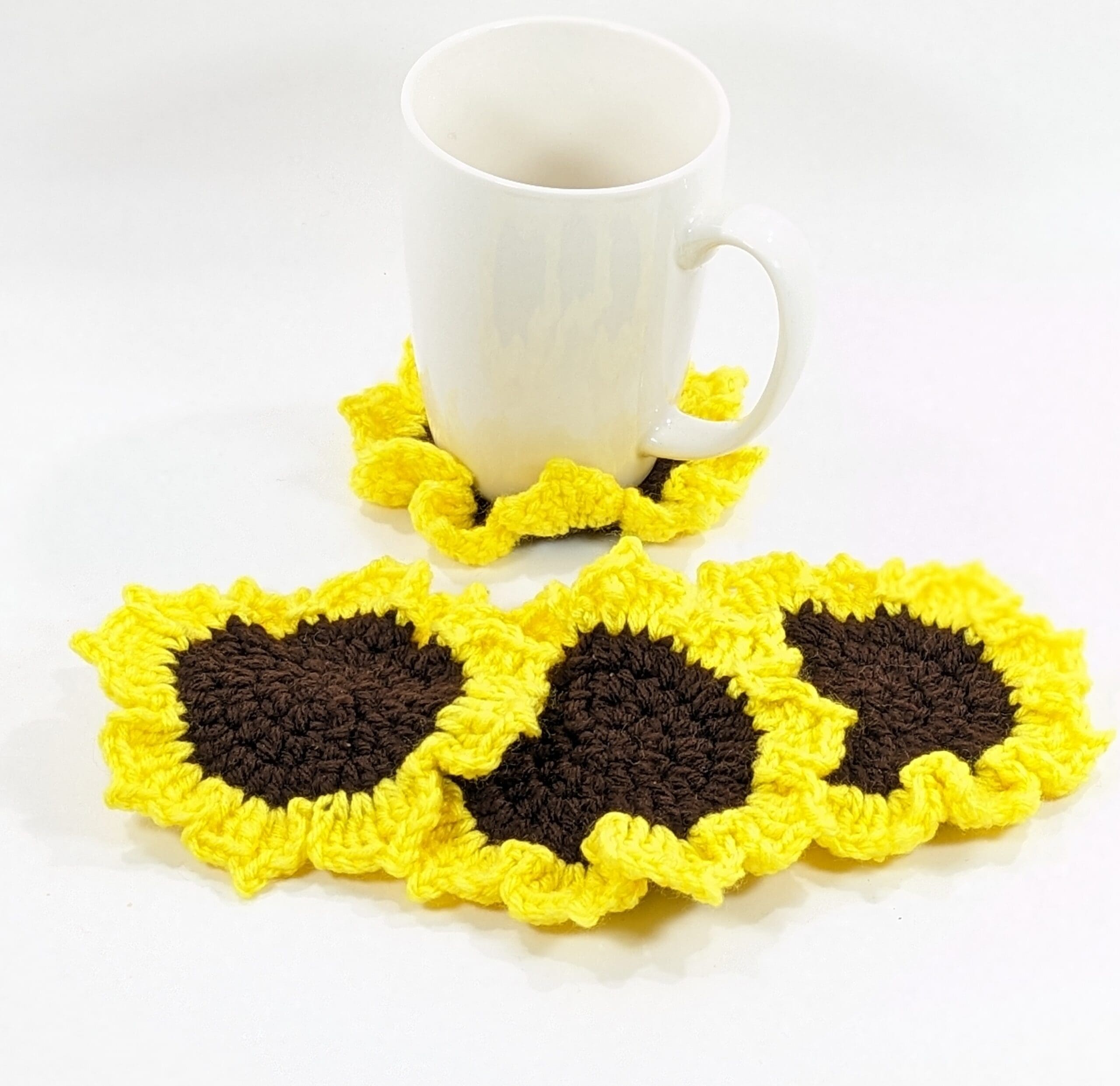 Also Each Sunflower Crochet Coaster Table Set is crochet with 100% acrylic yarn. ( I like using this yarn because it is easy to care for and hardly ever stains)