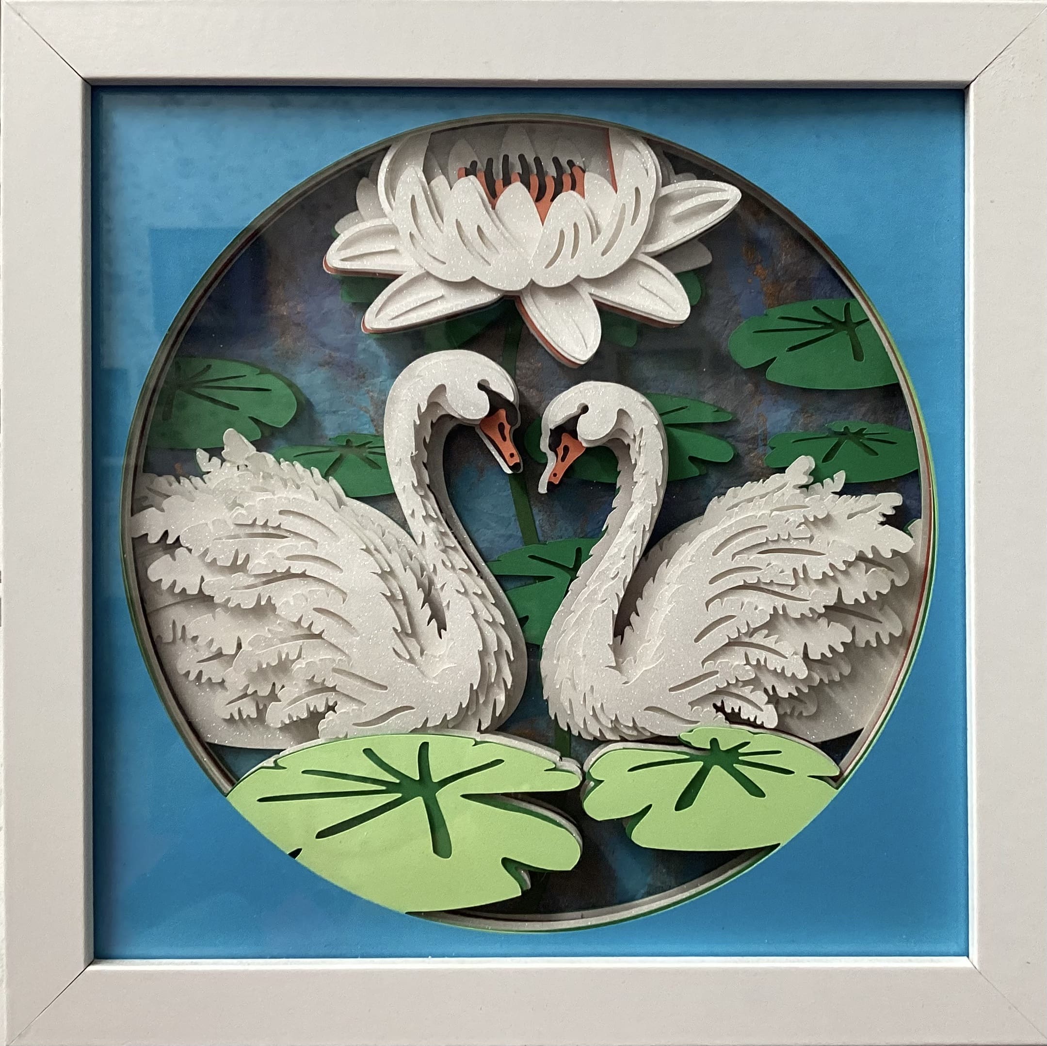 Each shadow box is handcrafted using precision paper cutting and detailed layering techniques. The textured feathers of the swans add dimension and realism, while the water lily above them brings balance and softness to the overall scene. Subtle color variations throughout the background enhance the handcrafted quality and create visual movement without overwhelming the design.