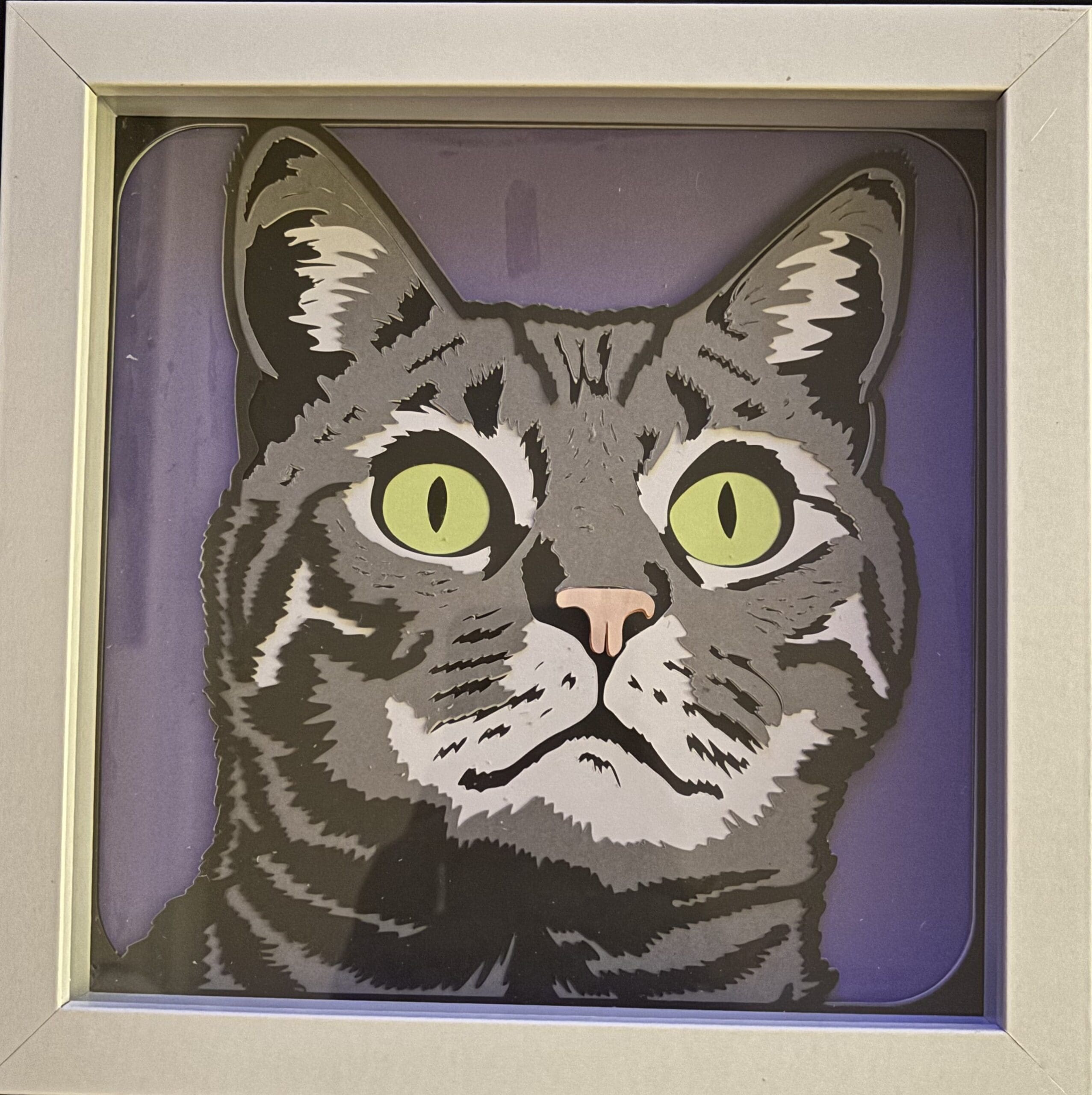 This handcrafted tabby cat shadow box features striking green eyes and layered paper depth that instantly draws attention. A bold yet elegant piece designed for cat lovers who want art that feels personal and timeless.
