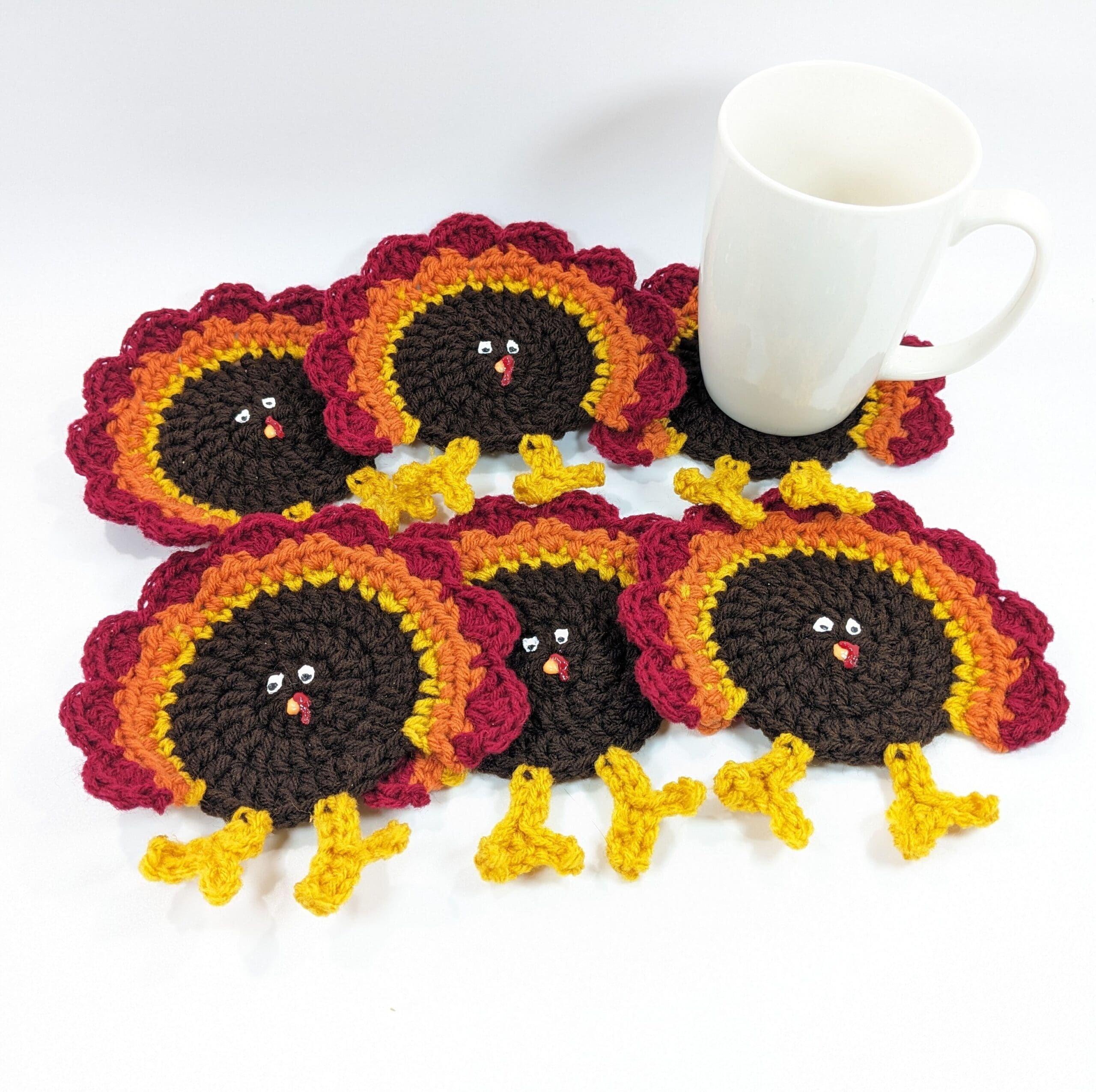 Also each Thanksgiving Turkey Coaster Set is hand crochet with acrylic yarn. I also used fabric paint for some details.
