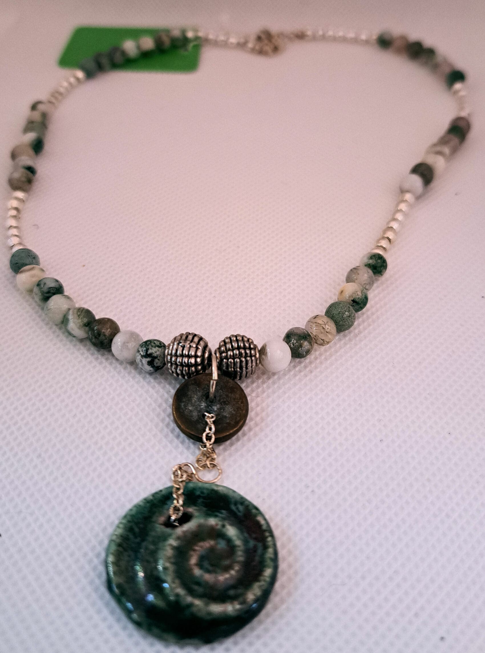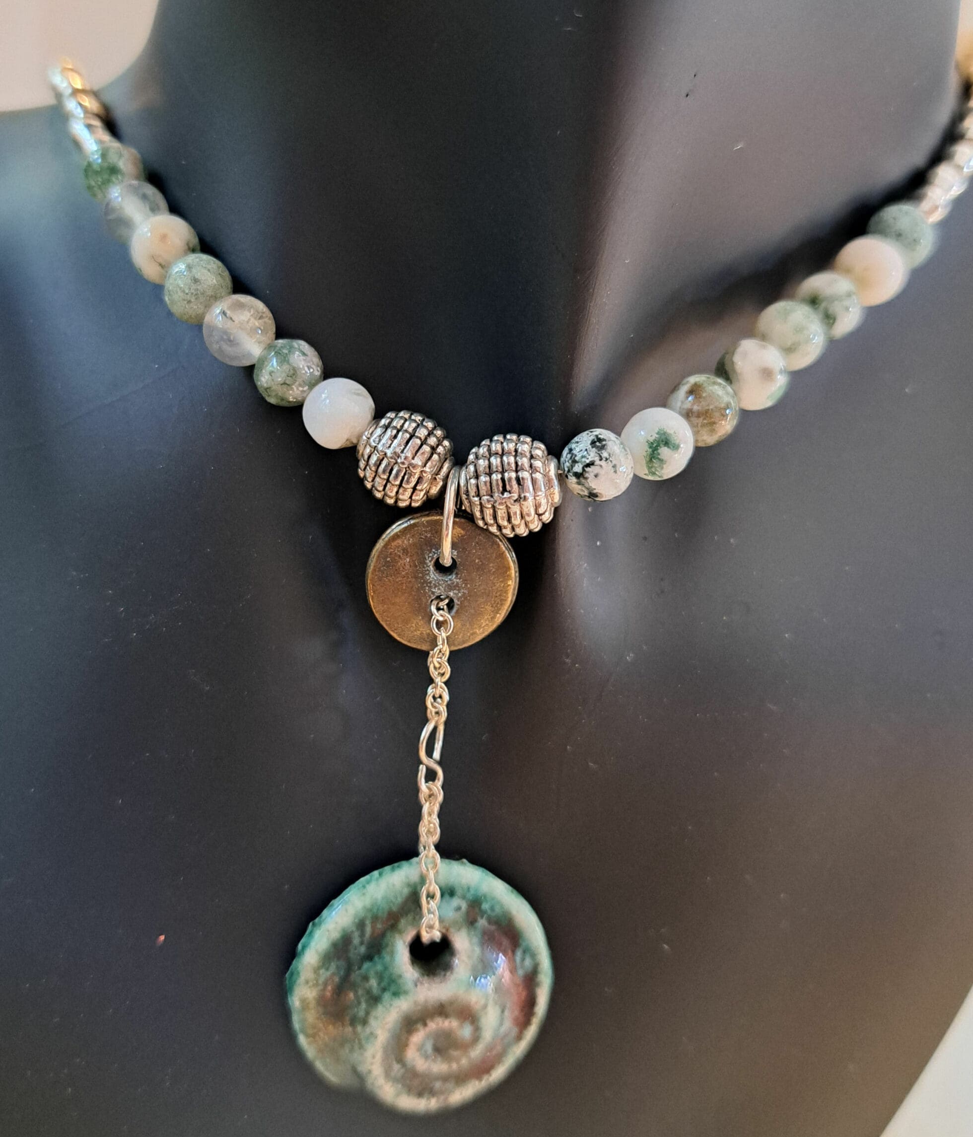Embrace the natural allure and artisanal craftsmanship of this handmade necklace—a tribute to the beauty of genuine tree agate, ceramic artistry, and sterling silver elegance, designed to complement your unique style with effortless grace.