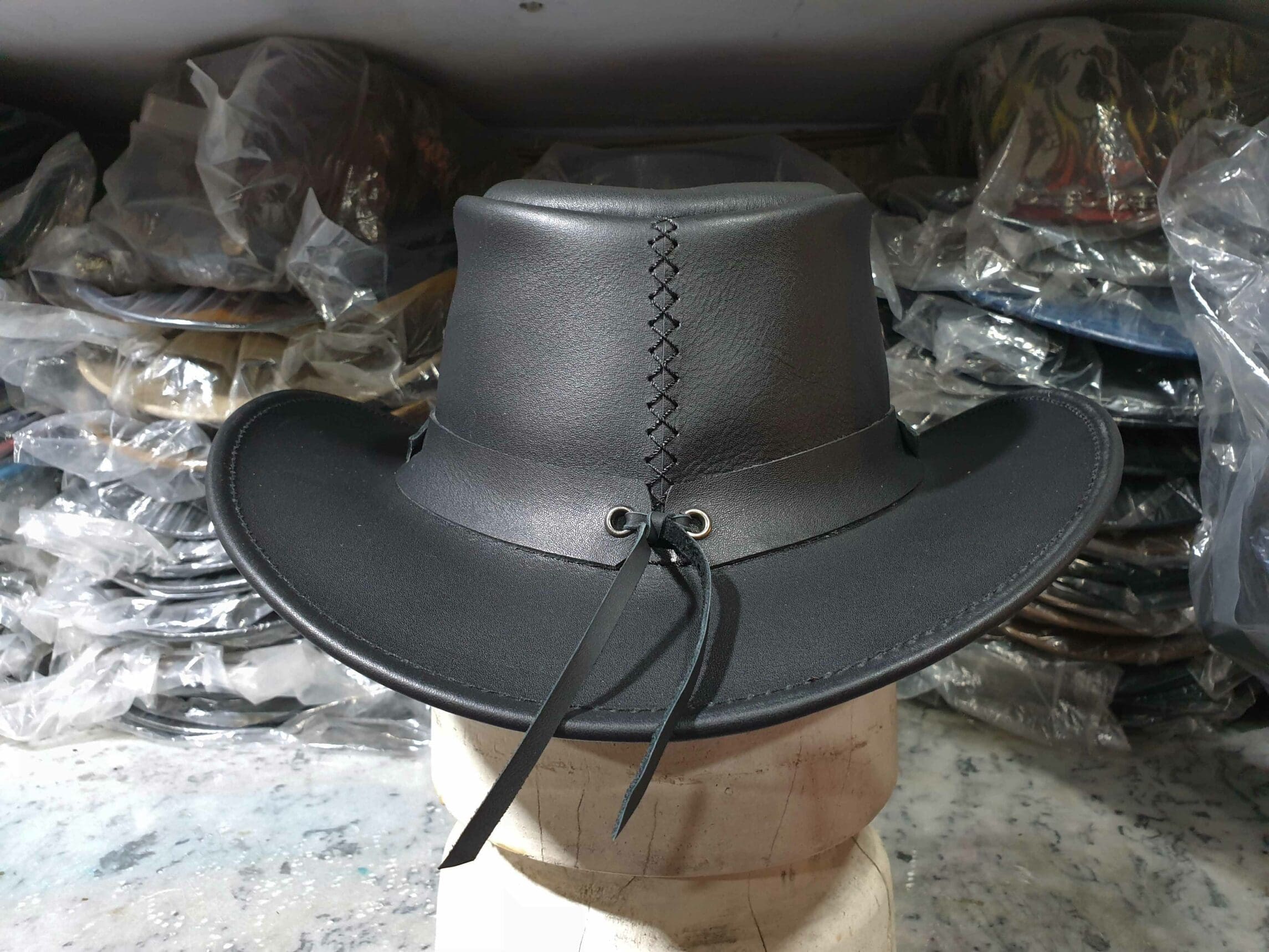 The hat is crafted from high-quality black leather, ensuring durability and a timeless look.
