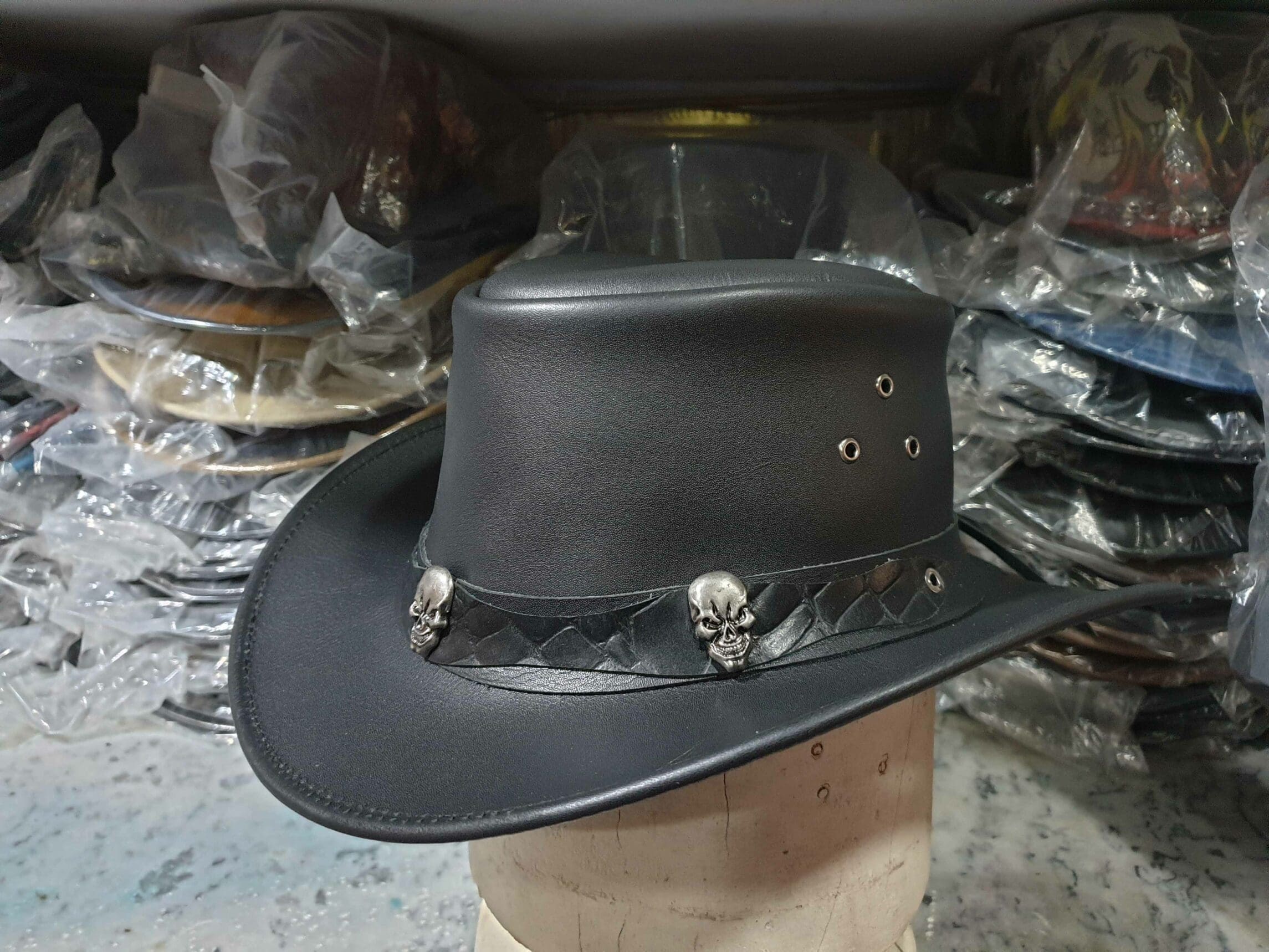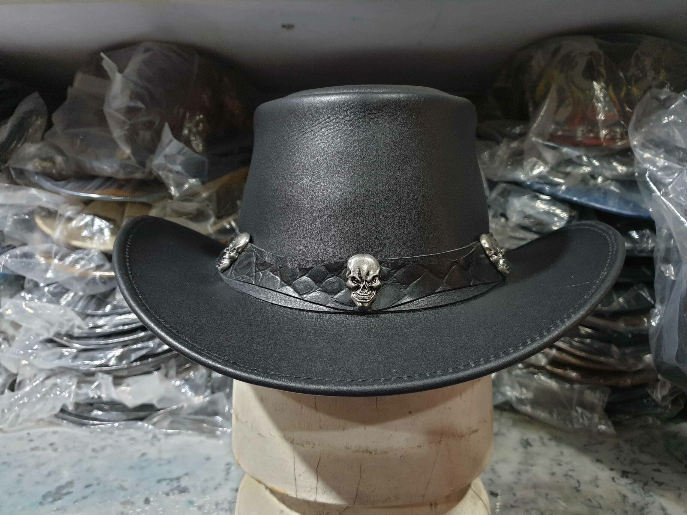 Whether you’re a cowboy at heart or just looking to make a fashion statement, the Cowboy Black Leather Hat with Tri Skull Rivets on Crocodile Textured Leather Patch on Hat Band is sure to turn heads and add a touch of rugged charm to your ensemble.