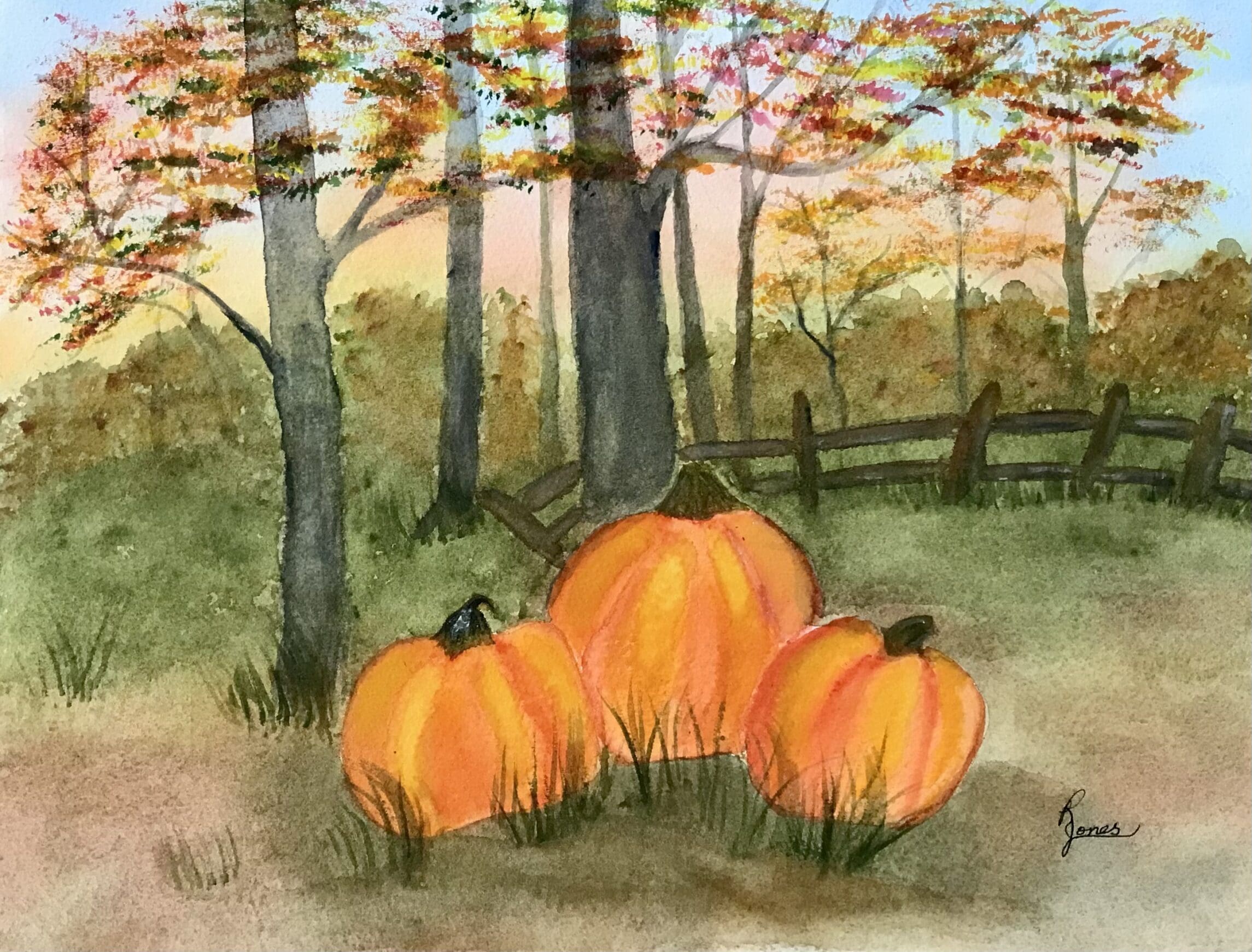 This artwork of Trio of Vibrant Pumpkins Watercolor painting presents a serene autumnal scene of three pumpkins just gathered at harvest time.