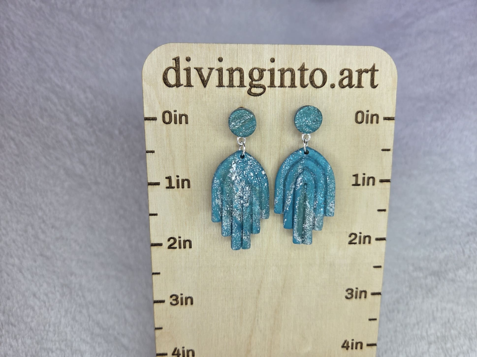 These handmade turquoise inspired dangle earrings are crafted from polymer clay and finished with a dusted silver shimmer that catches the light like polished stone. Available in three distinct styles, including a layered arch fringe, a concentric triangle drop, and an open teardrop hoop, each pair is shaped entirely by hand so no two are exactly alike. If you have been looking for a one-of-a-kind boho earring that feels as good as it looks, this is it.