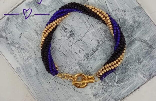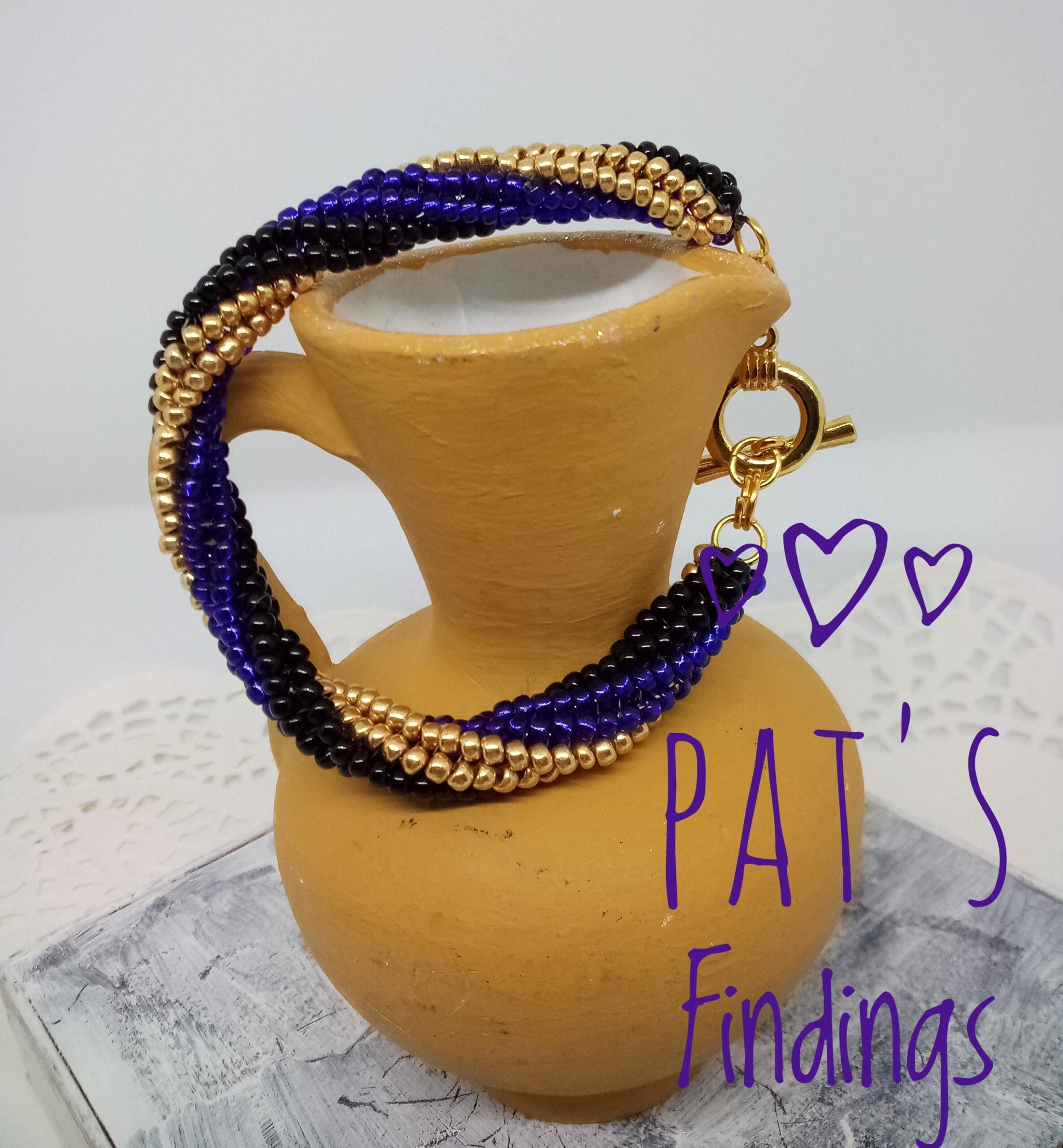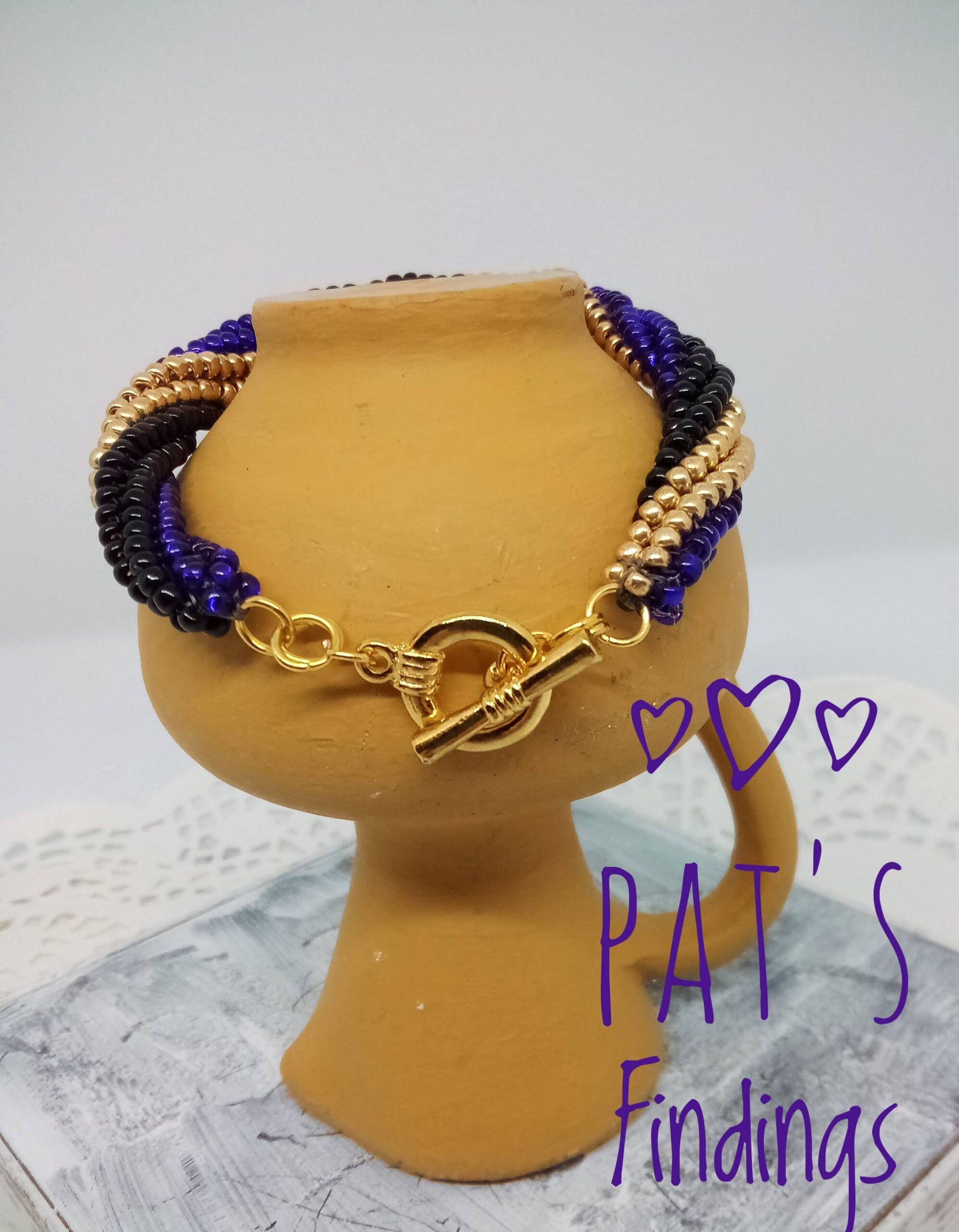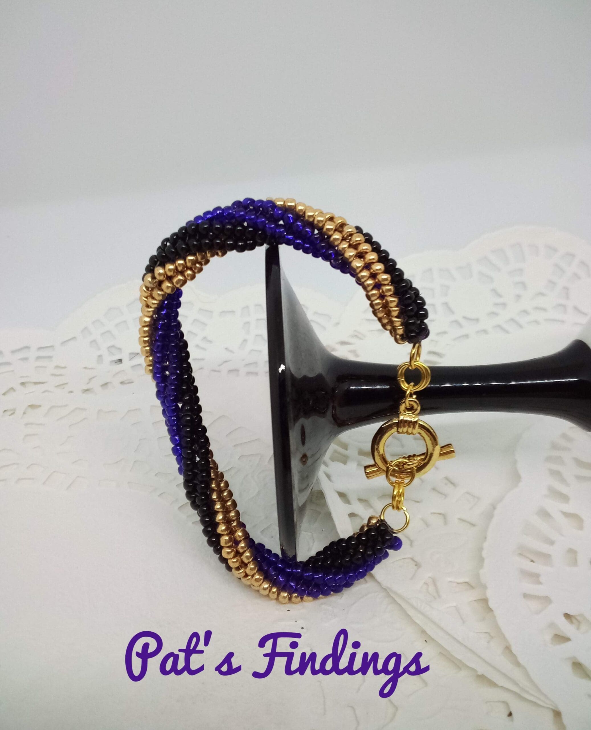 Handcrafted bracelet created with the twisted tubular herringbone technique, featuring three beautiful shades of glass size 8/0 seed beads. The bracelet measures approximately 7½ inches in length, including a secure gold toggle clasp, and is stitched with strong Fireline thread for lasting durability.