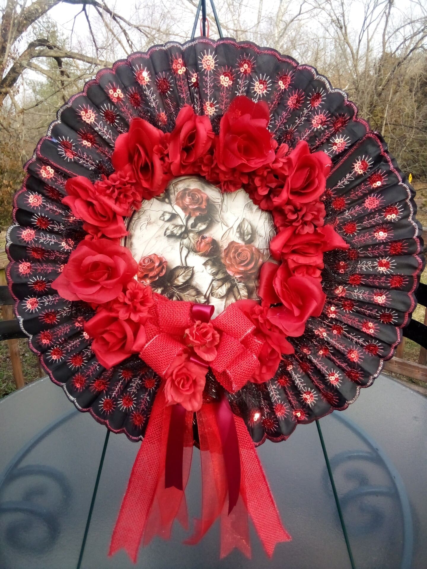 Created using decorative fans, faux red roses and red carnations, and ribbon for the bow. This wreath is recommended for use indoors or on a covered porch, patio, or deck.