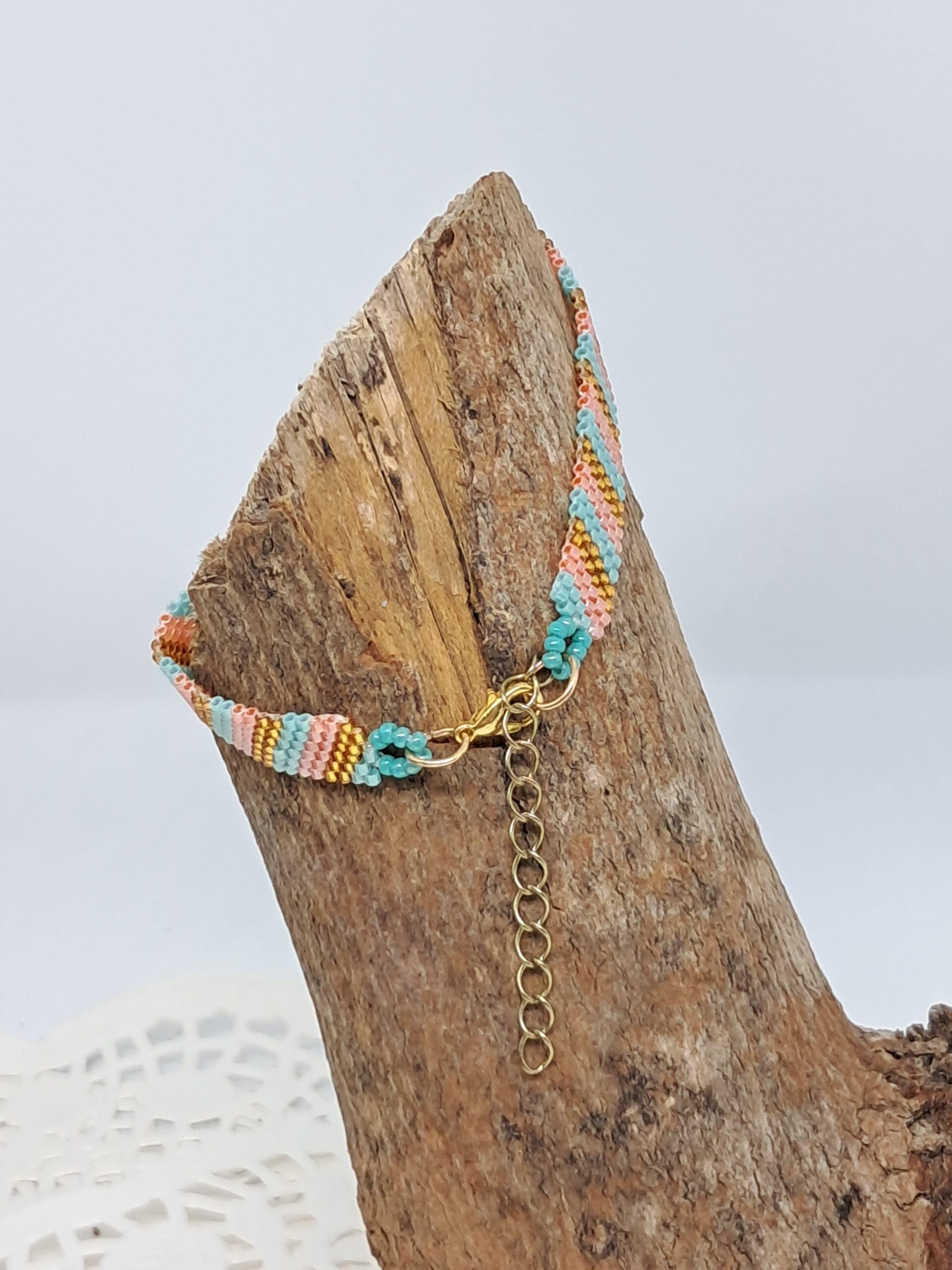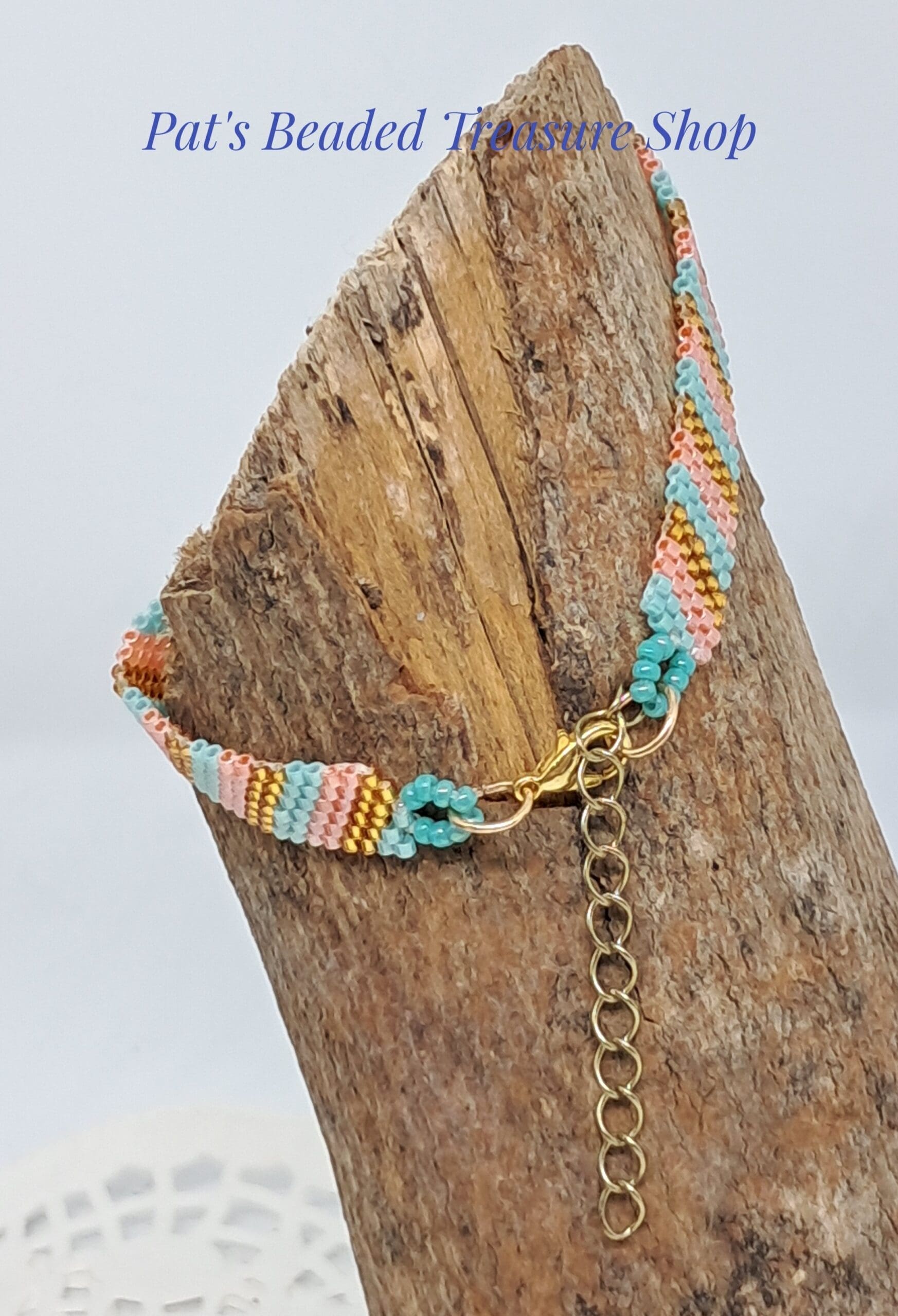 Add a pop of color and sparkle to your look with this unique handmade peyote stitch beaded bracelet. Featuring shimmering salmon, aqua, and marigold Delica beads with a secure gold clasp and safety chain, this unique boho bracelet is lightweight, comfortable, and one-of-a-kind. Will fit 7 inch wrist