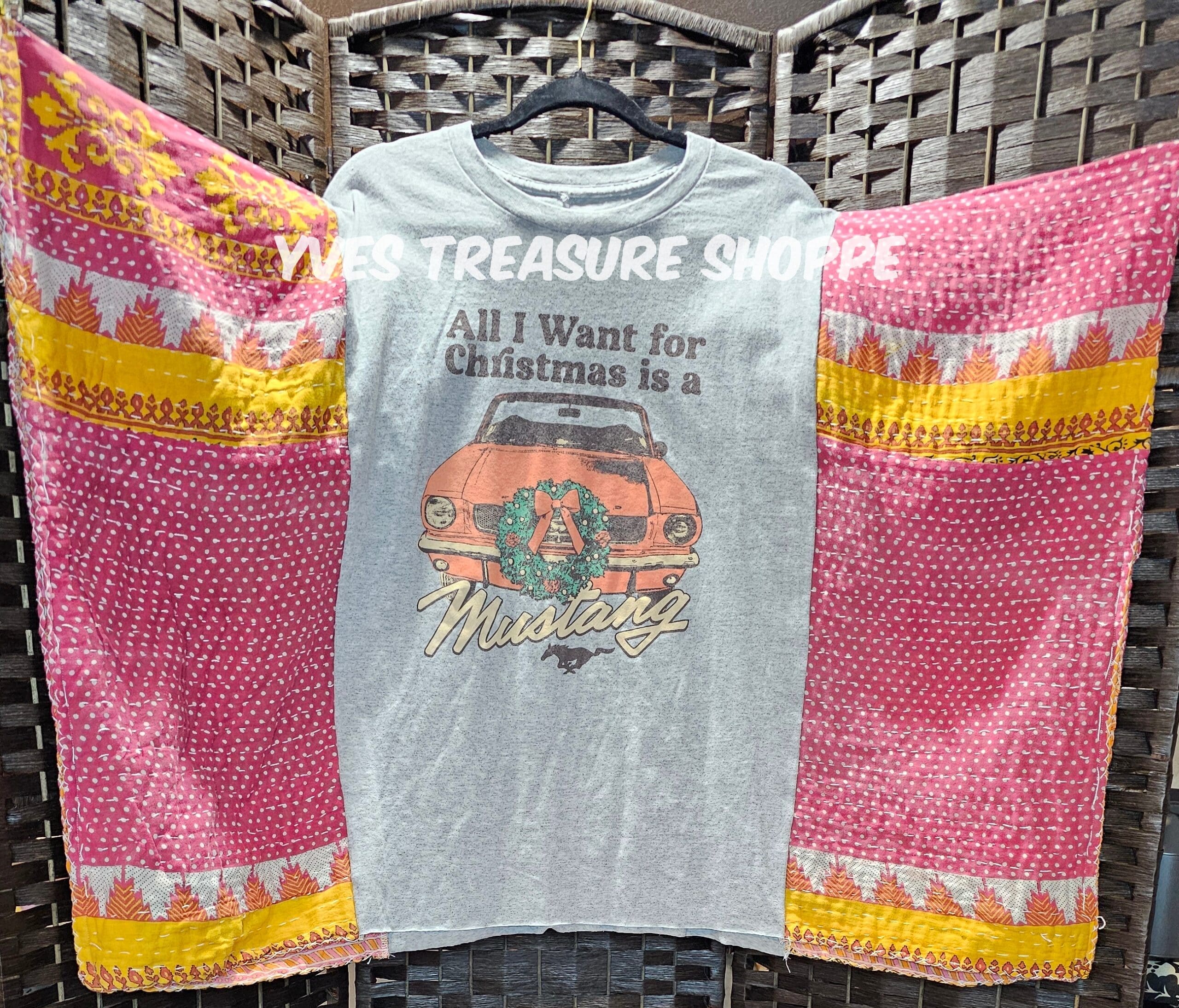 One Size. This Poncho top is made with a new refashioned Large Mustang t-shirt and a vintage kantha quilt. 42 inches across. 27 inches from top to bottom. Sides are sewn partway up, to be able to be worn as a top. Perfect for making that fashion statement.