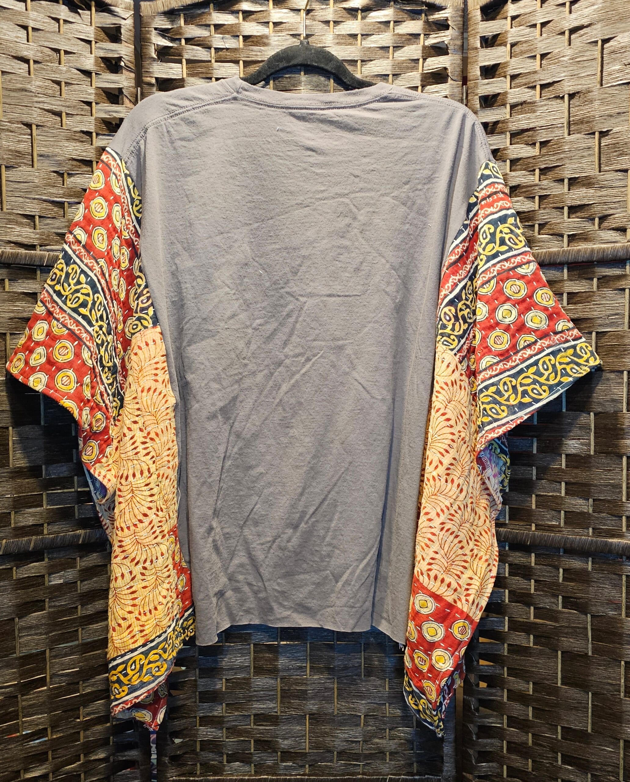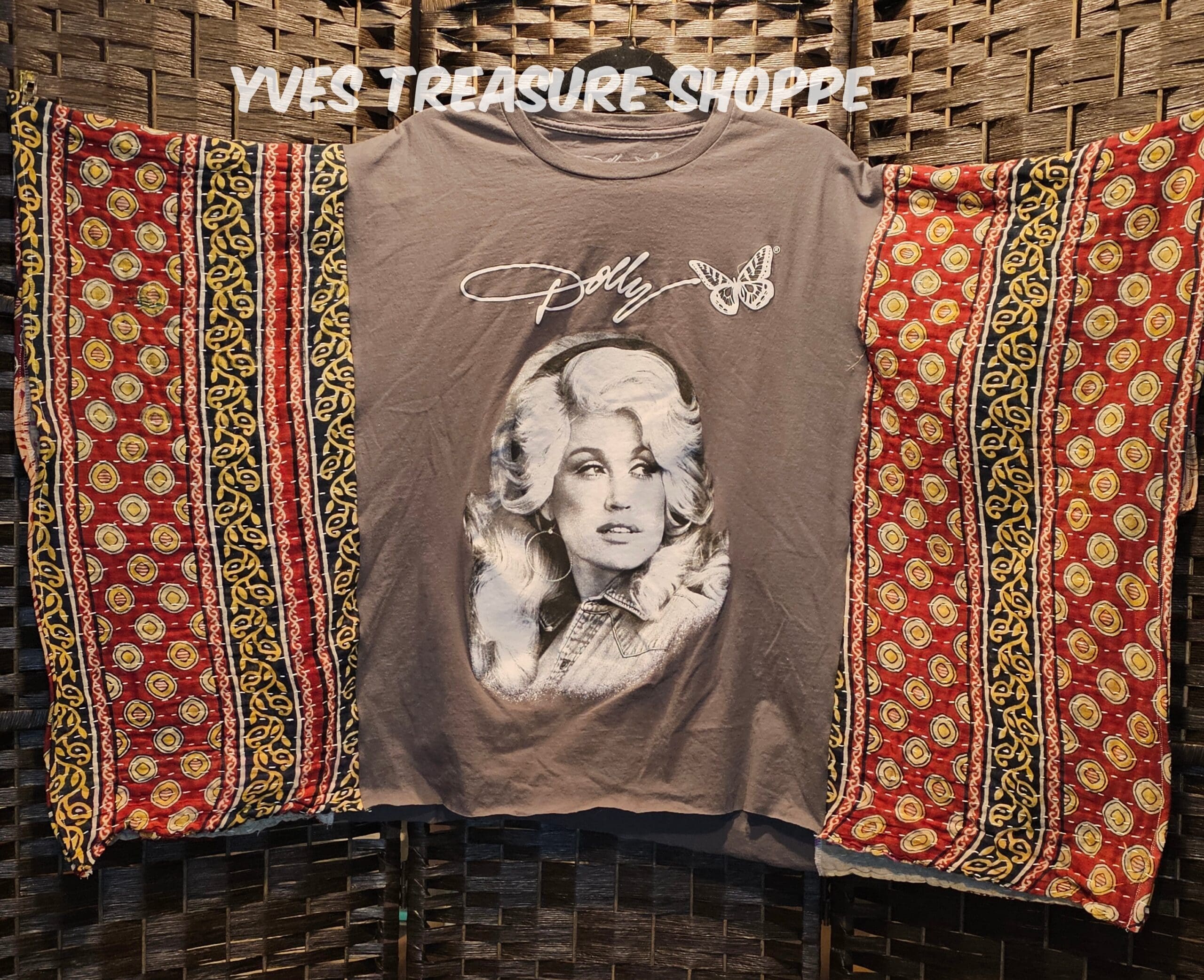 One Size. This Poncho top is made with a New XLarge Dolly concert t-shirt and a vintage kantha quilt. 42.5 inches across. 22 inches from top to bottom. Sides are sewn partway up, to be able to be worn as a top. Perfect for making that fashion statement.